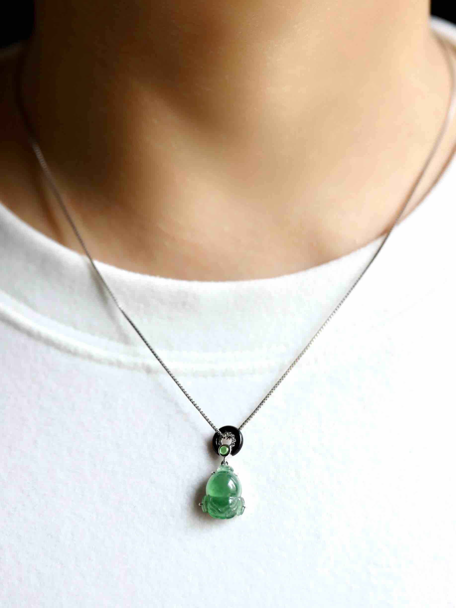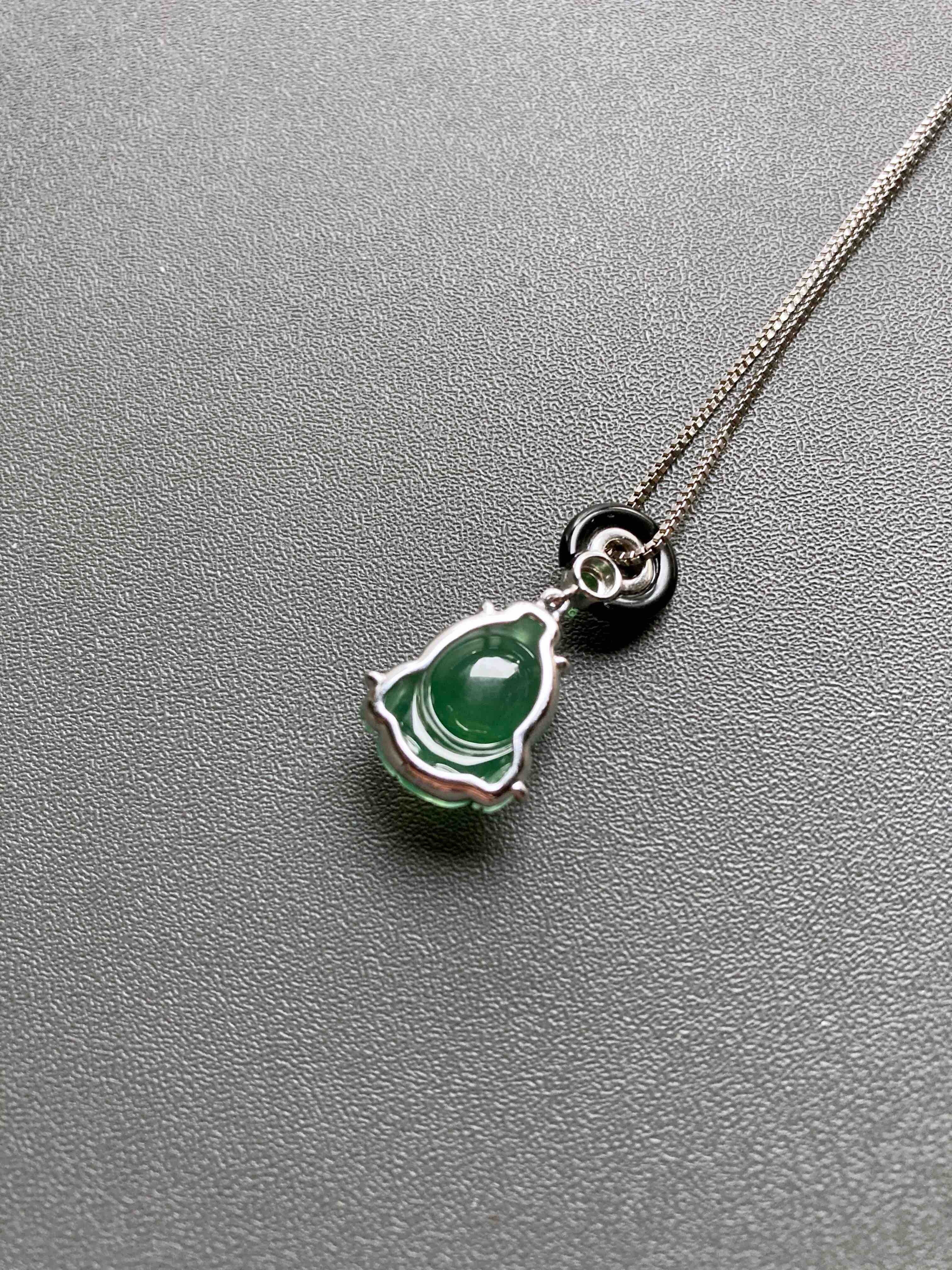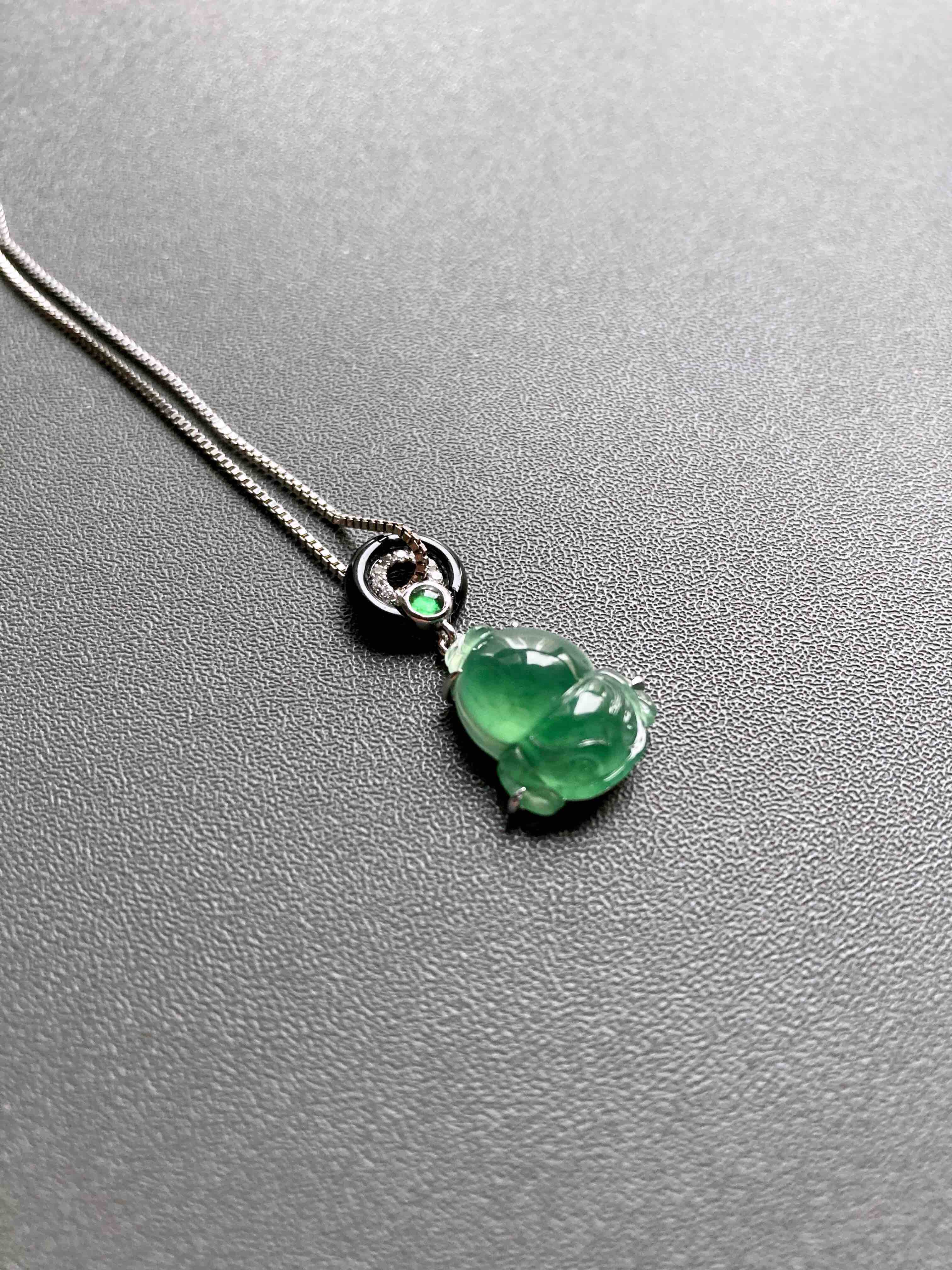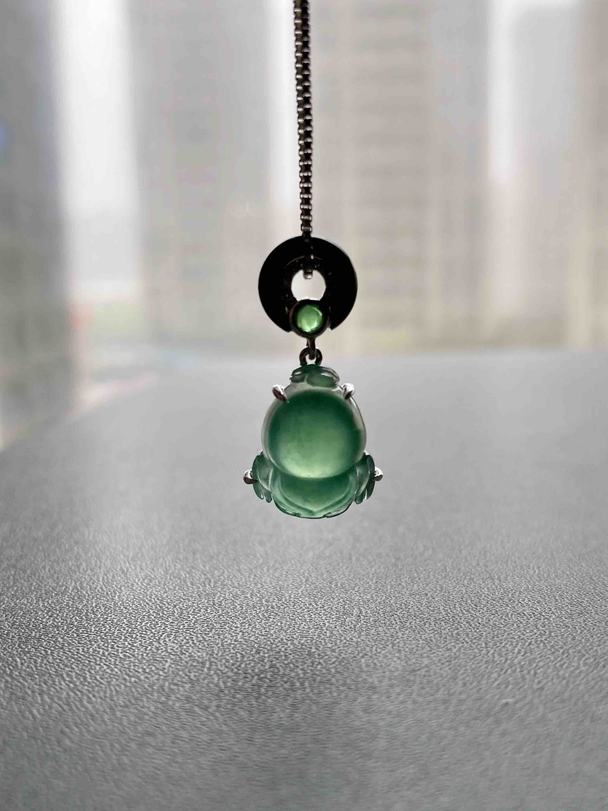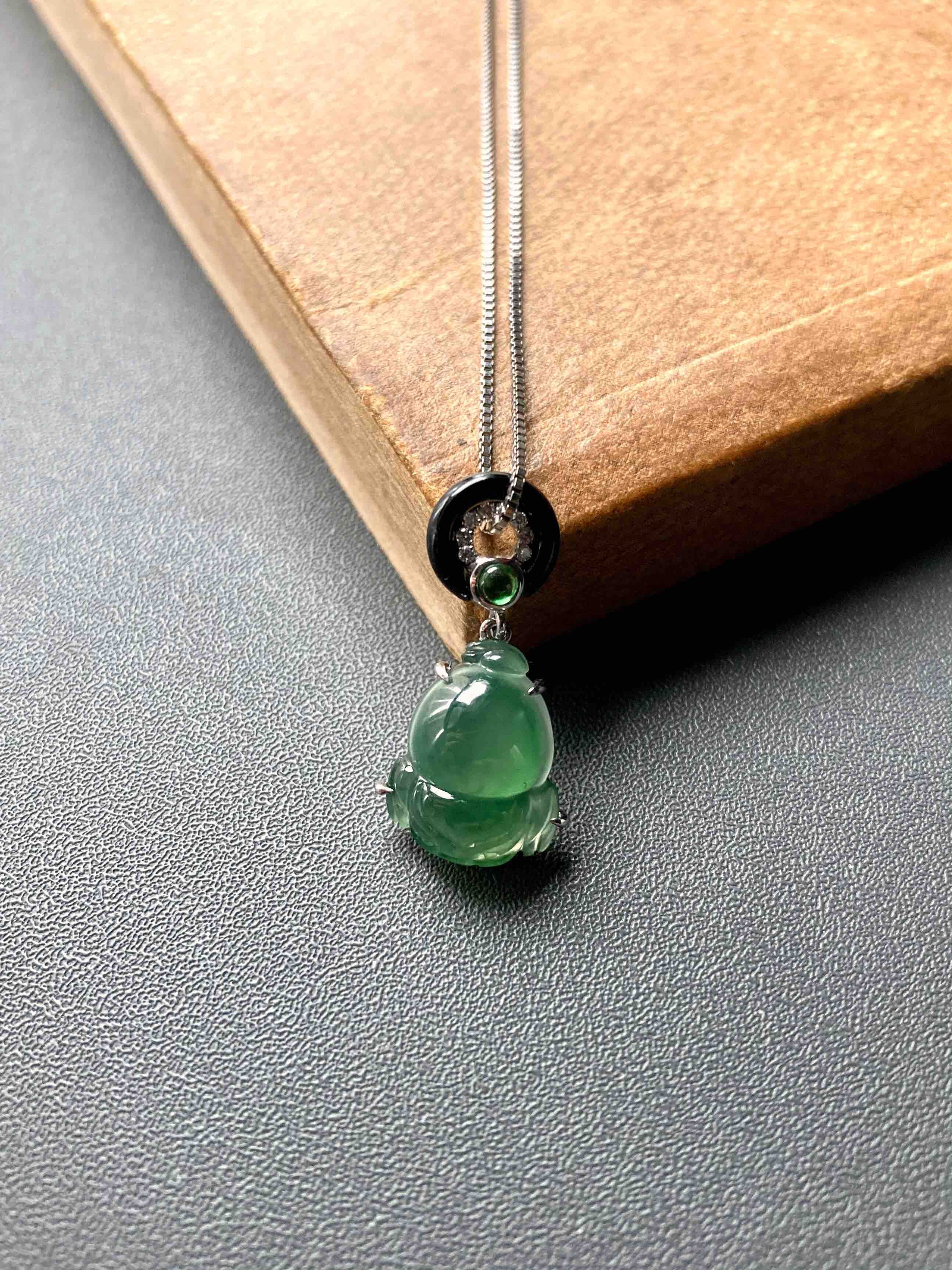 稀有品,市面上非常少见的厚庄高冰种湖水绿,深邃的颜色近乎蓝水,荧光四射,简直是一个光球,雕刻的是三足金蟾,金蟾14.1×11.2×5.8mm,镶嵌后25.3×12.8×6.2mm,镶嵌设计也是超特别,18k白金钻石黑玛瑙镶嵌,别具一格,实在太好看啦,值得收藏的标本级精品
