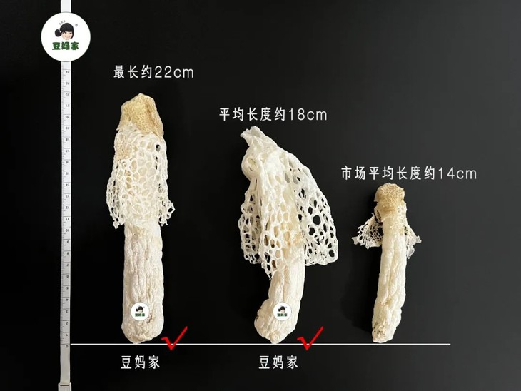 豆妈家商城在售的织金红托短裙竹荪,都是按照参加艺考标准筛选出来的雪裙仙子。(其平均长度达到了18厘米,远超普通竹荪)