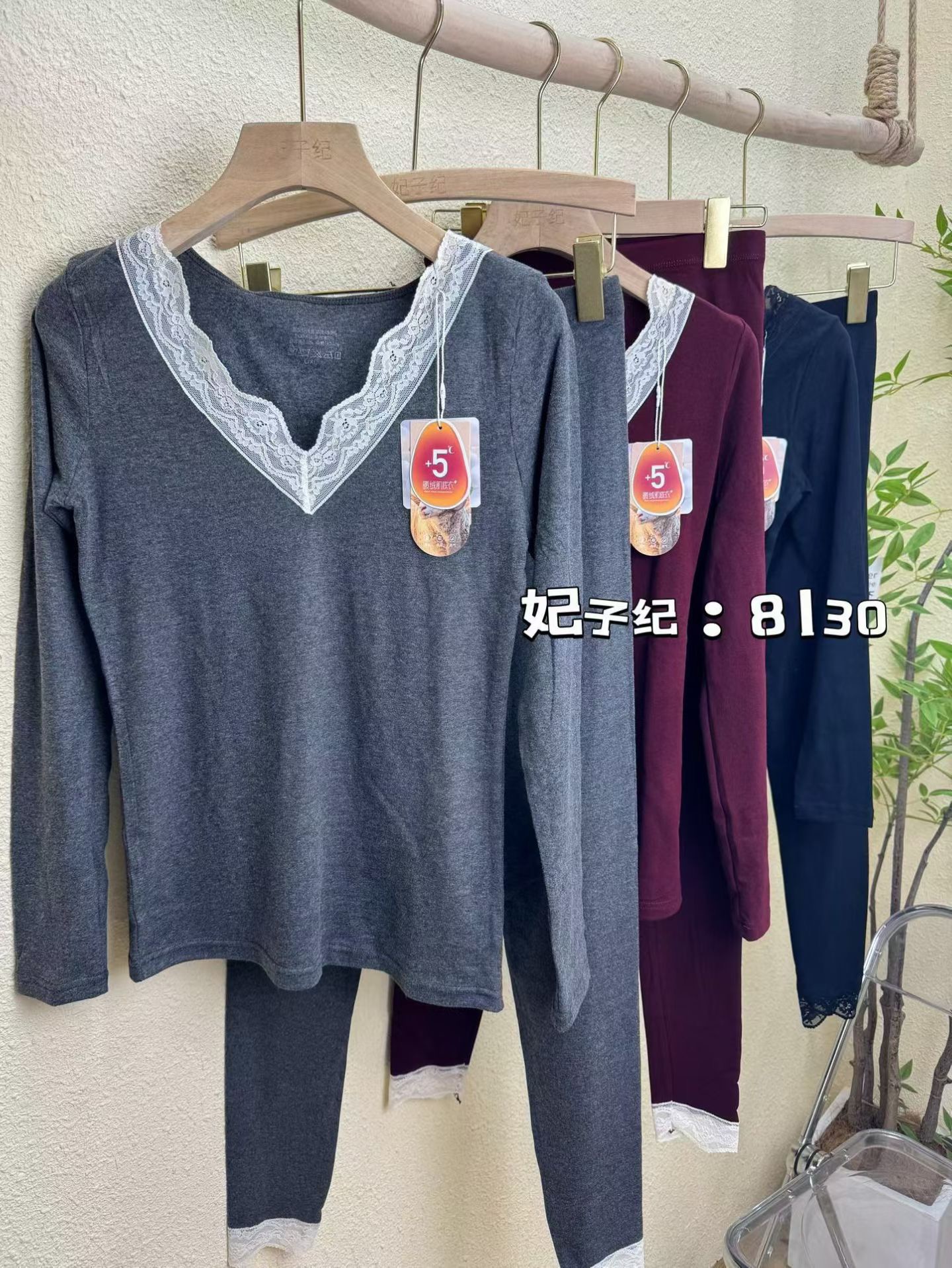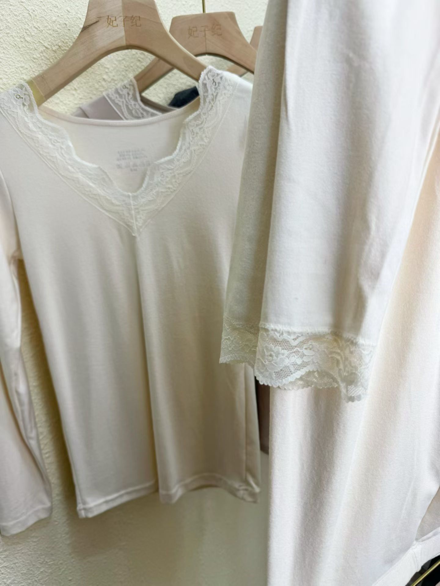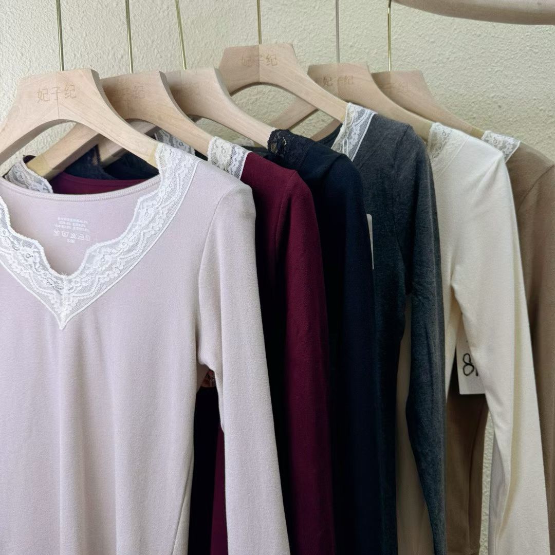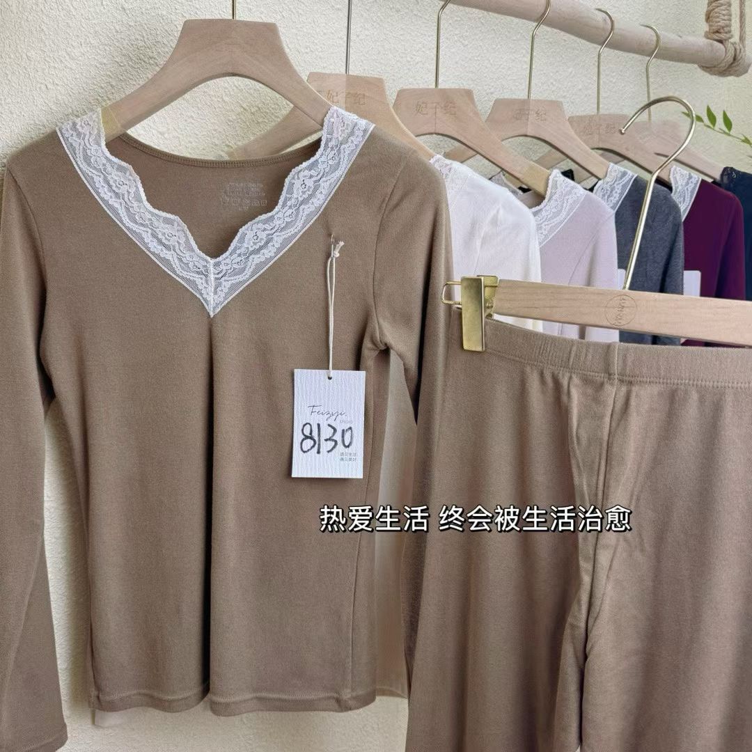 D112725羊毛蚕丝洋气V领蕾丝花边领口保暖内衣套装