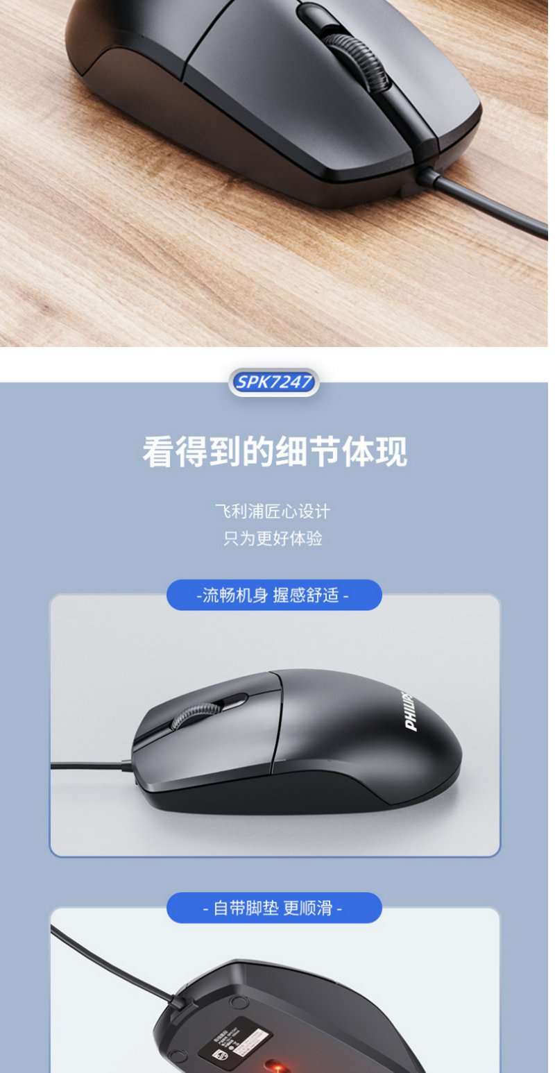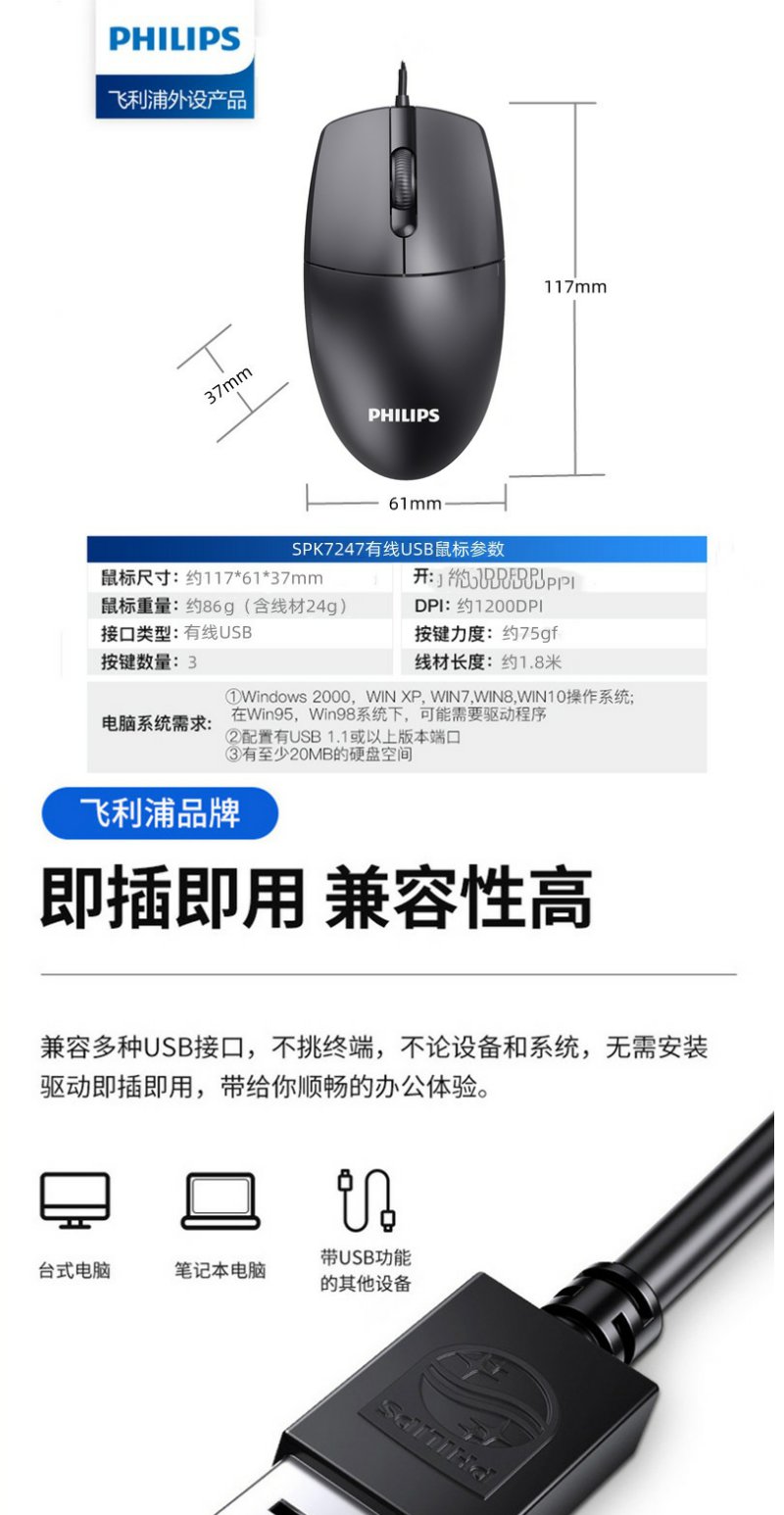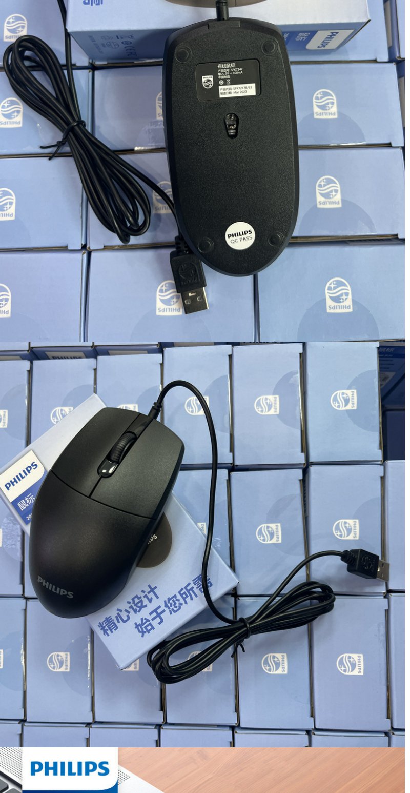 飞利浦SPK7247有线USB鼠标商务电脑台式笔记本2.4G无线鼠标 1.8米*1