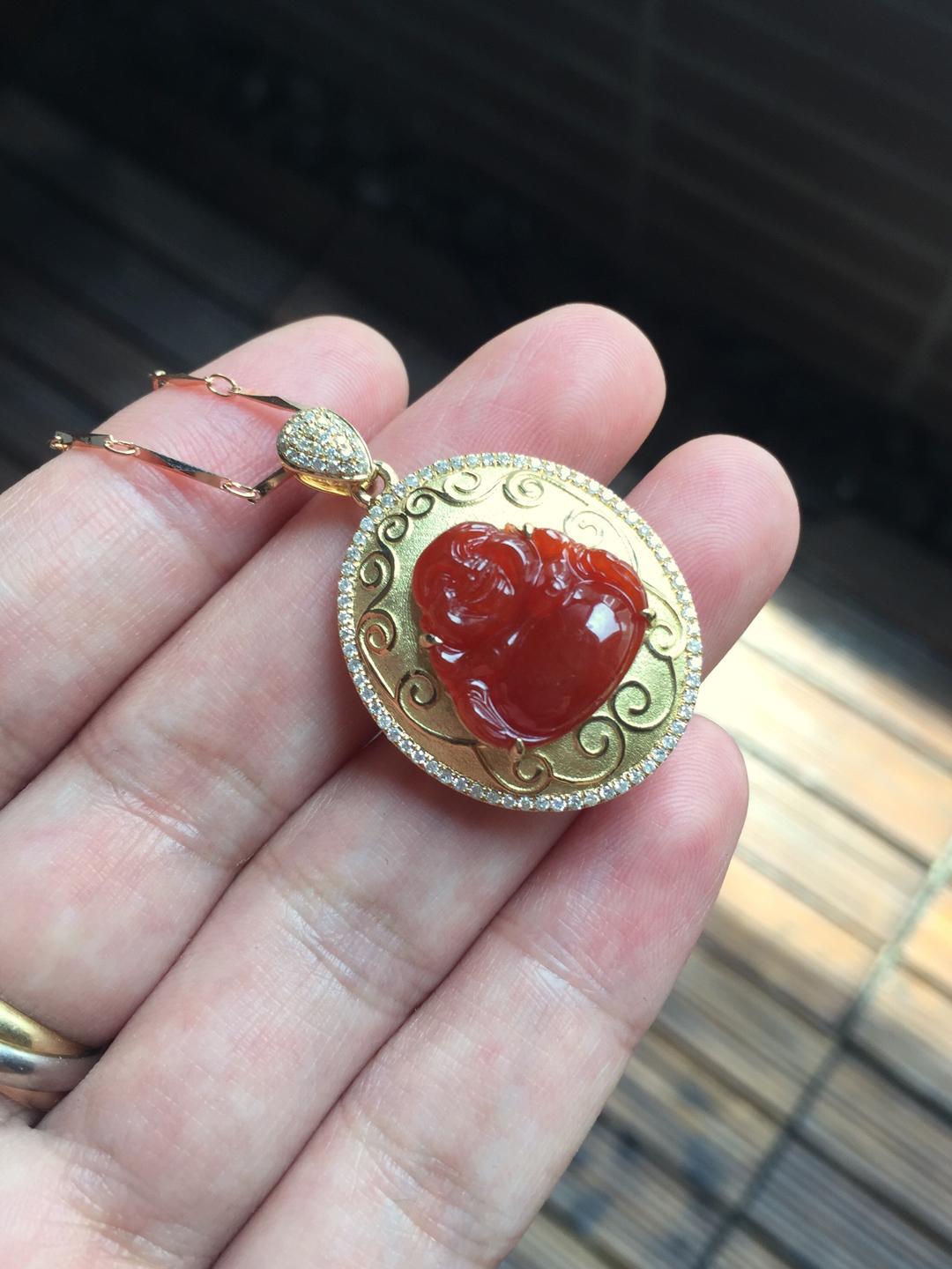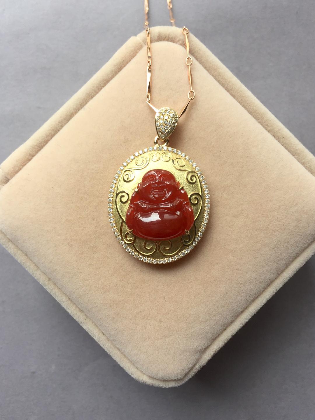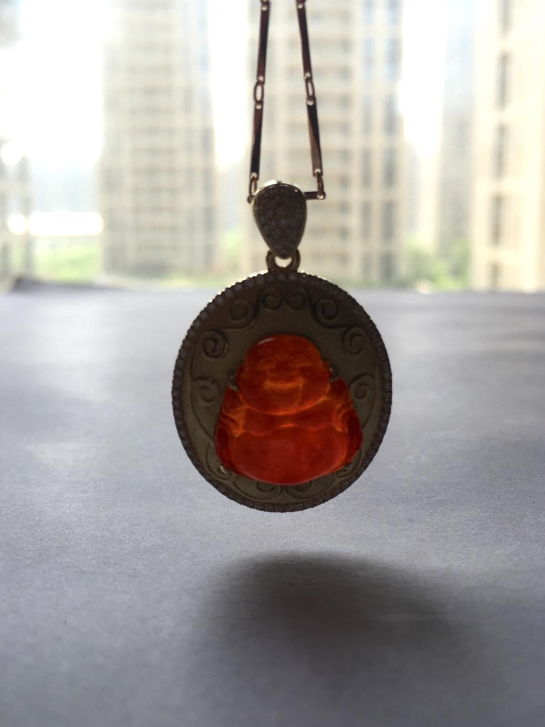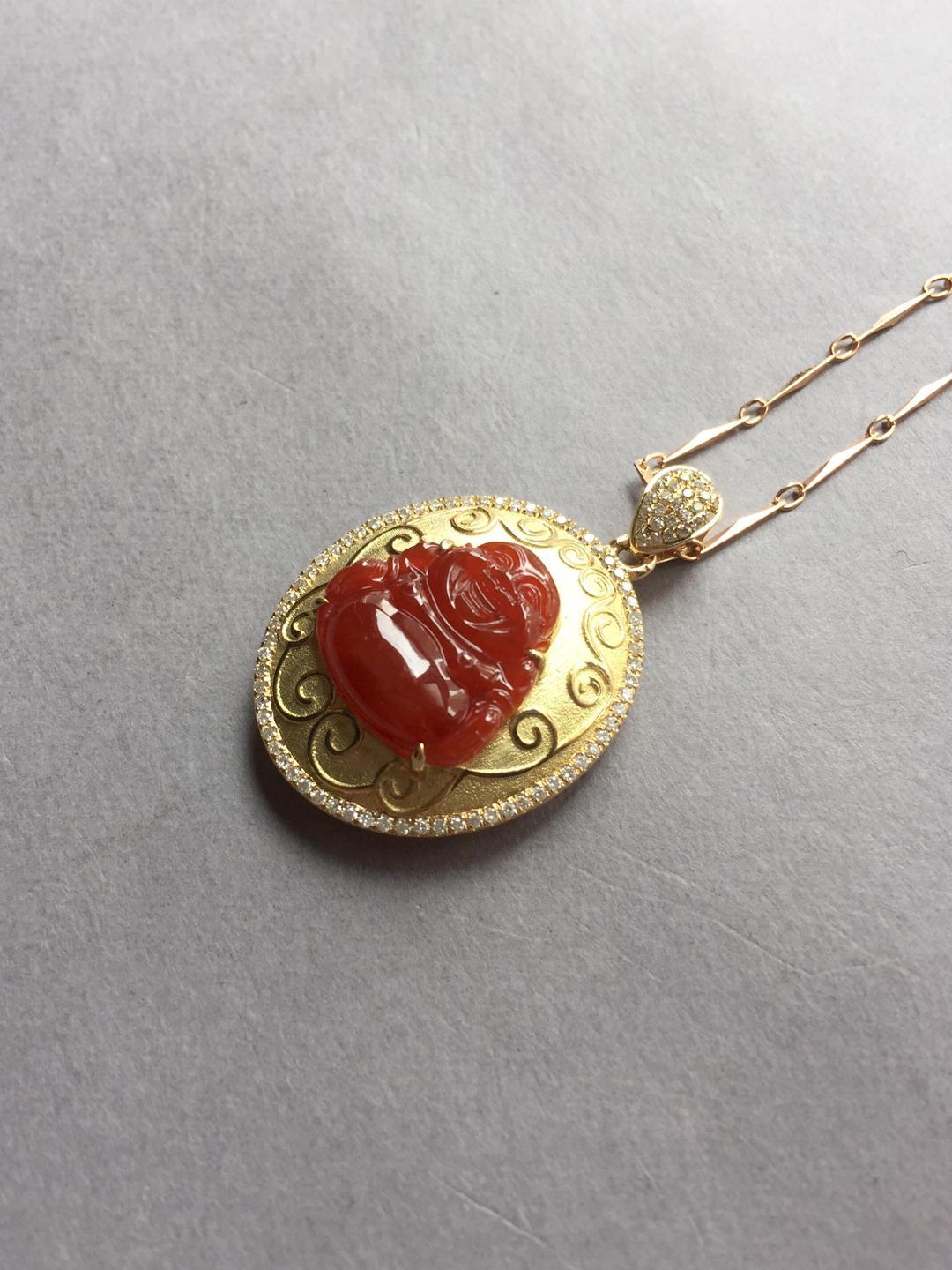 翡翠冰种红翡弥勒佛,15.9*15.5*4mm,镶嵌后35.8*23.7*10mm。世界上有一种红叫做不用PS的红,真正的红翡魅力,热情似火,手机拍拍秒杀网上的仙图。种色俱佳的宝贝,手工精雕。镶嵌一定要好好介绍一下,民族风款式设计,充满了雕塑感,融合了18k黄金,玫瑰金,工艺了得,外围一圈钻石华丽夺目,单单镶嵌成本就3000多了,每一分投入用在宝贝上,赢得的就是你戴出去众人赞许的目光。特色精品推荐