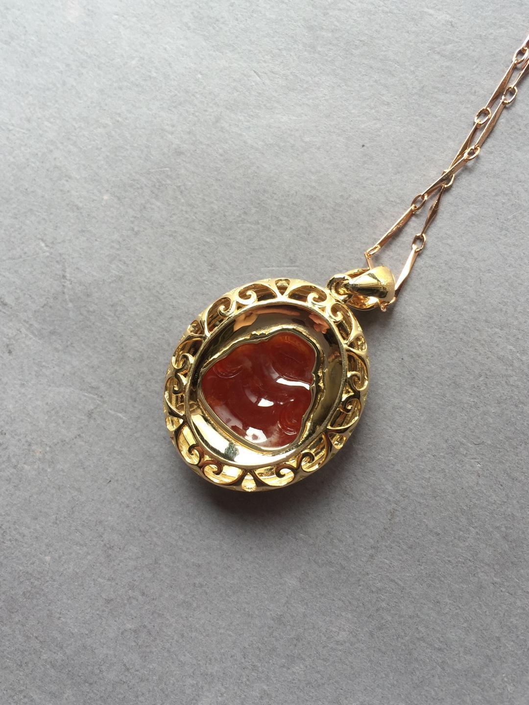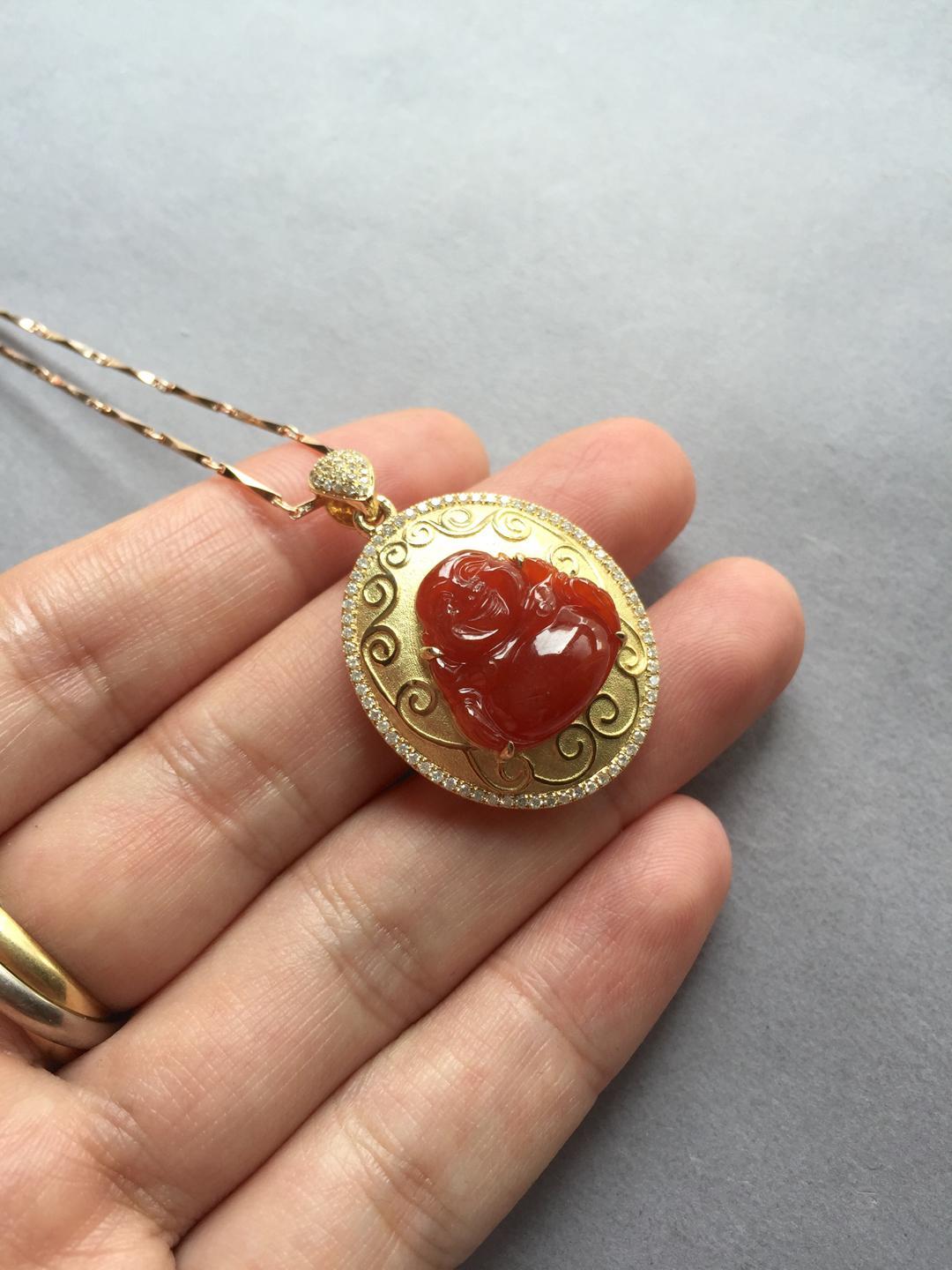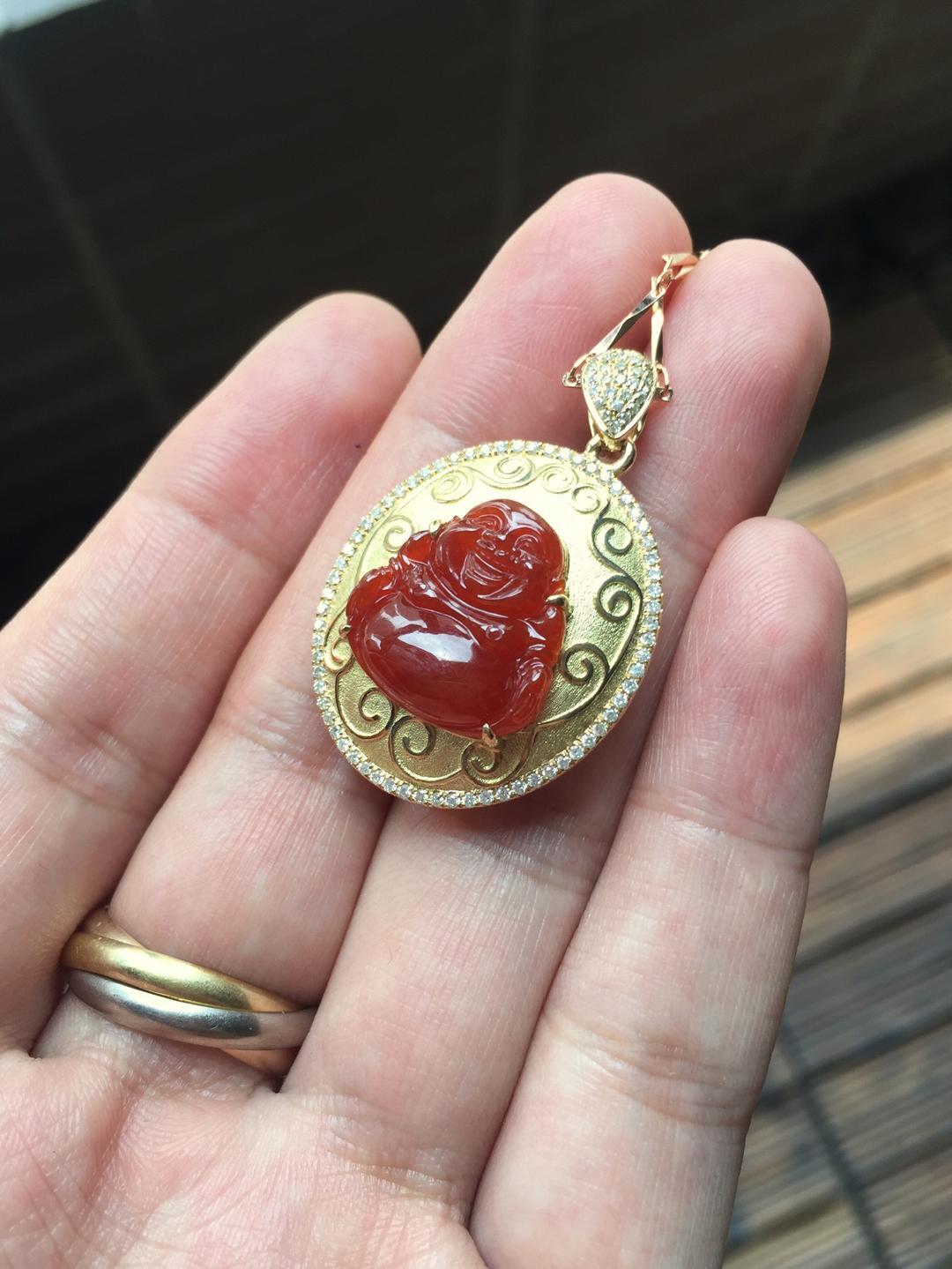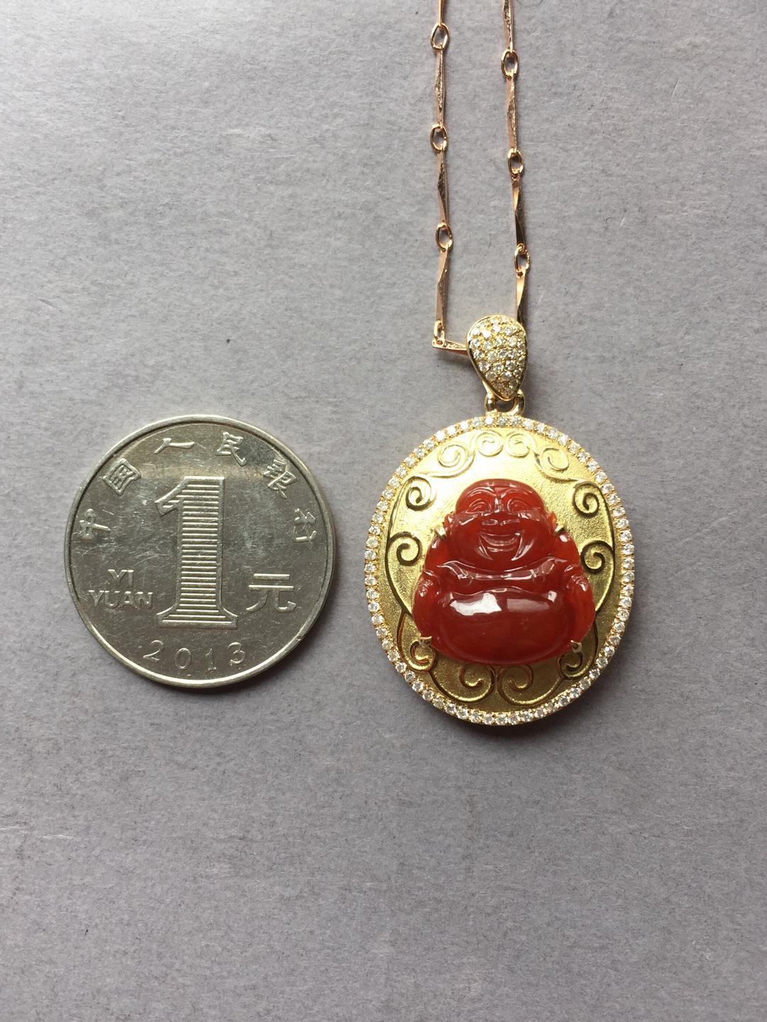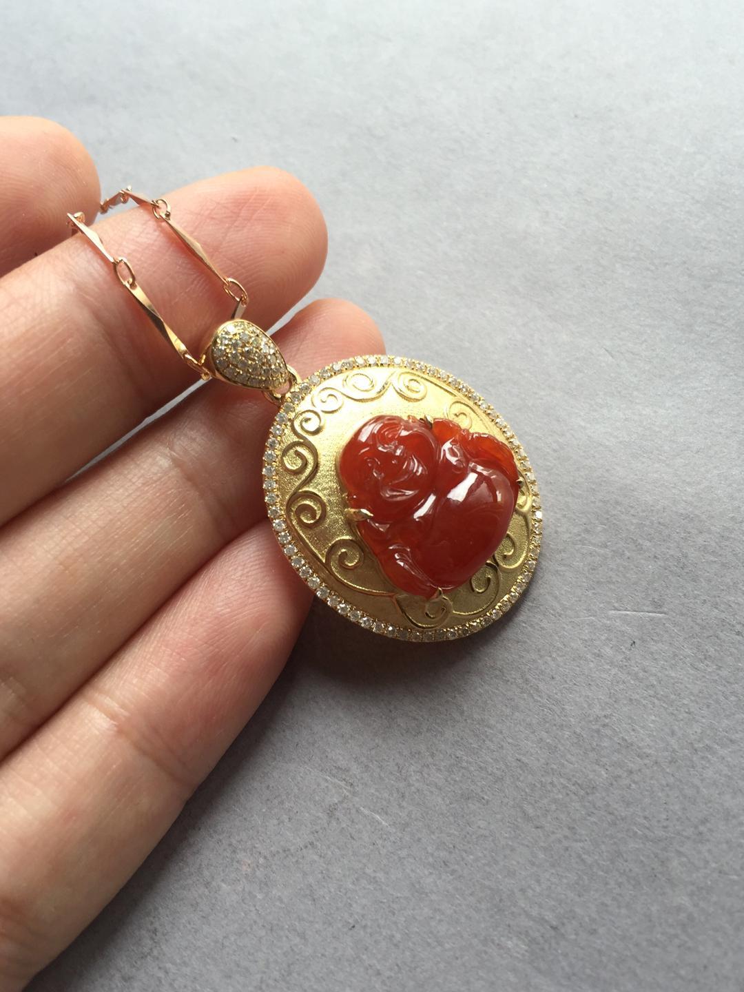 翡翠冰种红翡弥勒佛,15.9*15.5*4mm,镶嵌后35.8*23.7*10mm。世界上有一种红叫做不用PS的红,真正的红翡魅力,热情似火,手机拍拍秒杀网上的仙图。种色俱佳的宝贝,手工精雕。镶嵌一定要好好介绍一下,民族风款式设计,充满了雕塑感,融合了18k黄金,玫瑰金,工艺了得,外围一圈钻石华丽夺目,单单镶嵌成本就3000多了,每一分投入用在宝贝上,赢得的就是你戴出去众人赞许的目光。特色精品推荐