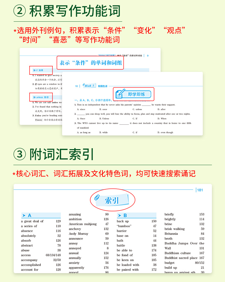 6. 积累写作功能词:每周五的词汇拓展包括表示“条件”“变化"“观点”“区分和对比”“位置”“因果"等的单词和词组,附有外刊例句和针对性练习
