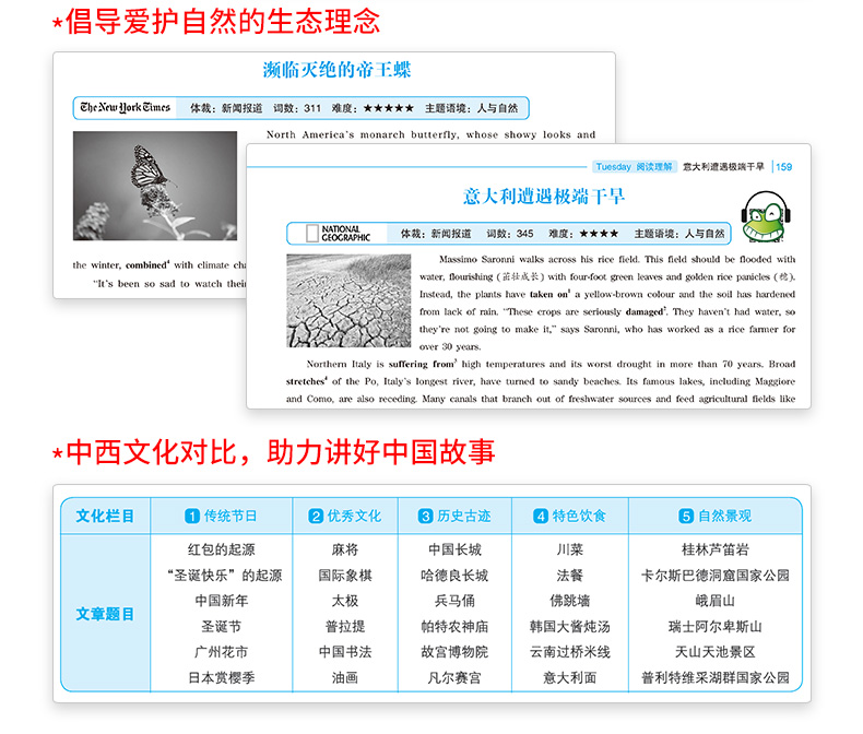 7. 特设文化栏目,用地道英语学习中外文化,囊括“传统节日”“优秀文化”“历史古迹”“特色饮食”和“自然景观”五大主题