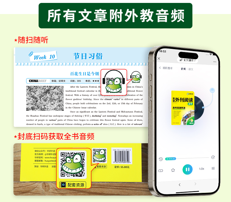 8. 配套音频,附词汇索引:所有文章均提供外教朗读音频,可扫描内页对应的二维码获取,也可在封底扫码下载;词汇部分均附有索引,按英文首字母排序,方便快速搜索和诵记