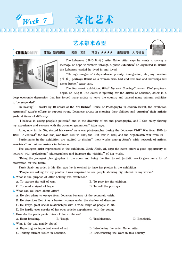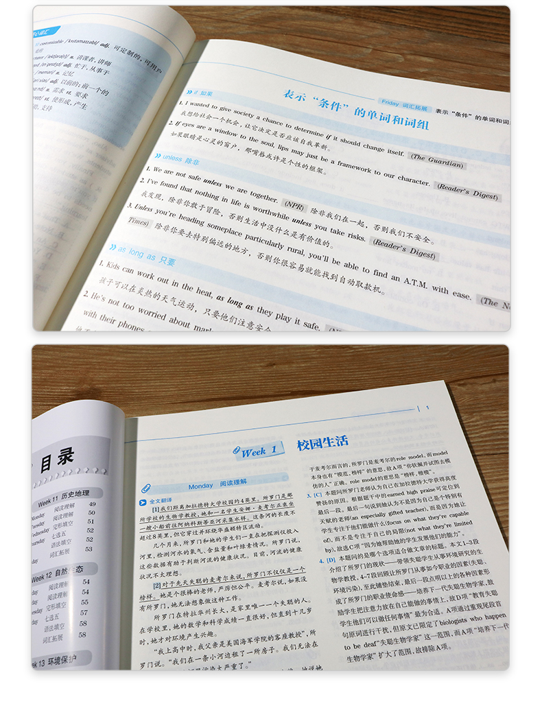 3. 分周编排,计划性强:全书共分为15周,每周分设七天,包括周一至周四的阅读训练,周五的词汇拓展,以及周六、周日的文化栏目
