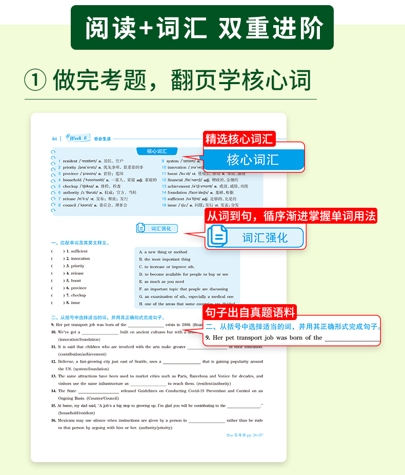 5. 阅读词汇双重进阶:从阅读文章提取核心词汇,附有针对性的释义练习和真题句子语境练习,提升阅读同时能扩充词汇量