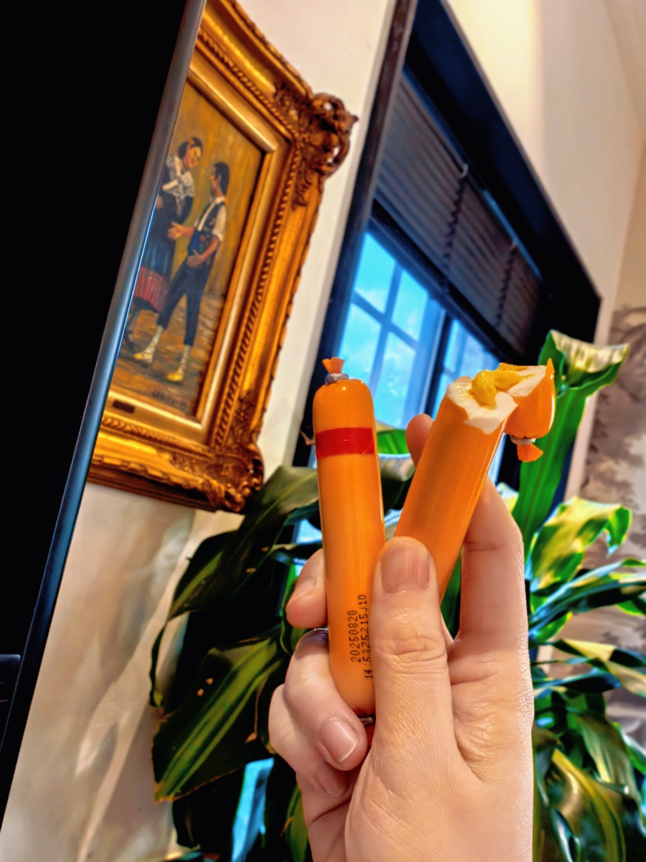 鳕鱼肠是可爱的长条纸盒包装,拎出一根撕掉包装,轻轻一口咬下,包裹在鳕鱼肉里的奶酪酱就瞬间爆浆,浓郁醇厚的奶香与深海鳕鱼的鲜甜在口腔中完美交融,双重风味层层递进,口感丰富又有层次,挑食的小宝宝都会被这一口征服!当然,大朋友更是可以吃吃了,夹面包搭米面,都是营养加分!