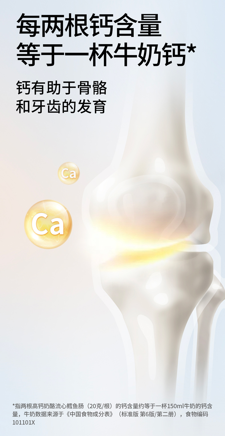 更令人惊喜的是它的创新流心,肠肠里注入奶酪博士自主研发的高钙奶酪酱,添加量≥10%,每一口都能吃到满满的“奶黄金”。奶酪的营养价值远超牛奶,不仅含有更高含量的原生乳钙,助力骨骼与牙齿健康,还富含优质乳蛋白,为身体补充满满能量,让美味与营养实现双重升级。