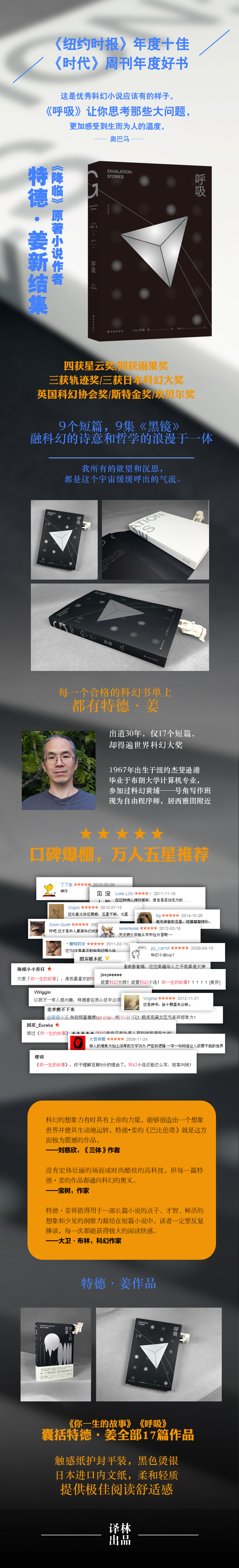 特德·姜将值得用于一部长篇小说的点子、才智、鲜活的想象和少见的洞察力凝结在短篇小说中。读者一定要反复捧读,每一次都能获得极大的阅读快感。
