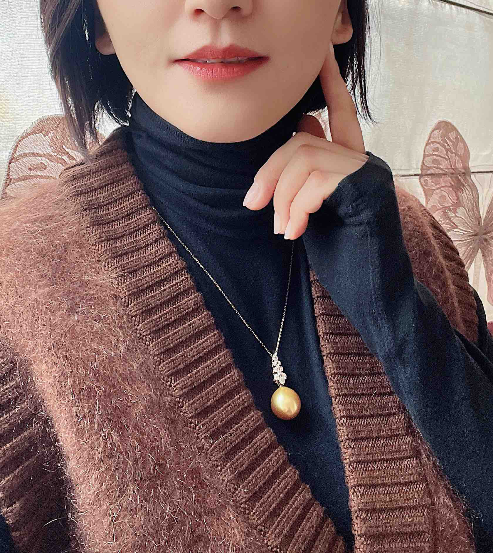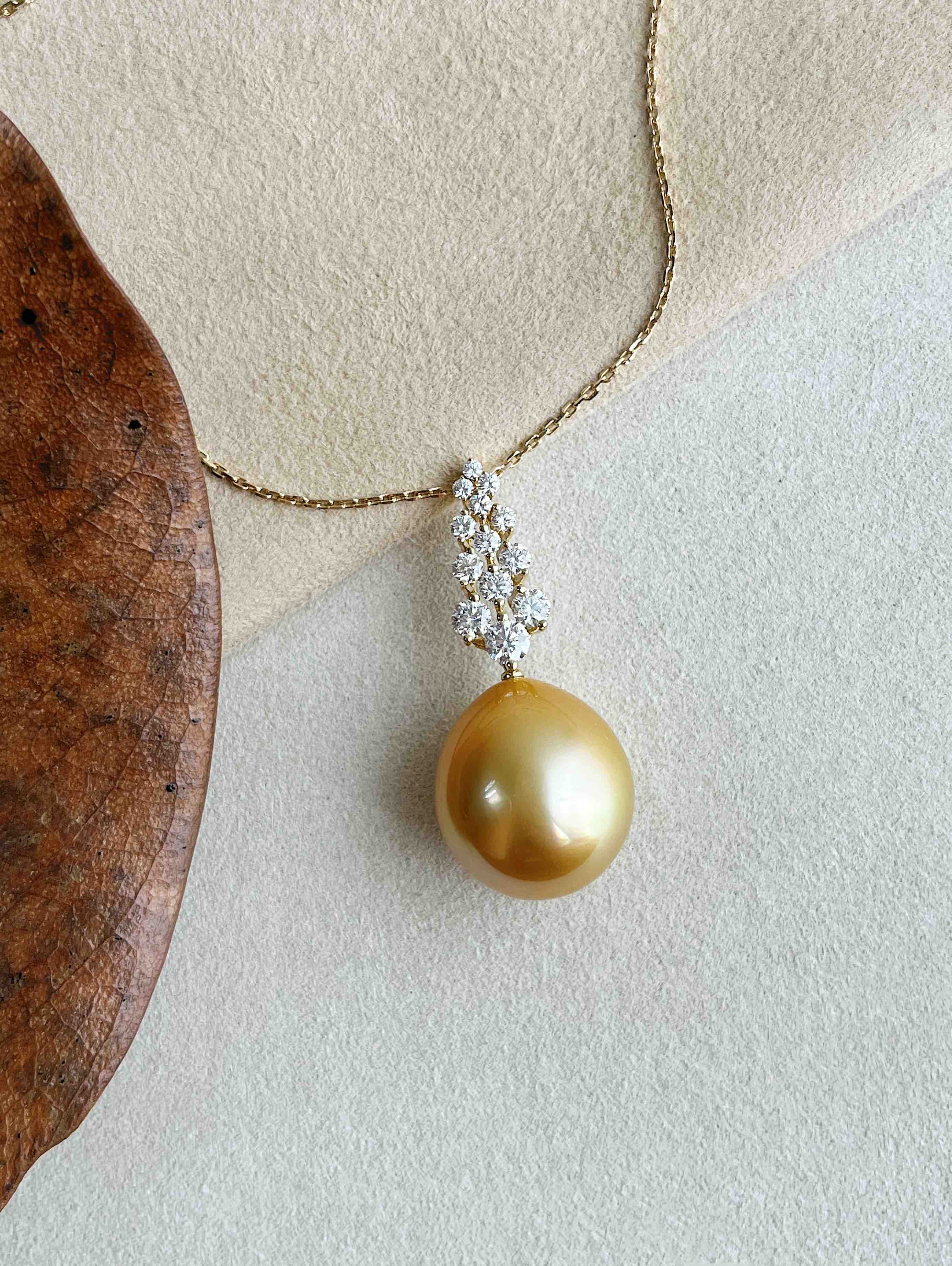 CLASSIC系列 18K镶钻石和天然金色水滴形南洋珠 坠子(附赠金链)