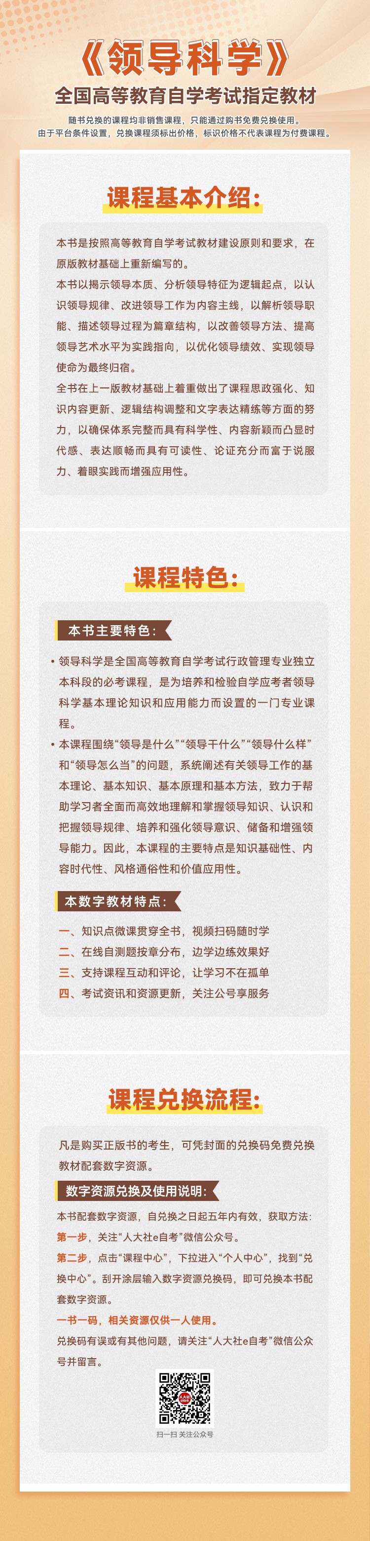 本教材系全国高等教育自学考试指导委员会组织编写的全国高等教育自学考试指定用书,适合政治学与行政学专业(专升本)。本教材致力于普及领导科学知识和提升领导艺术水平,以揭示领导本质、分析领导特征为逻辑起点,以揭示领导规律、改进领导工作为内容主线,以解析领导职能、描述领导过程为篇章结构,以改善领导方法、提高领导艺术水平为实践指向,以优化领导绩效、实现领导使命为最终归宿。全书知识体系系统完整,表达方式深入浅出,适合作为政治学与行政学专业专升本的自学教材和教学参考书。