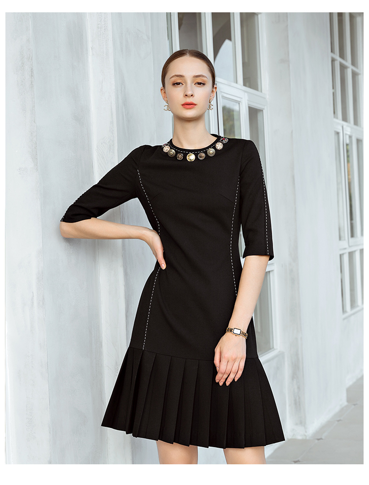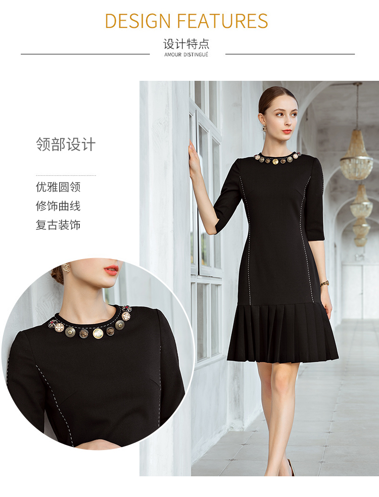 高端复古轻奢黑色古典包臀百褶裙名媛正装中袖巴洛克重工连衣裙