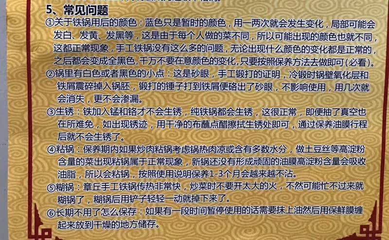 1、不建议拿章丘铁锅烧水、下面条、煮水饺……因为沸水容易破坏油膜,导致粘锅。