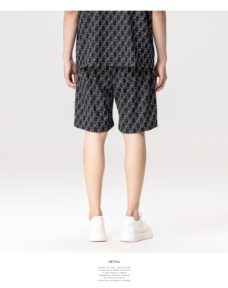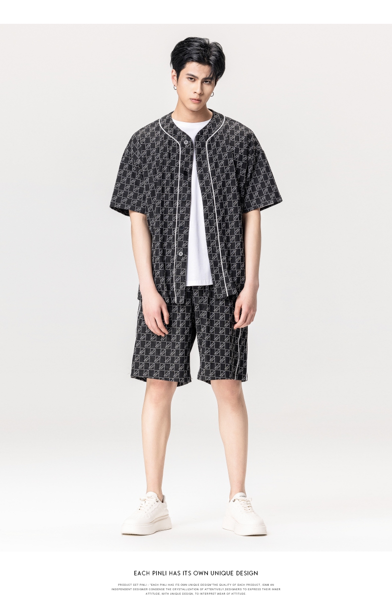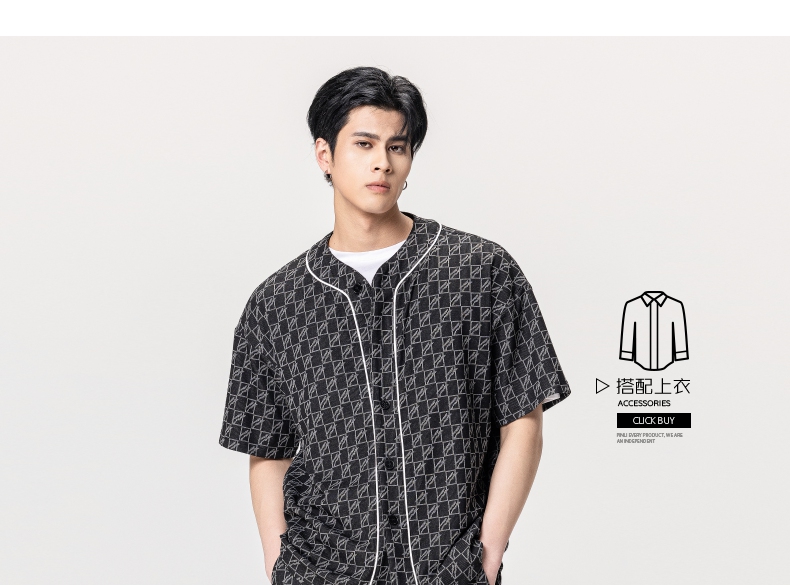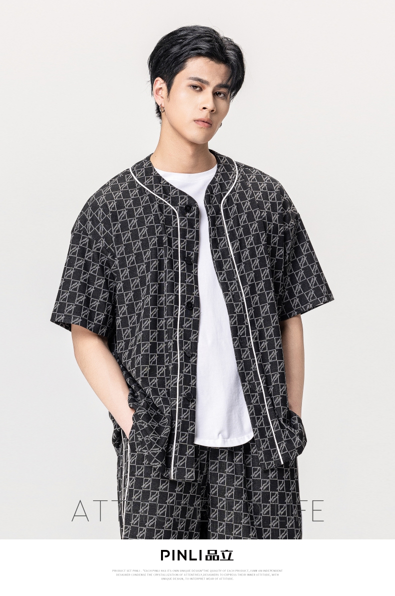 PINLI品立夏季新款圆领短袖衬衣男士提花休闲衬衫B232113010