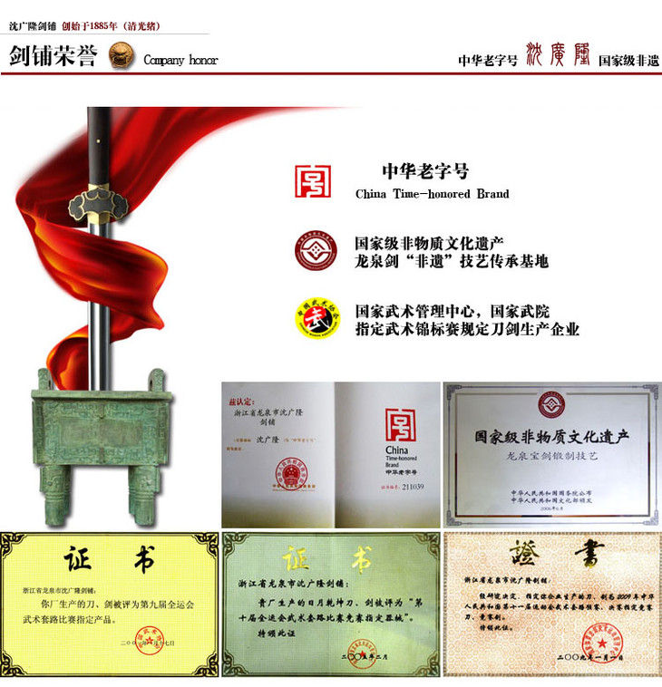 - 龙泉沈广隆剑舖创始于1885年(清光绪)位于浙江省龙泉市,是当地唯一一家“子承父业”一脉相承的中华老字号宝剑生产企业,是国家级非物质文化遗产龙泉宝剑项目保护单位,并以“天下第一剑”闻名于海内外....