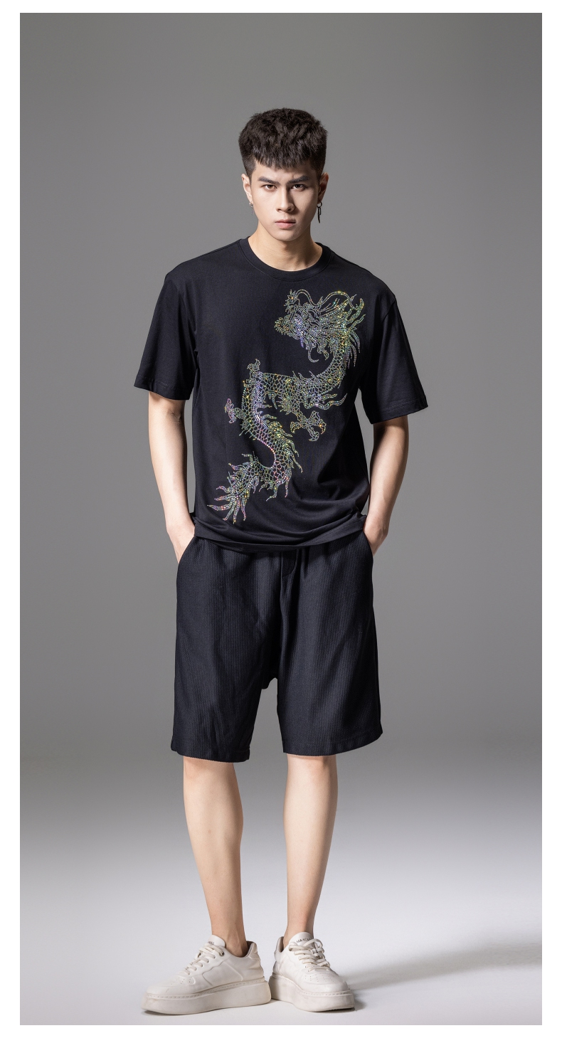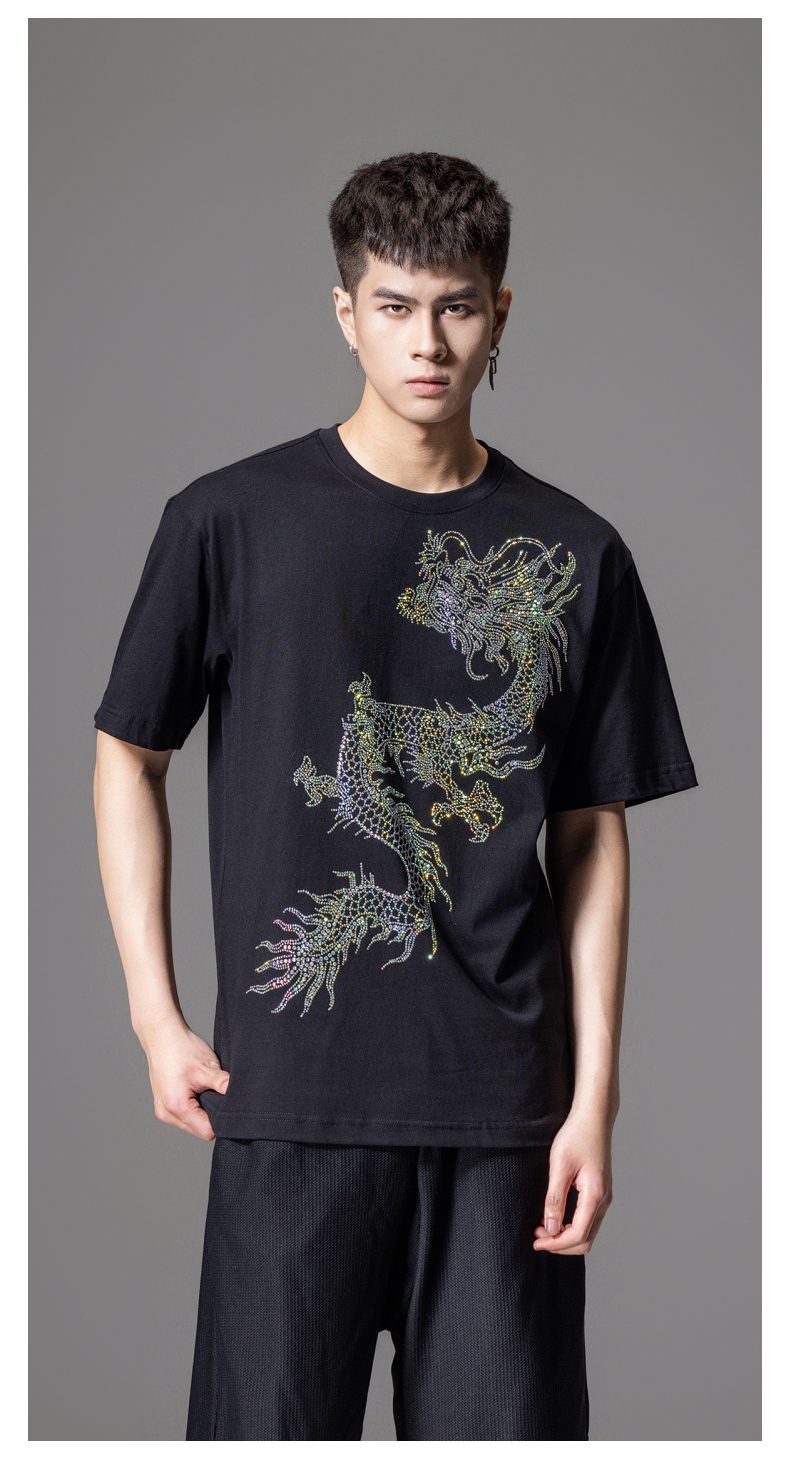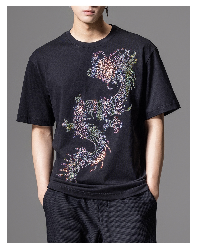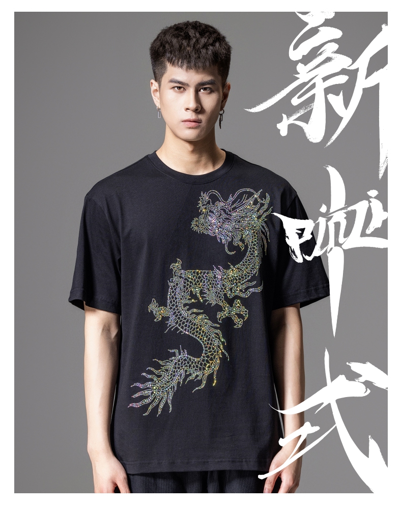 PINLI品立2024新中式夏季新款男士中国龙烫钻圆领短袖T恤休闲上衣BG242111068