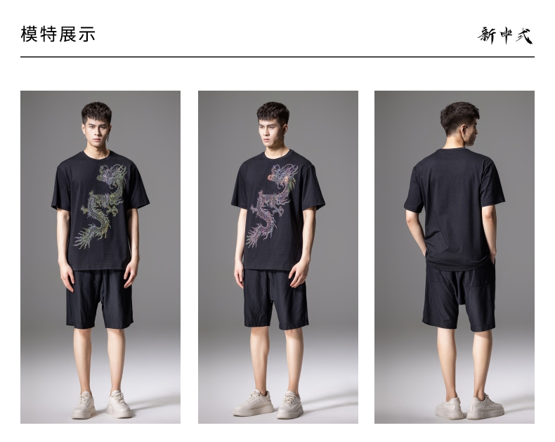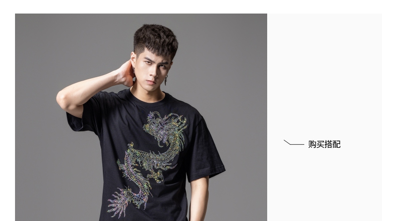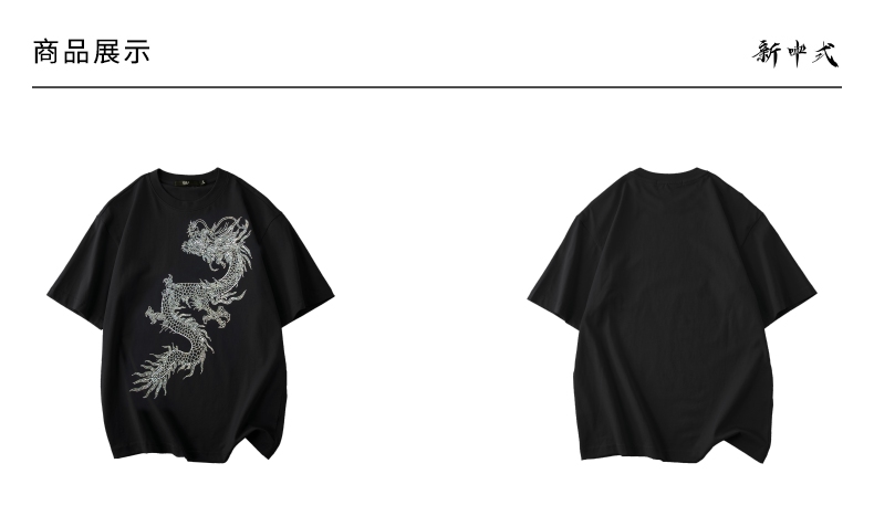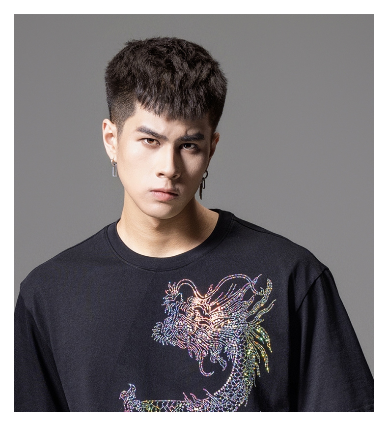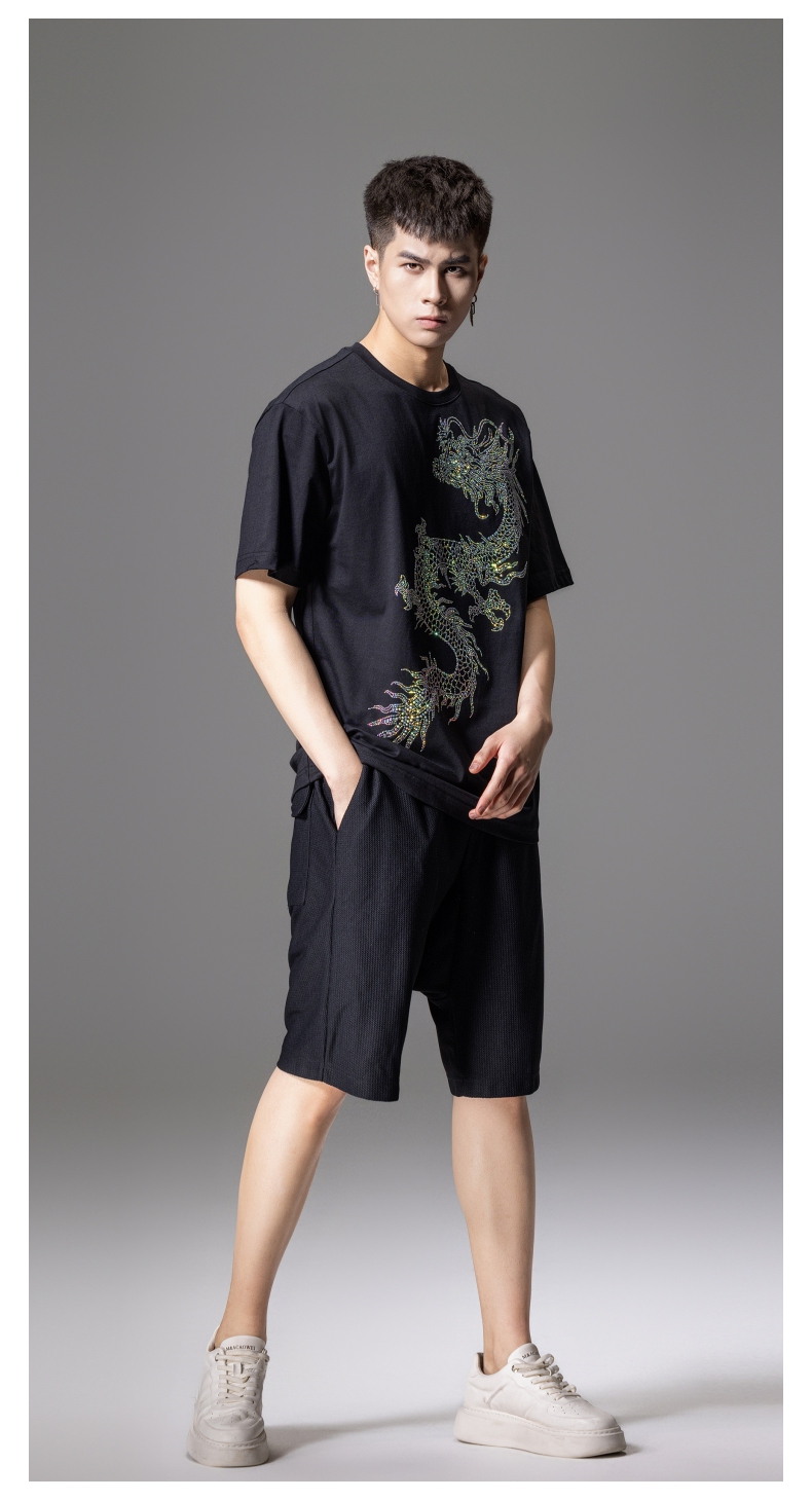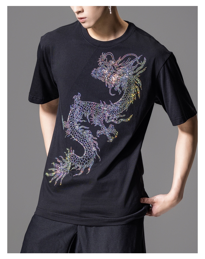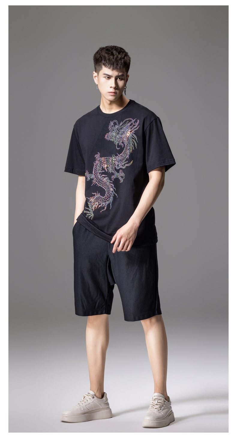 PINLI品立2024新中式夏季新款男士中国龙烫钻圆领短袖T恤休闲上衣BG242111068