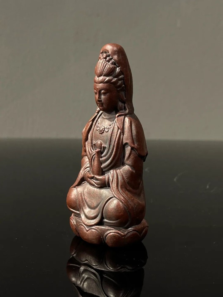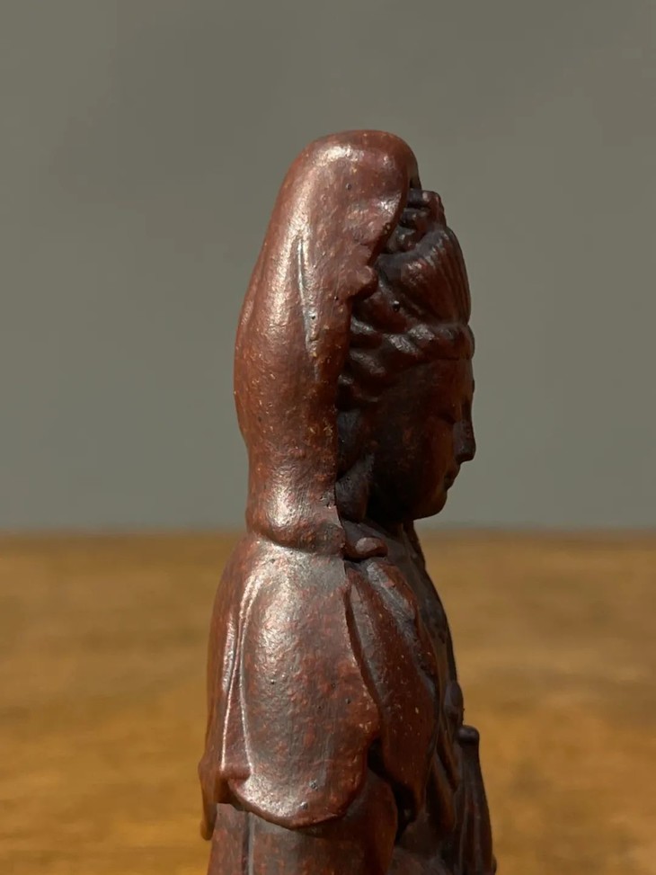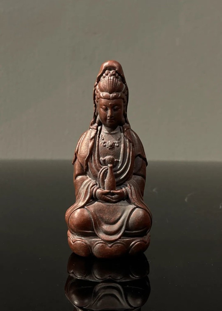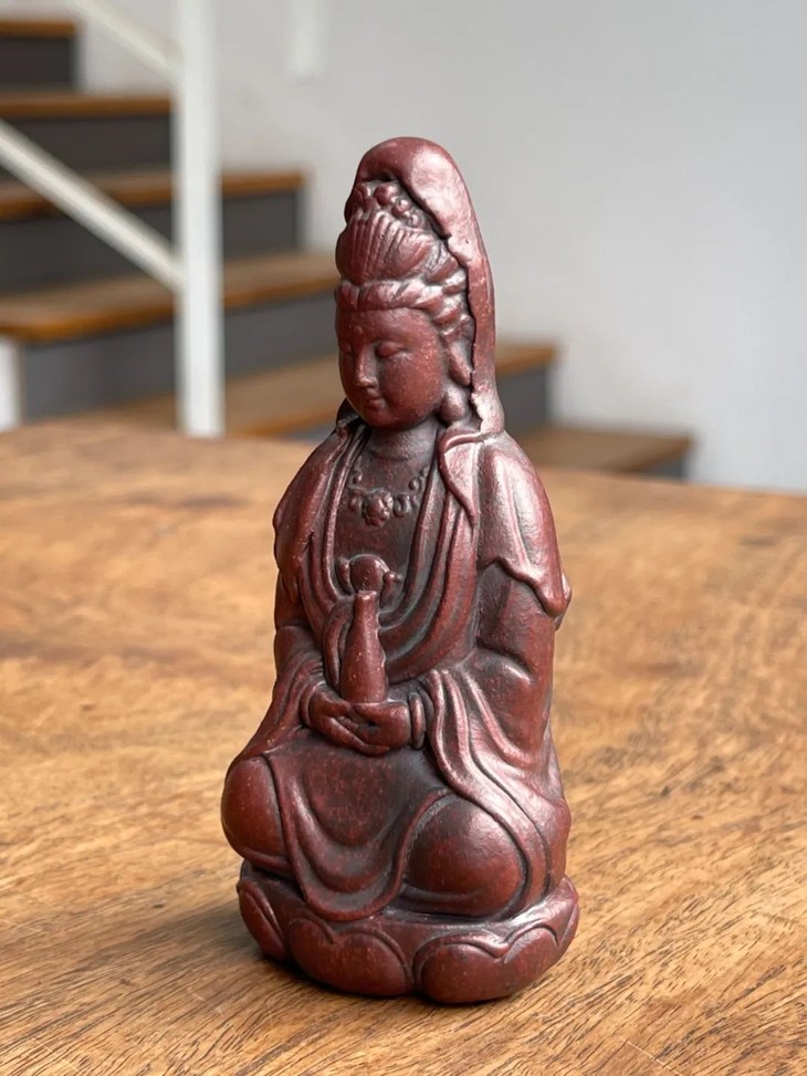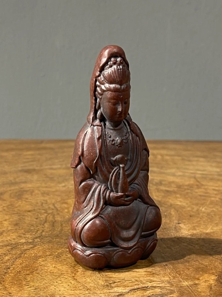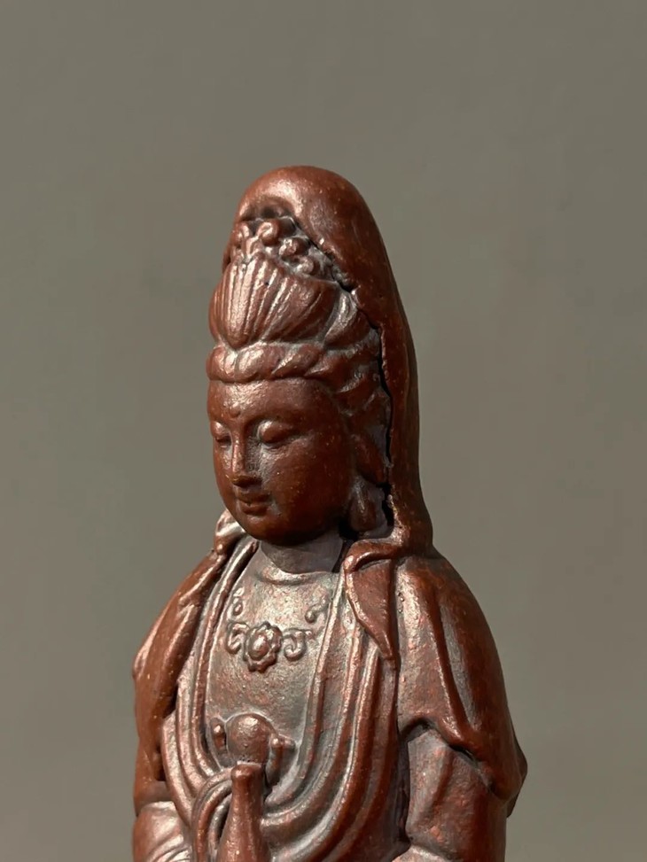 此宜兴紫砂胎莲花座观音像,案头摆设尺寸适中,敦厚朴实,简约大气,宜兴紫砂工匠以制作茶壶闻名于世,明代以来偶有见紫砂文房用具精品,此紫砂文房雕塑佛像是一件少见解放后1960年代创汇期制作的随身佛。