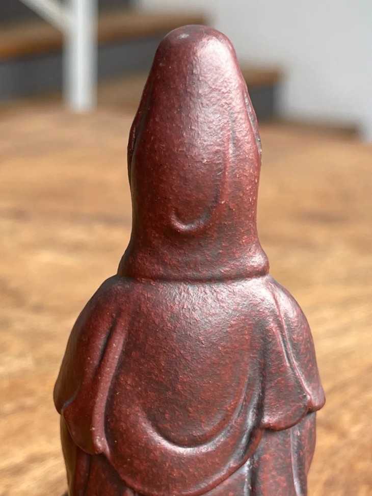这是一件以宜兴紫砂胎塑造烧制的莲花座观音像,整体造型敦厚朴实,砖红洒金斑紫砂素胎表面质地细腻,底部阴刻工坊与工匠章款“翔缘“与“顧“,宜兴紫砂泥塑型生动,是一件整体塑型典雅大气、线条简洁、气度沉稳的紫砂随身佛。