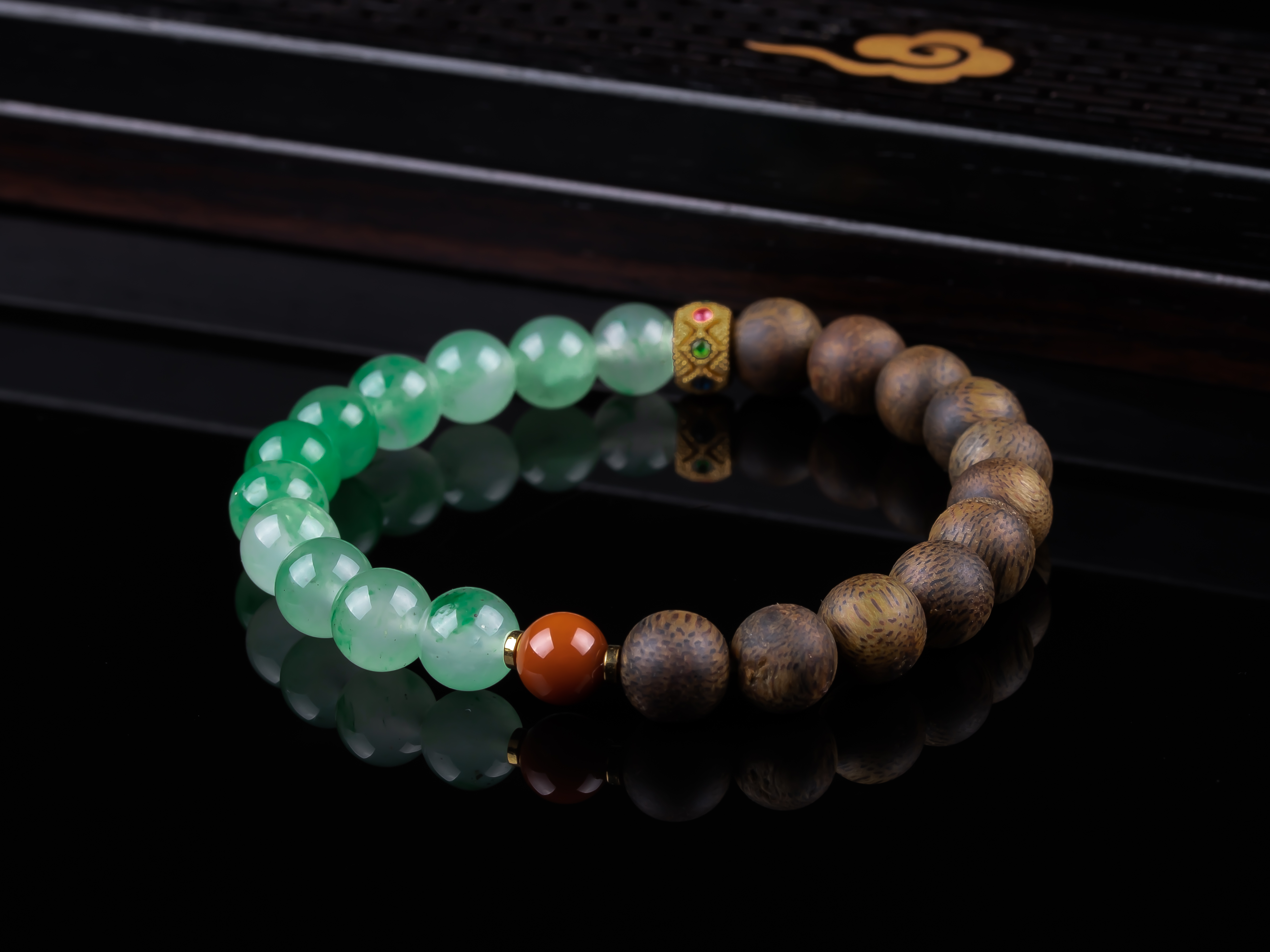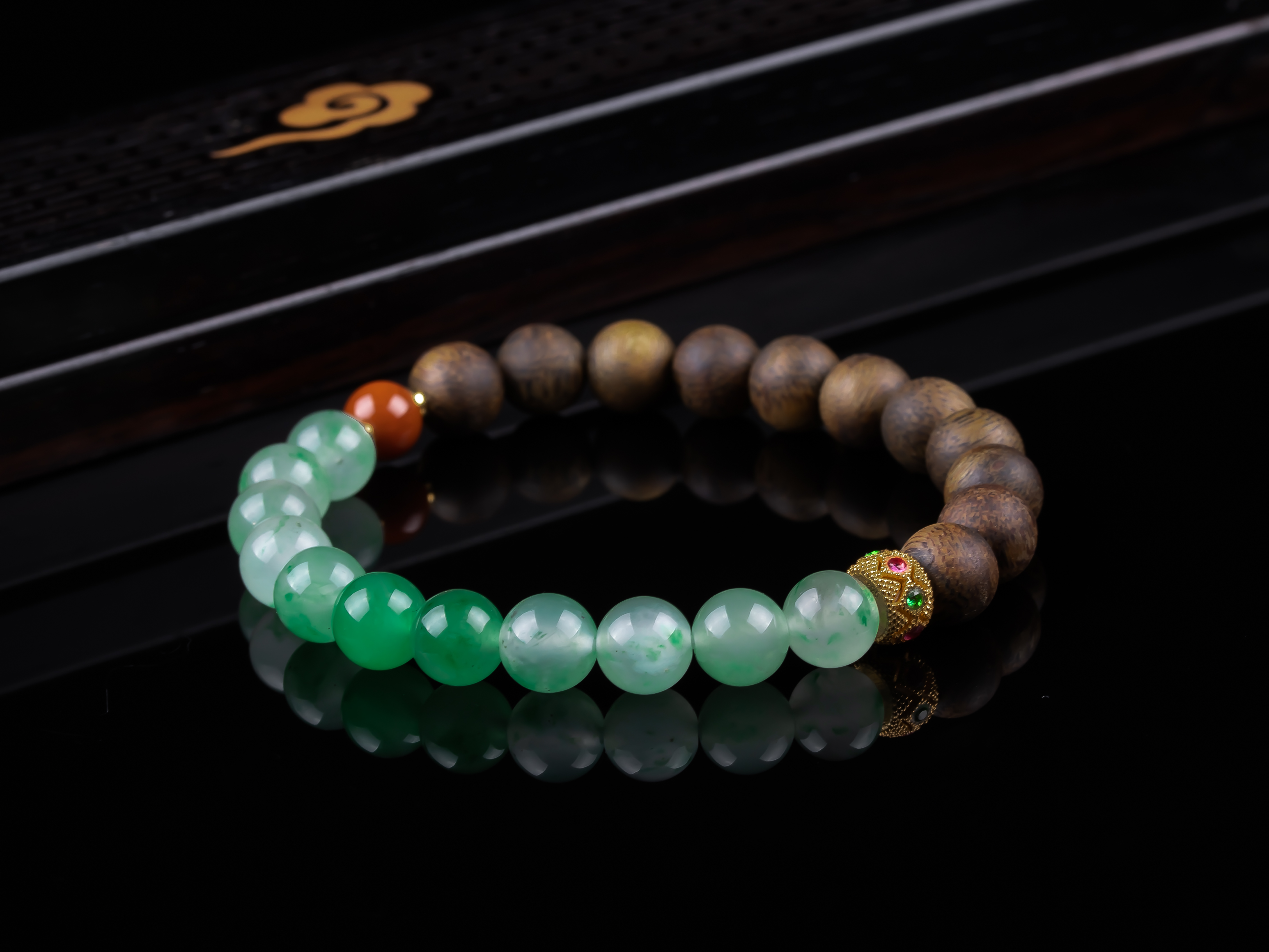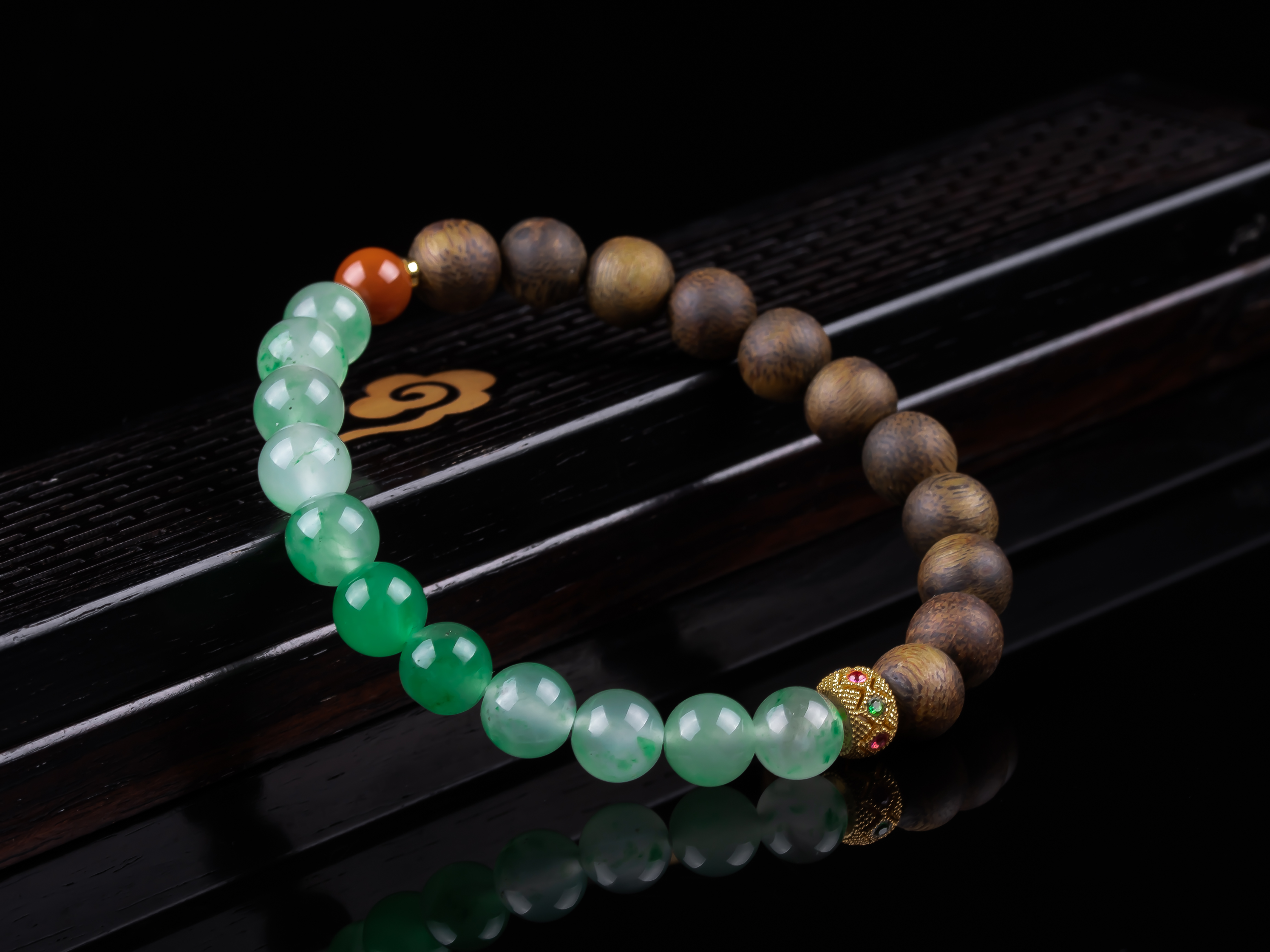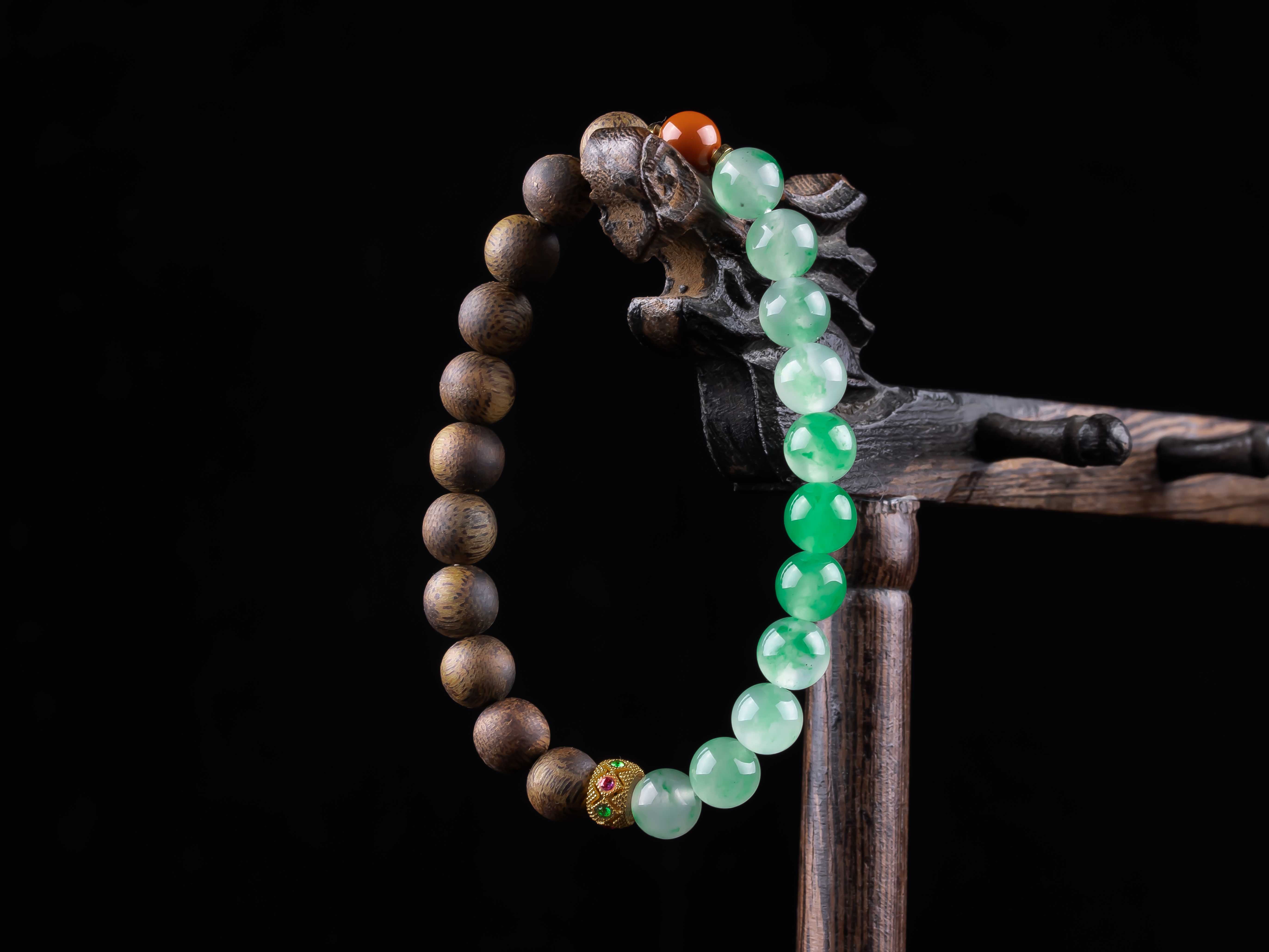 XY0310沉香+南红非洲翠手串,天然沉香约8.3mm,原色原味,香味自然清甜,半圈冰飘花的非洲翠,半山半水的款式,既鲜明又简约大方。