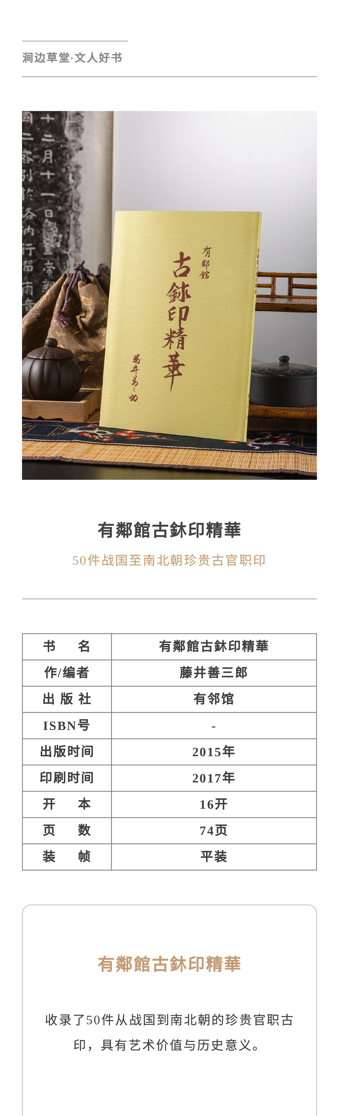 【绝版好书】《有邻馆古玺印精华》16开72页,2017年日本艺文书院初版