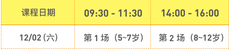 课程时间:每节课课时2小时。课程内容根据孩子接受能力有部分调整,整体内容一致,可选择一场参加