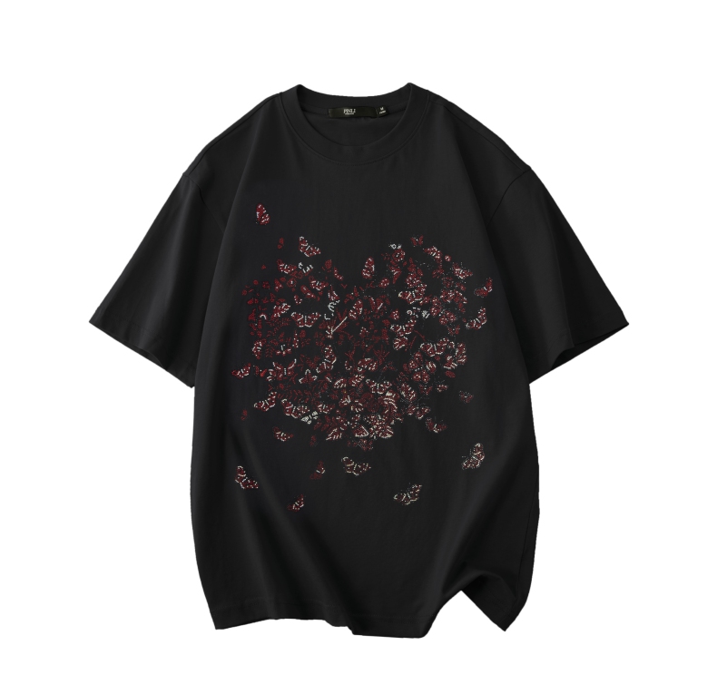 PINLI品立2024夏季新款男士烫钻短袖T恤潮牌满蝶休闲国潮上衣体恤BG242111049