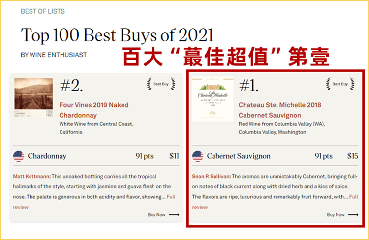 ○ 哥伦比亚赤霞珠入选Wine Enthusiast 百大蕞佳购买葡萄酒榜单第壹名(2018年份)。