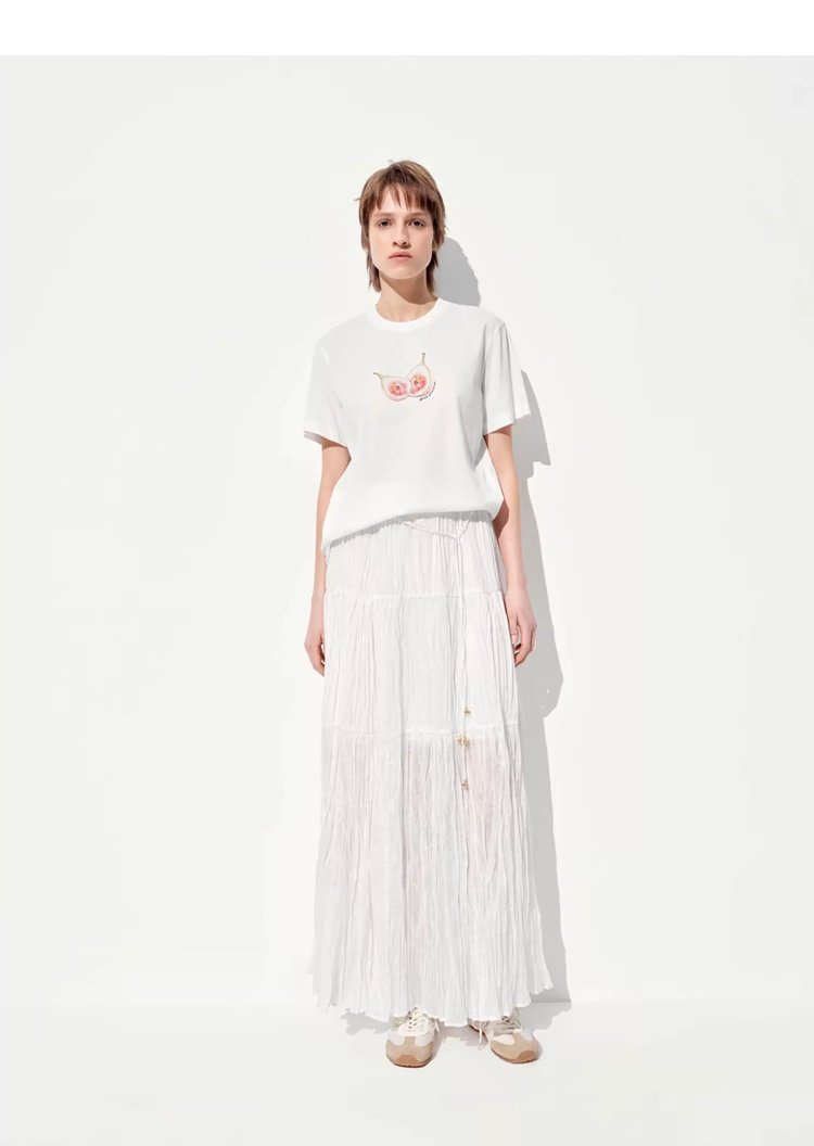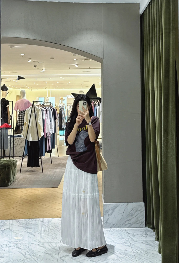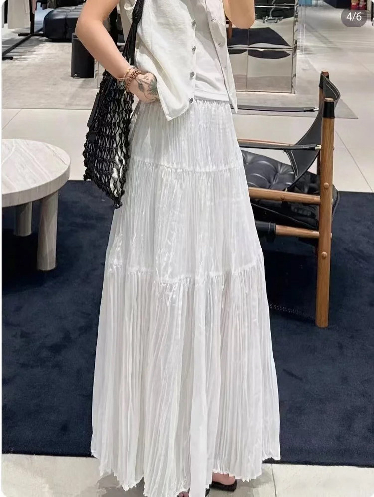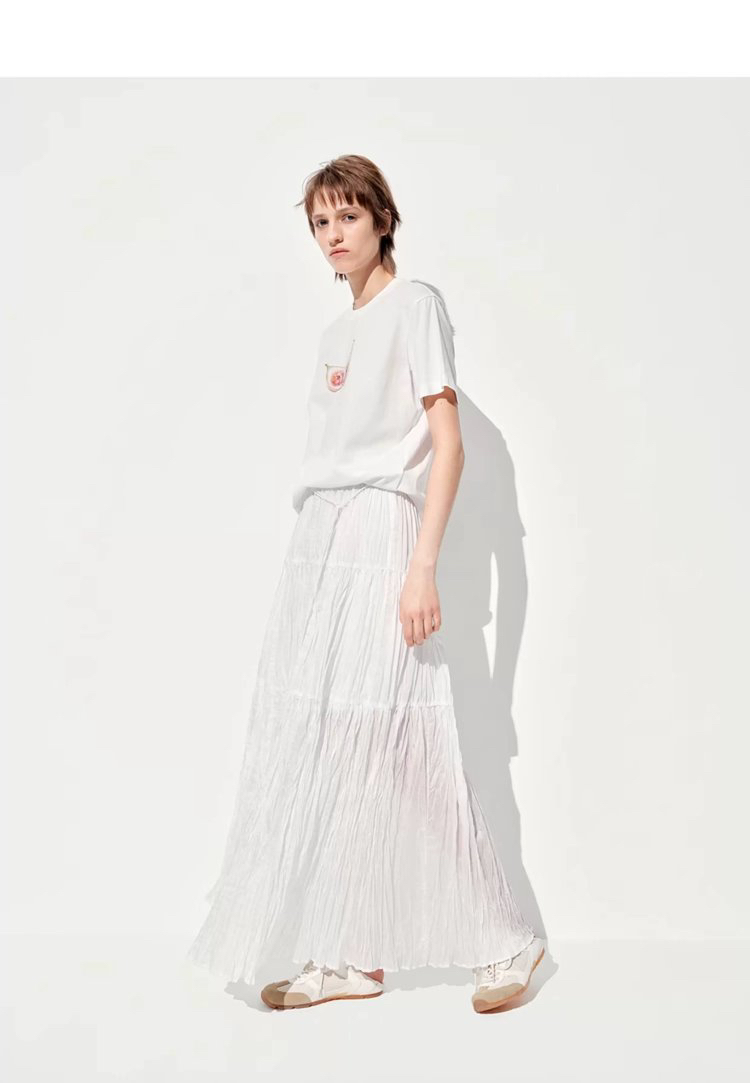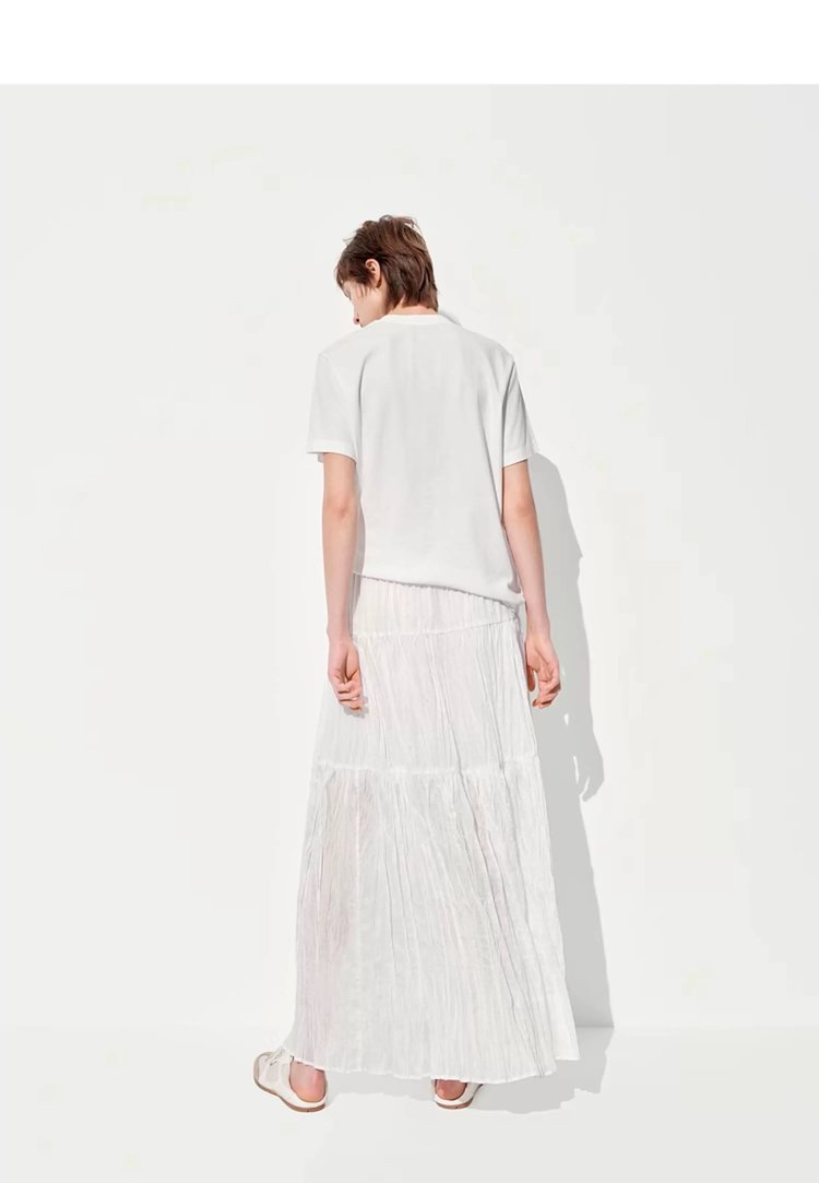 【白月光】乱褶肌理松紧腰长款半裙 面料垂坠 轻质好穿 无序烫褶 在裙摆间形成充满呼吸感的立体雕塑 自然中腰松紧弹力设计 友好包容腰腹 宽松A字蛋糕裙型