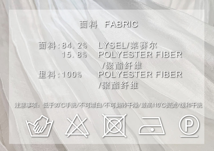 面料由天丝与涤纶混纺纱线交织而成,触肤舒适光滑,吸湿透气感好,上身流畅垂坠,轻质好穿,带有静奢与优雅之感,涤纶的加入增加面料的强度,结实柔韧日常好护理。