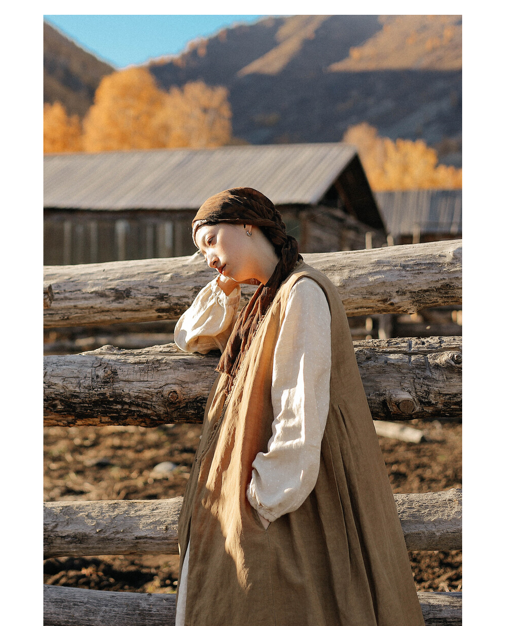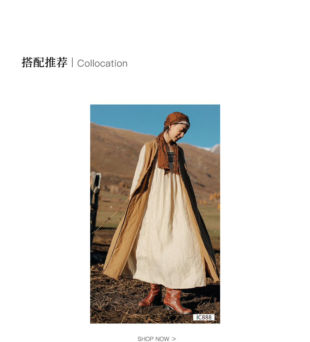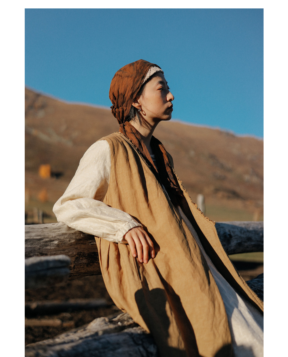 绽放886朵/卡其黄天丝亚麻花边拼接无袖捏褶V领宽松长款棉衣棉服
