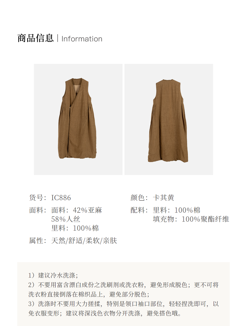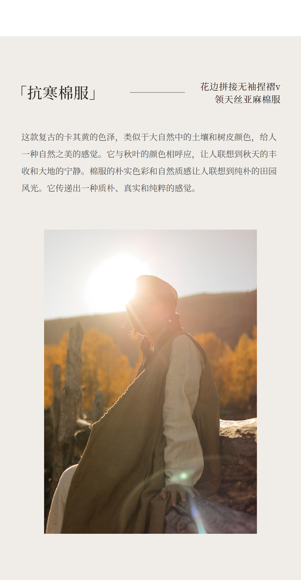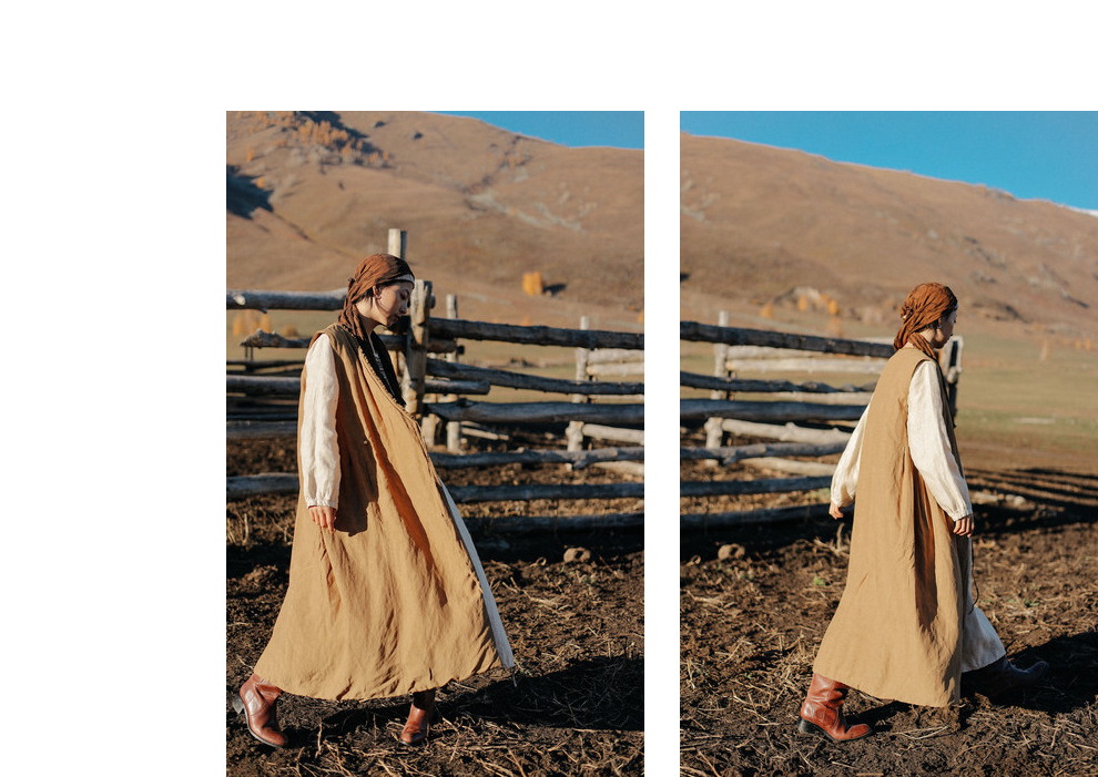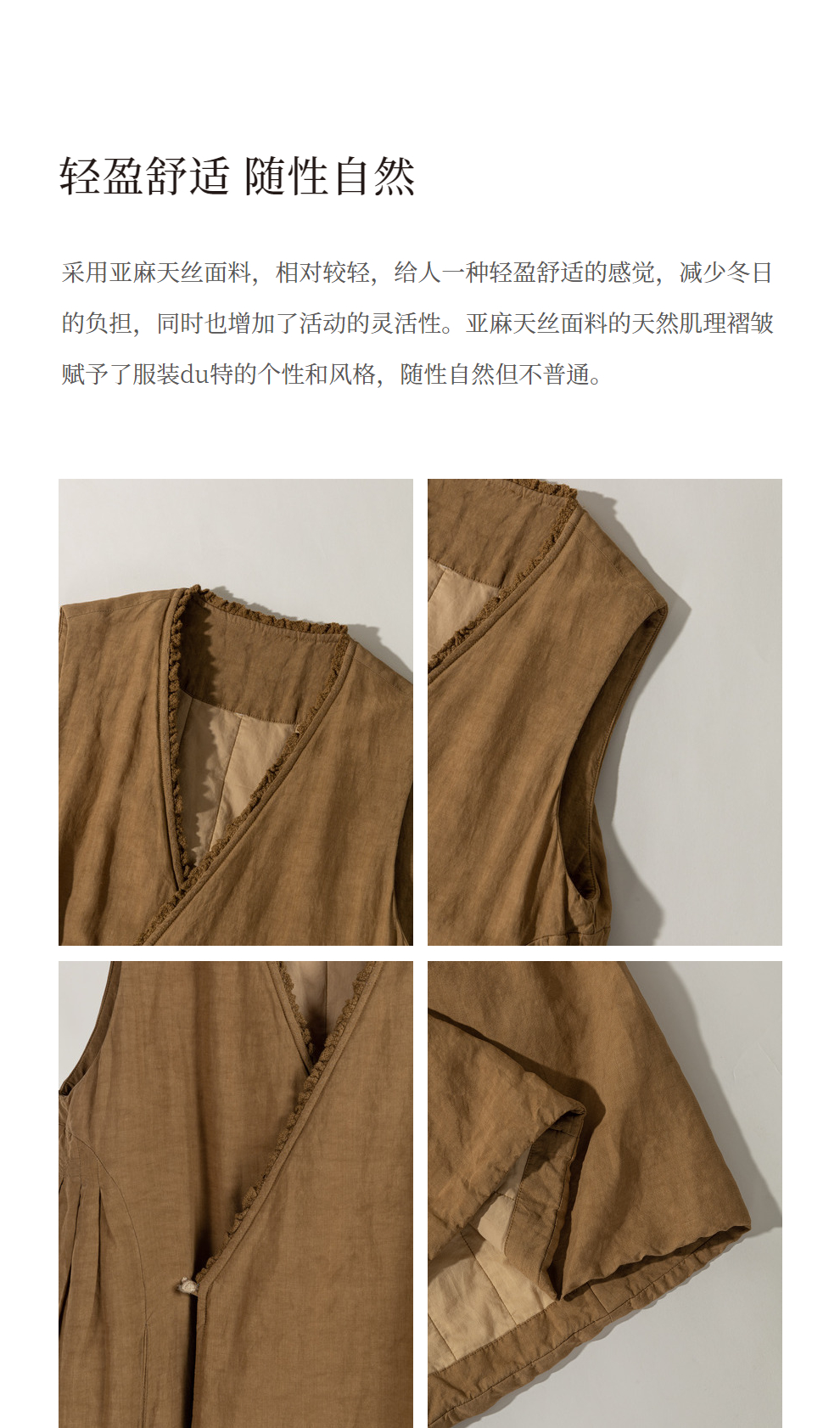 绽放886朵/卡其黄天丝亚麻花边拼接无袖捏褶V领宽松长款棉衣棉服