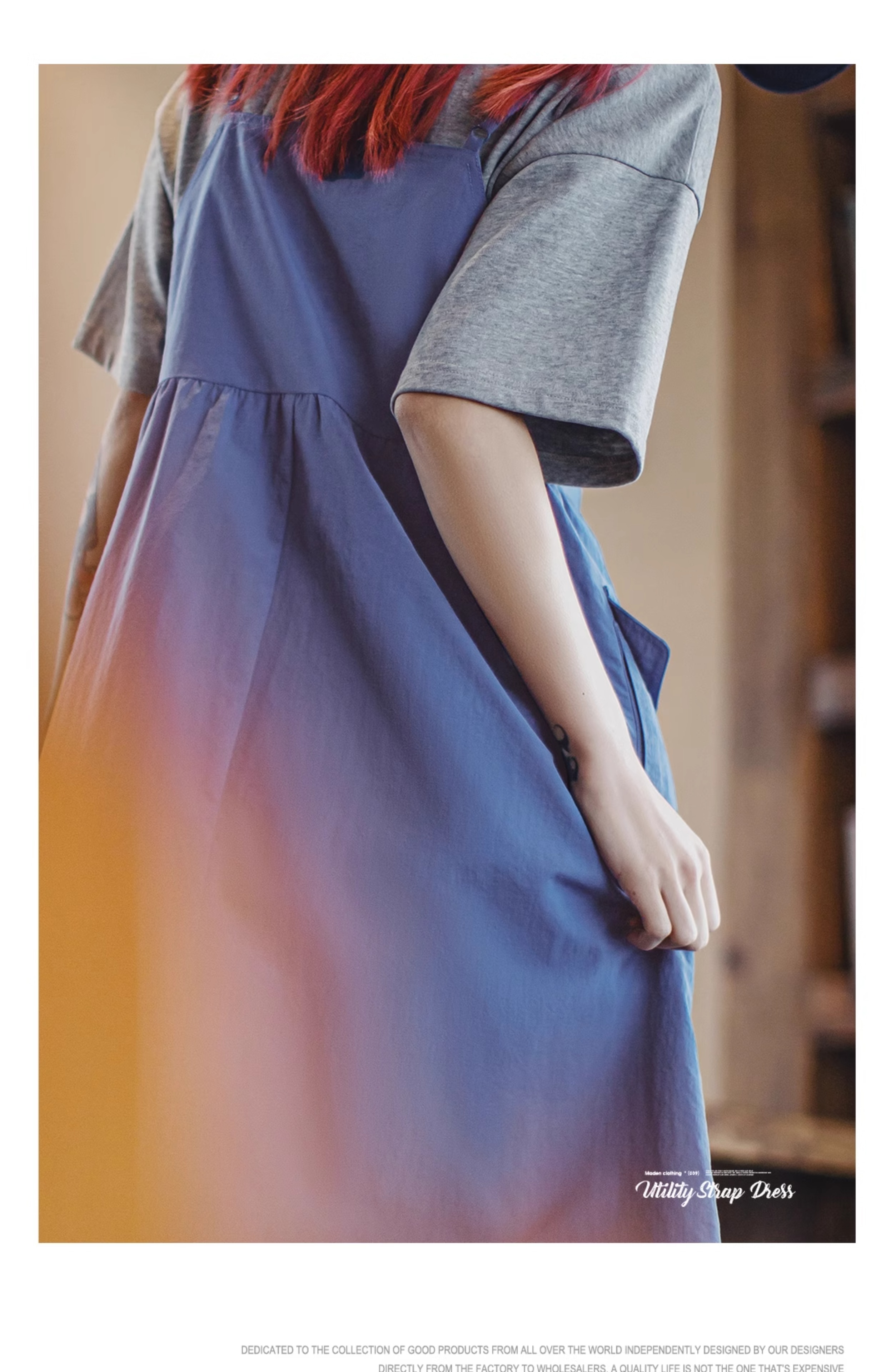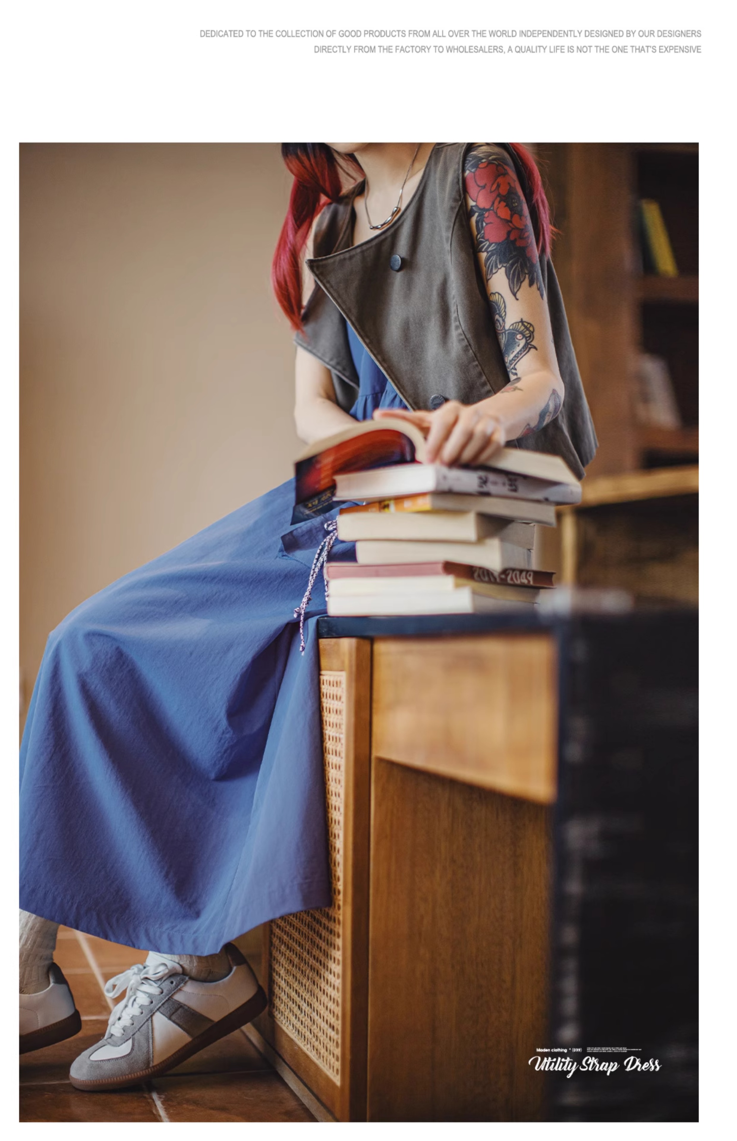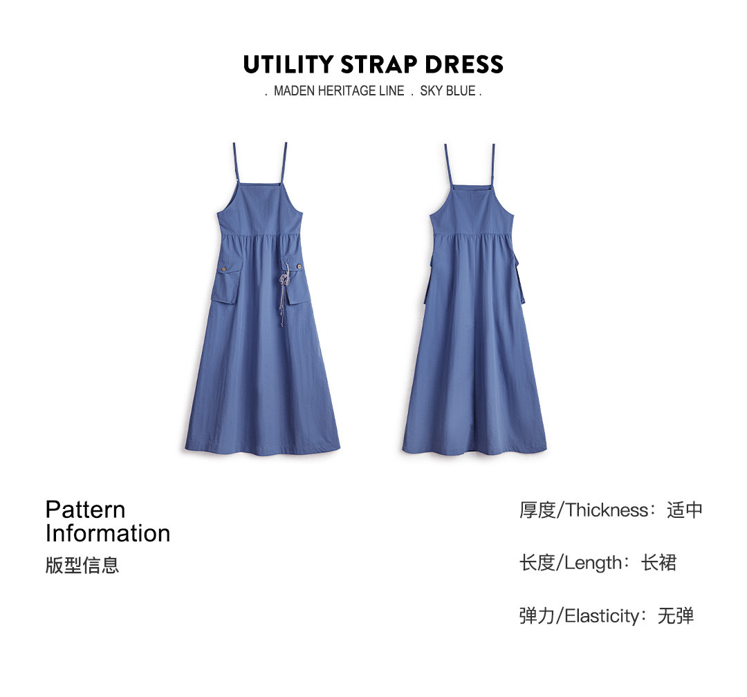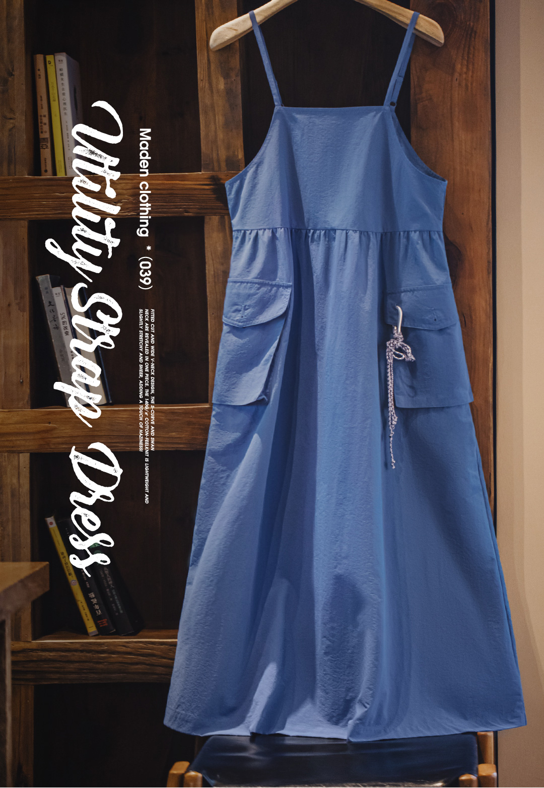 马登夏日系海边度假无袖吊带背心连衣裙掐腰山系工装多口袋长裙女