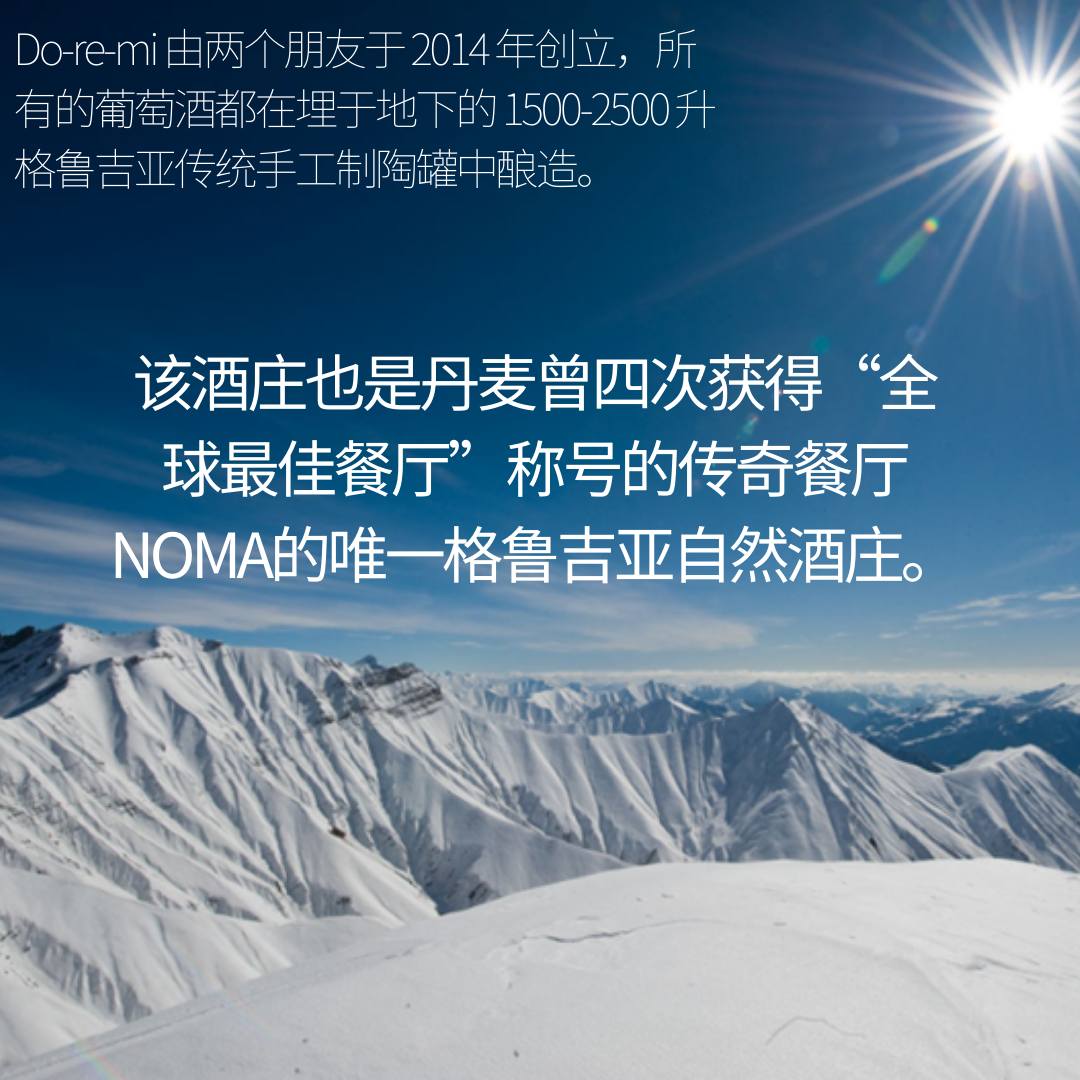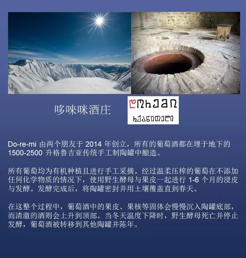 每年春天,一部分新酒在称为 Supras(一种传统的可持续好几个小时的宴会,每隔十分钟,人们都会举杯祝酒,宴会是否成功取决于你面前堆着多少个空盘子。) 的格鲁吉亚传统庆祝活动中被喝掉,剩下陶罐中的新酒不经过滤后直接装瓶,并只添加少量二氧化硫。Do-Re-Mi酒庄同时也是自然酒协会的优秀成员。