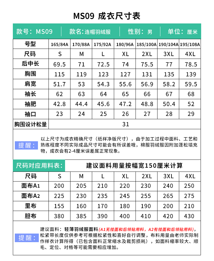 裁缝学苑MS09 男士羽绒服纸样连帽保暖男装外套面包衣服上衣样板裁剪