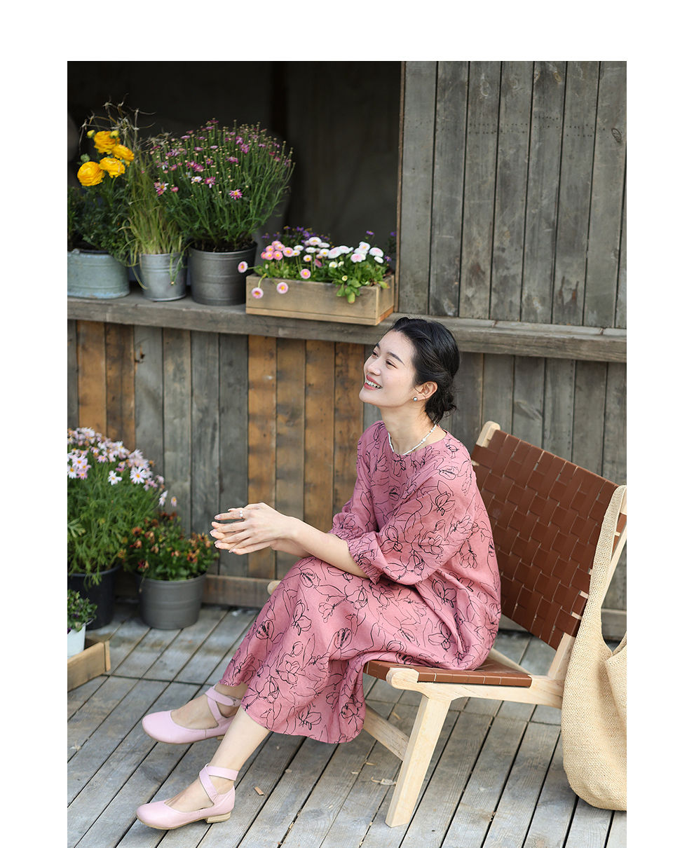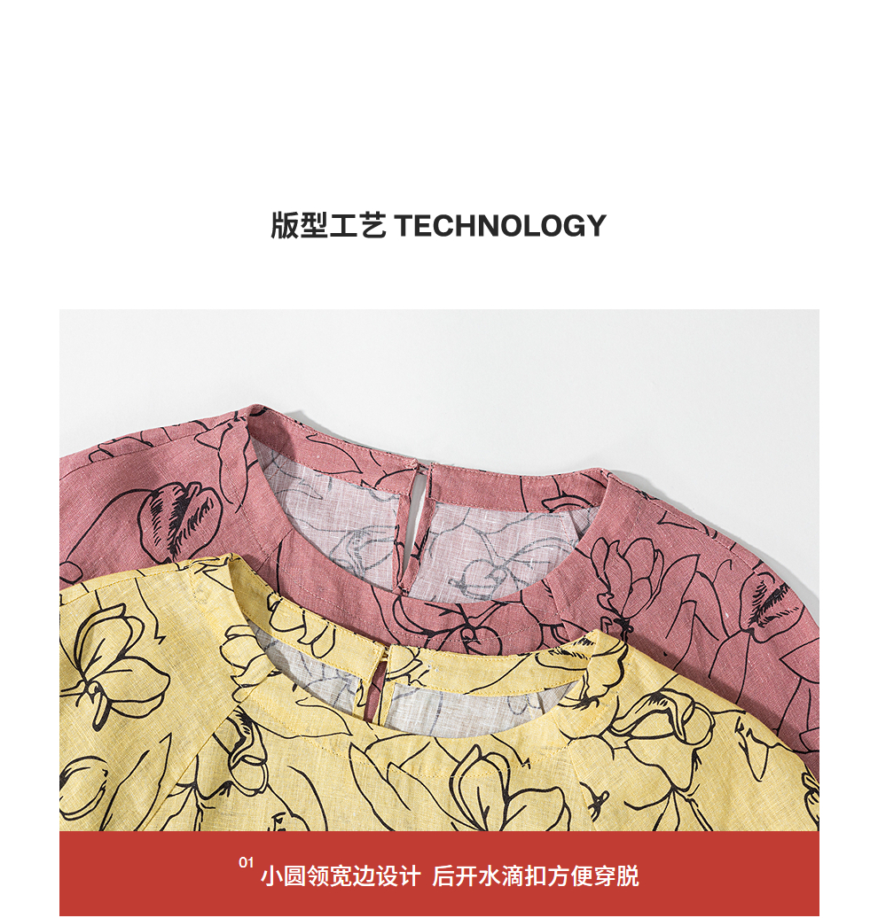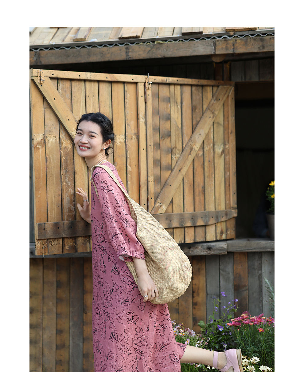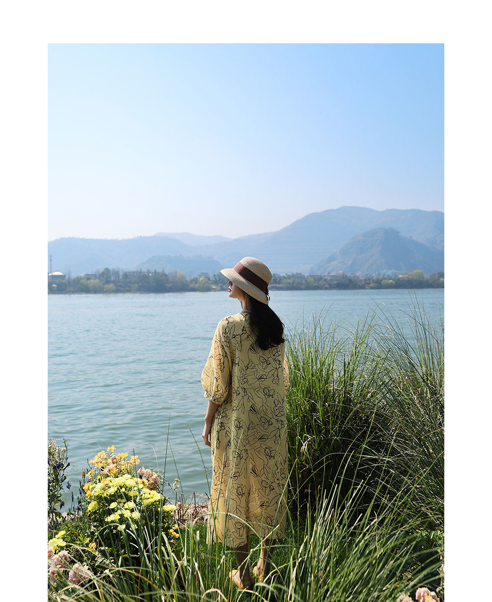 绽放旅行女装269朵/双支数亚麻抽象线条印花插肩袖立体袖口连衣裙