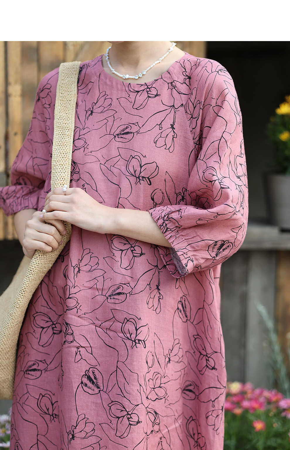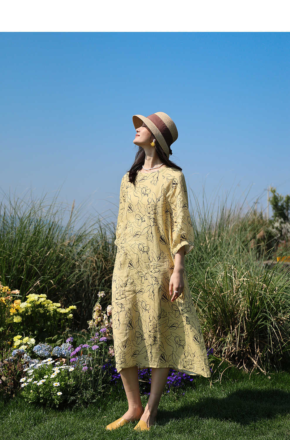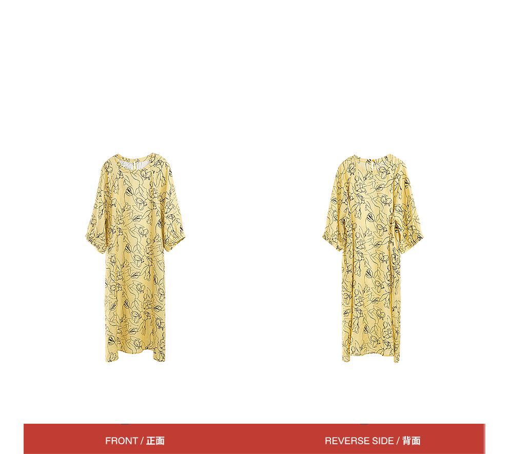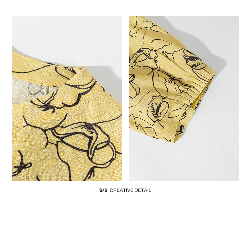 绽放旅行女装269朵/双支数亚麻抽象线条印花插肩袖立体袖口连衣裙