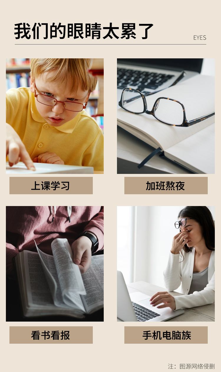 【适用人群】男女老少通用,针对长时间看书、看电脑、夜间玩游戏者、学生族、开车族、失眠等眼部疲劳人群。