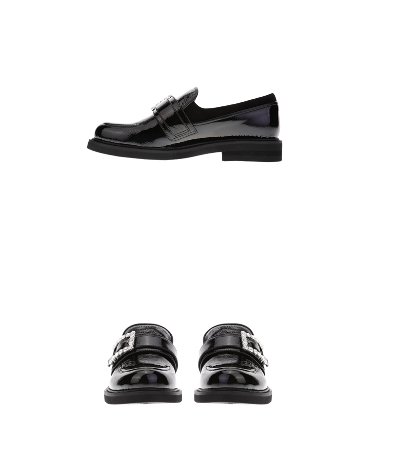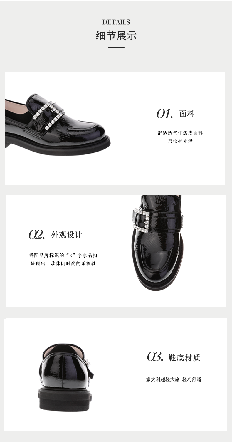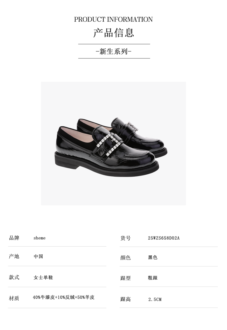 sheme新生系列E型水晶扣女士亮皮乐福鞋经典黑色可定制