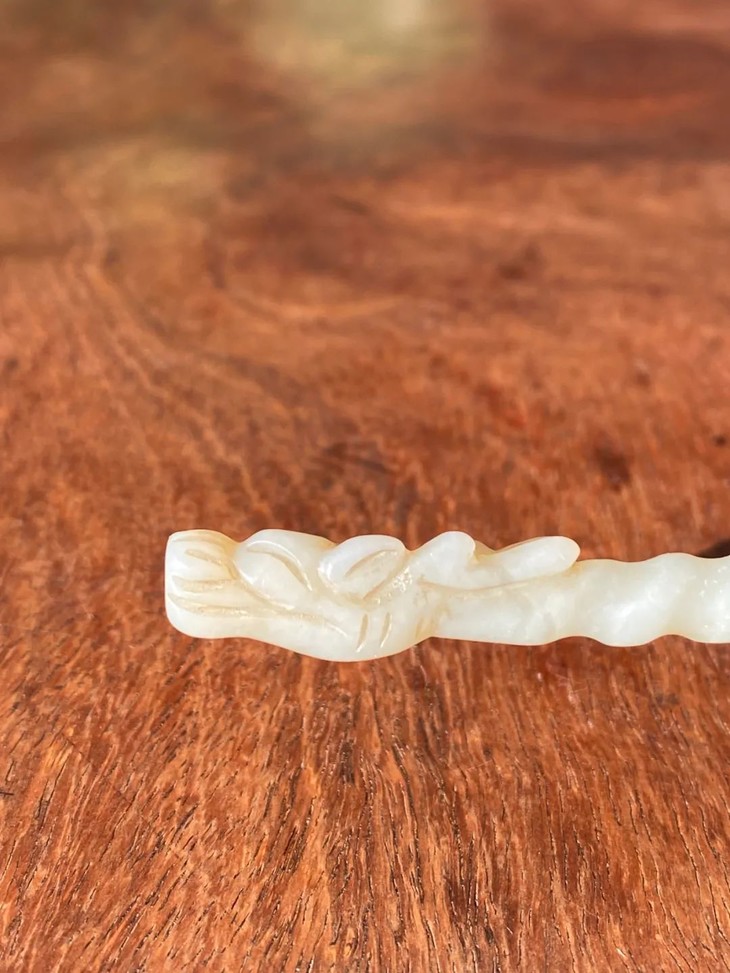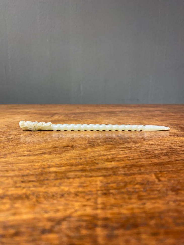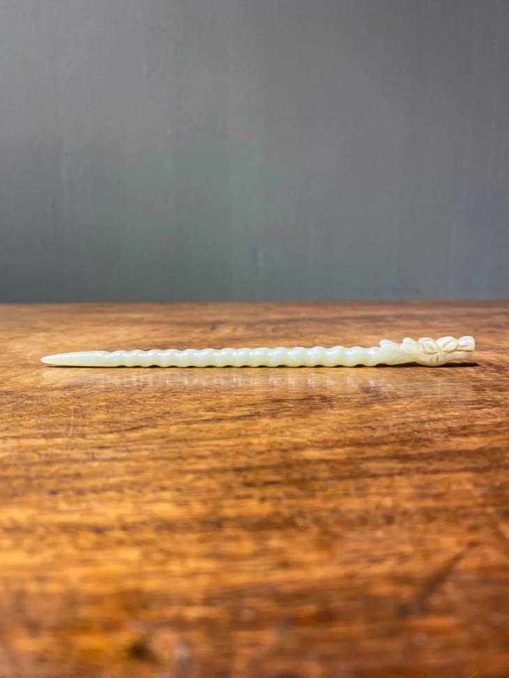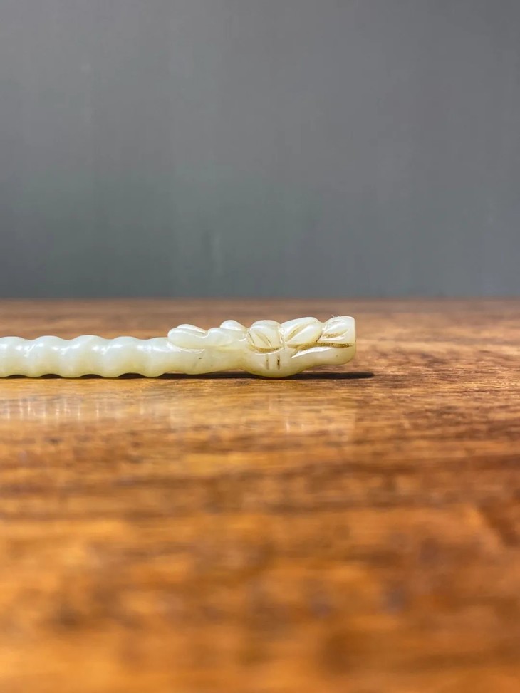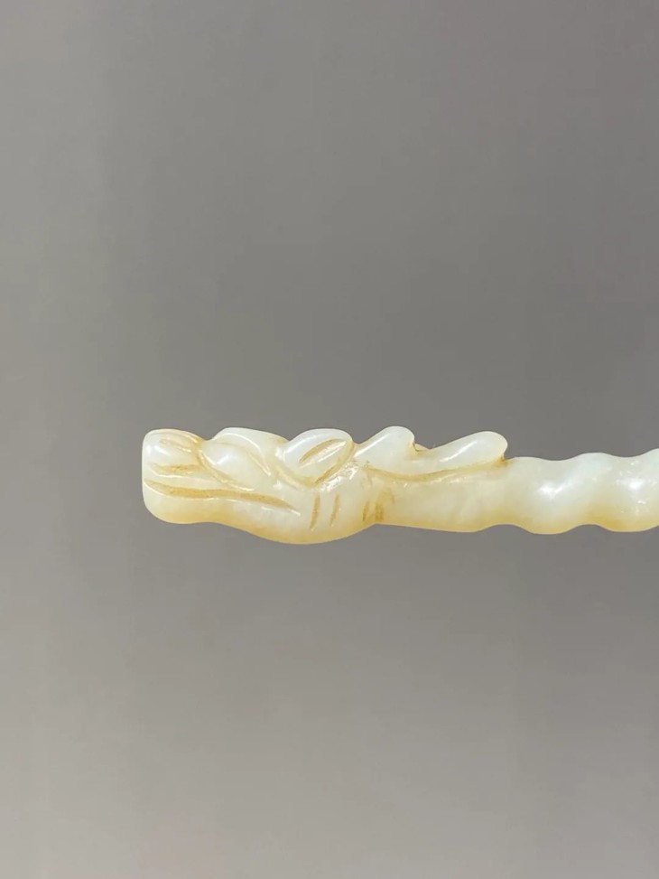 此和田白玉镂雕龙首钮螺旋形发簪保存完好无损,表面包浆皮壳温润细腻,是一人见人爱之绝美白玉发簪。