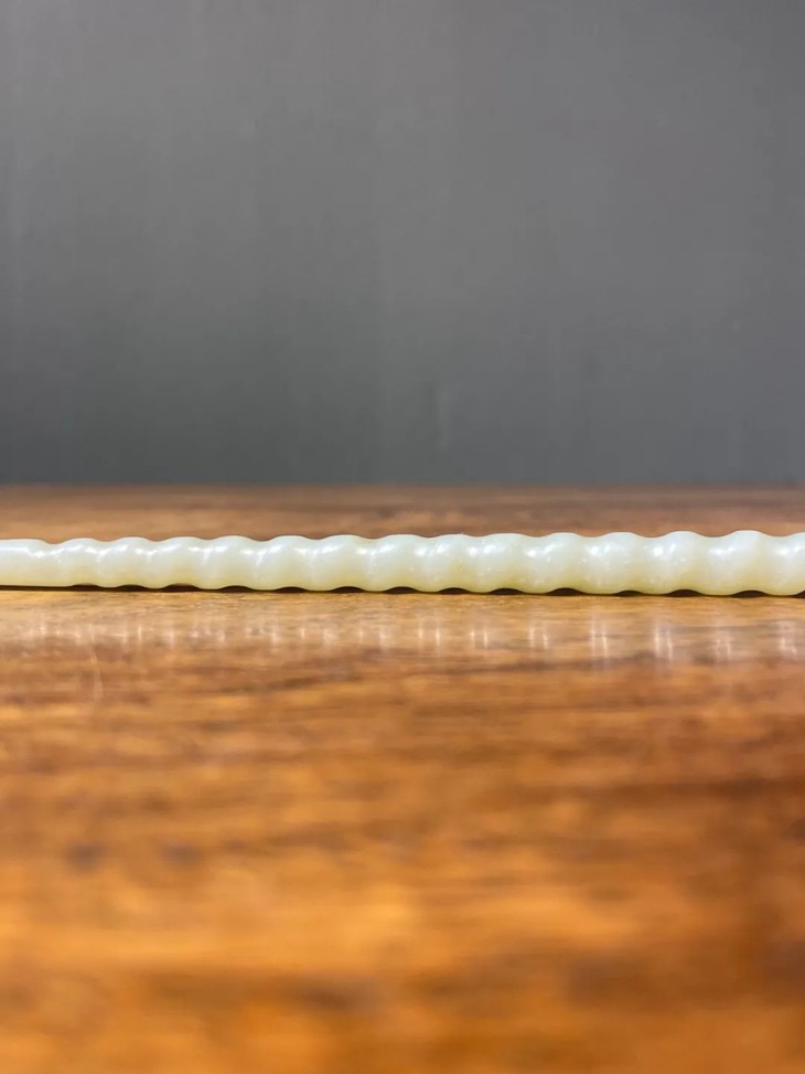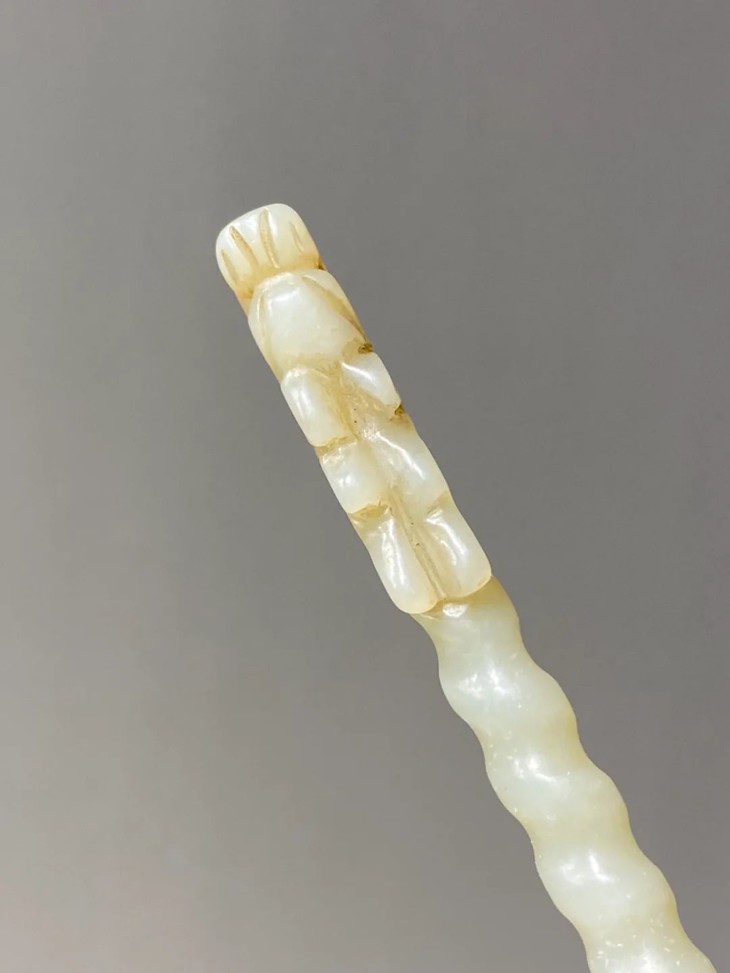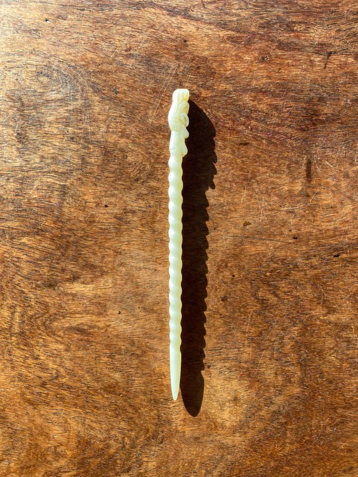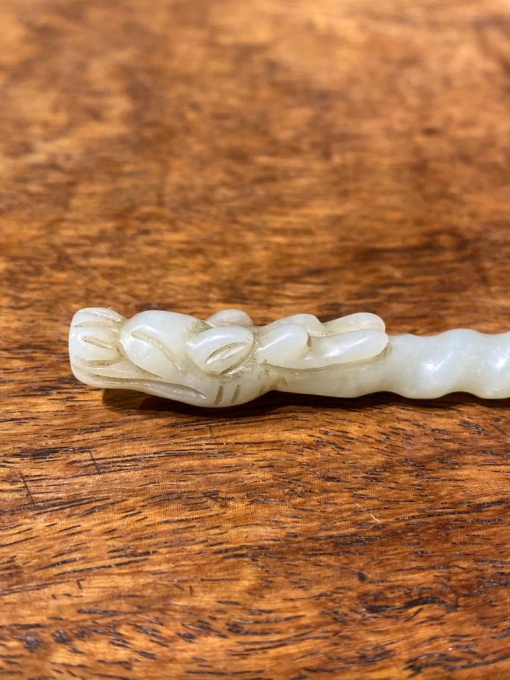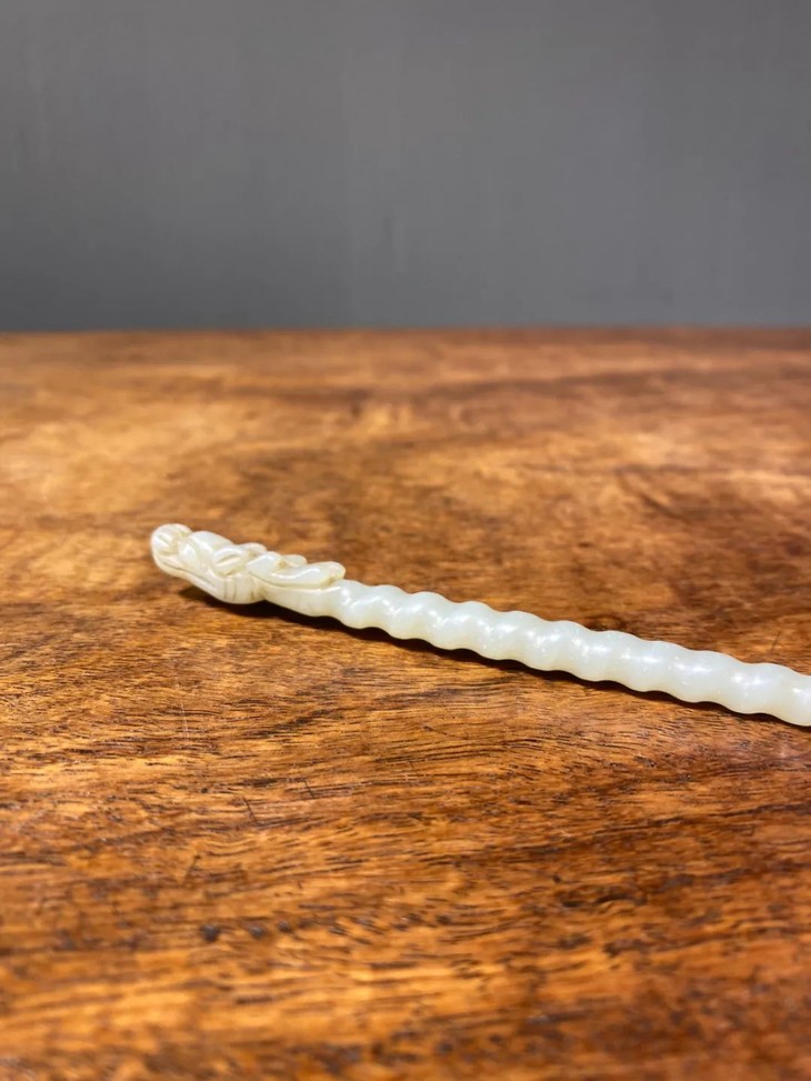 此和田白玉镂雕龙首钮螺旋形发簪保存完好无损,表面包浆皮壳温润细腻,是一人见人爱之绝美白玉发簪。