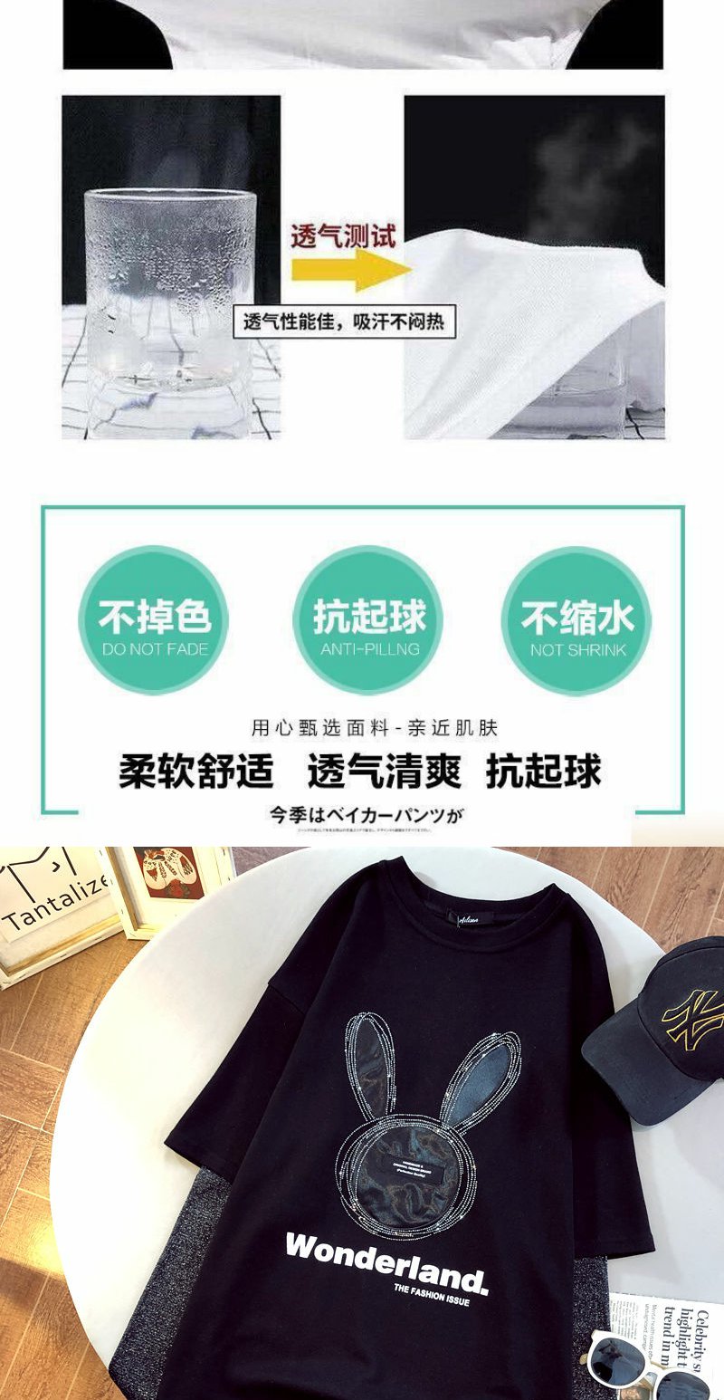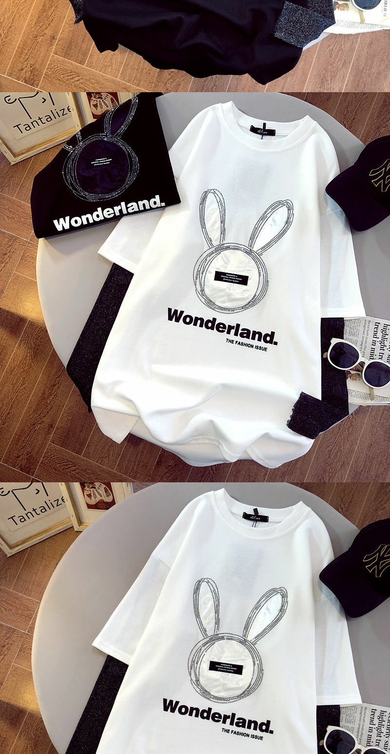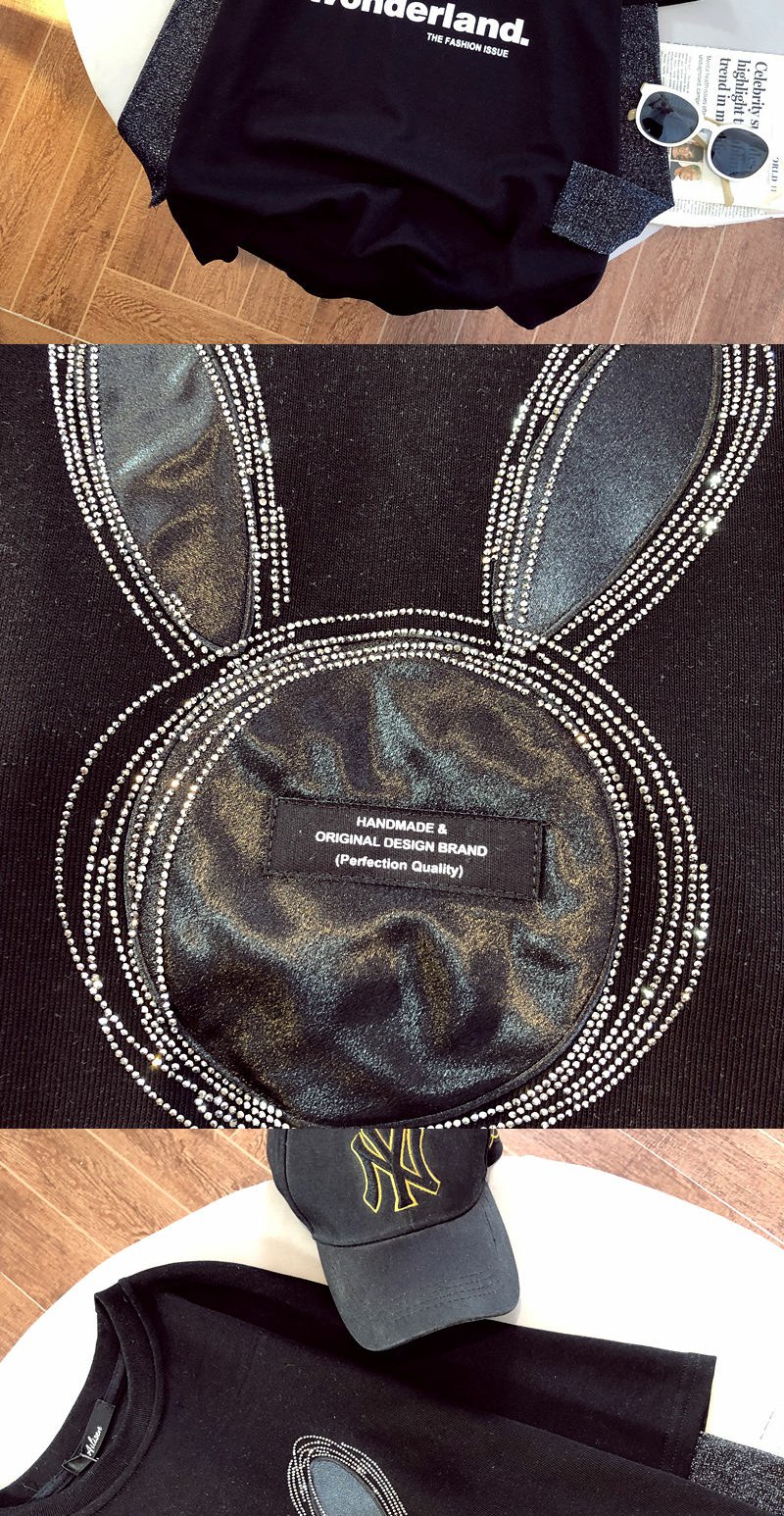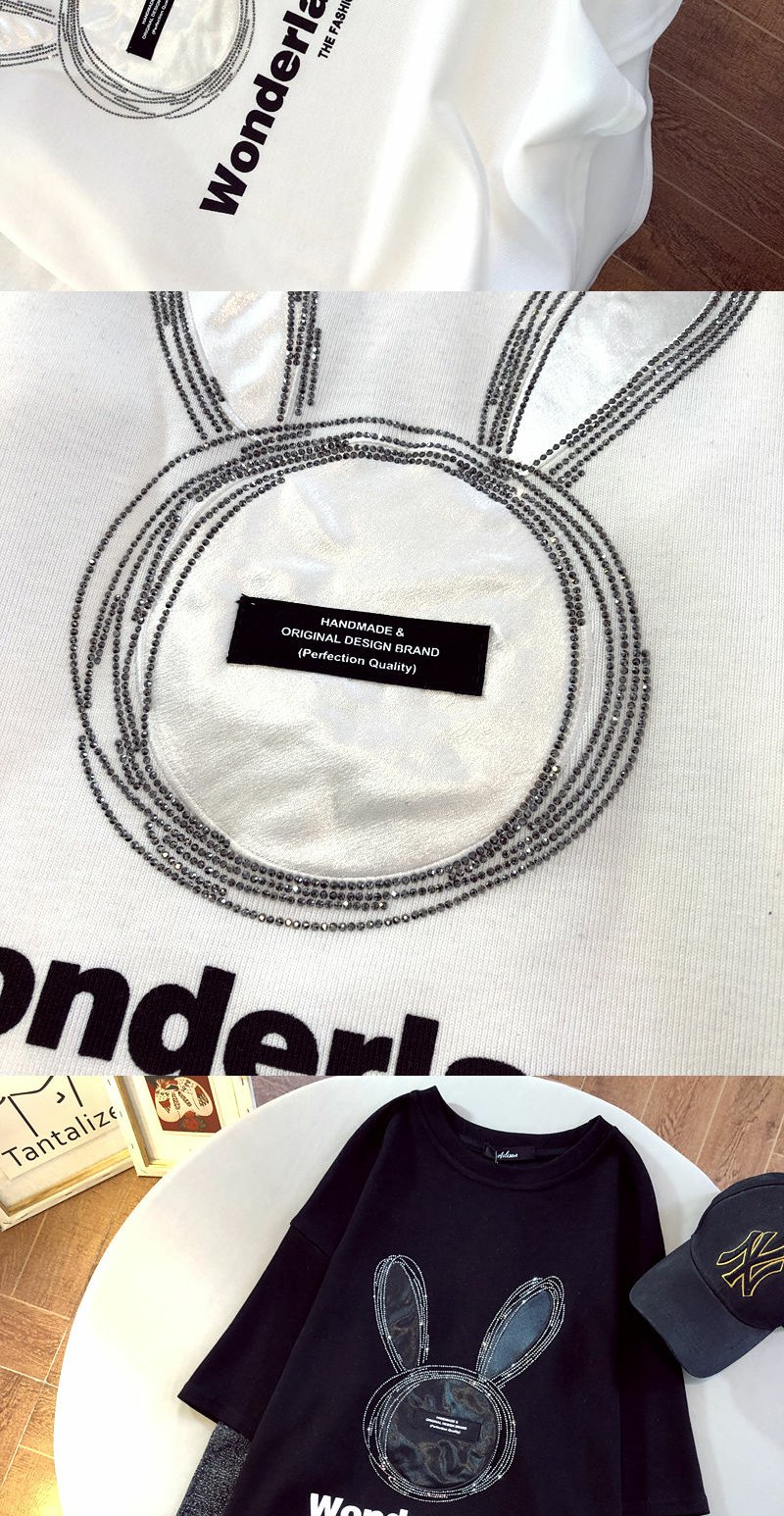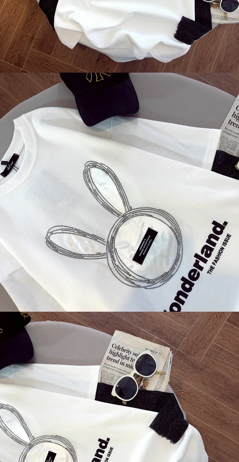 棉拼接烫钻兔子假两件长袖T恤衫2022早春新款宽松男女上衣