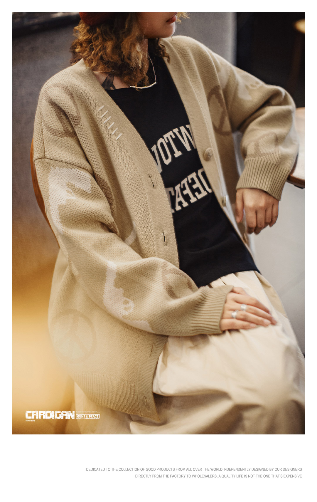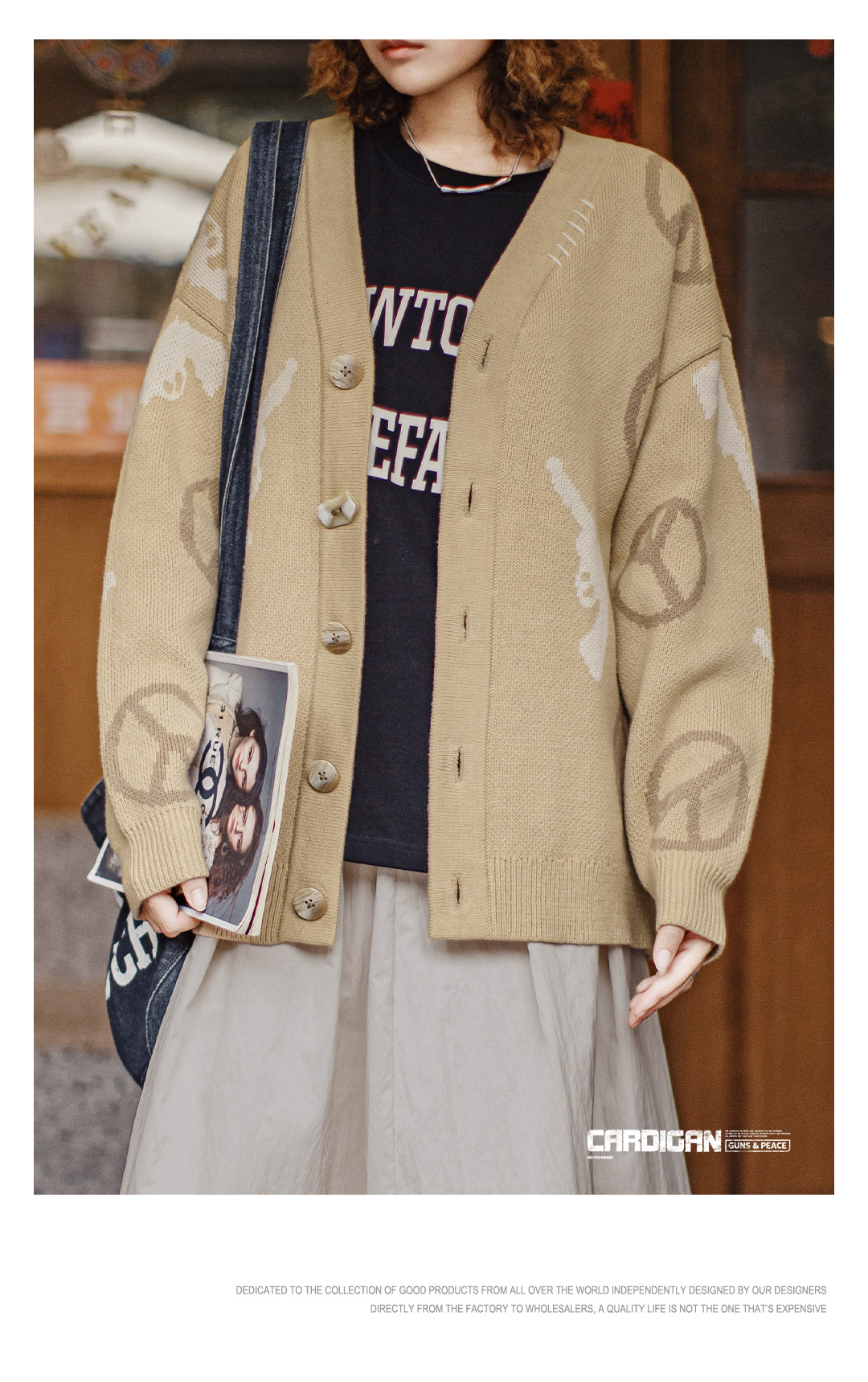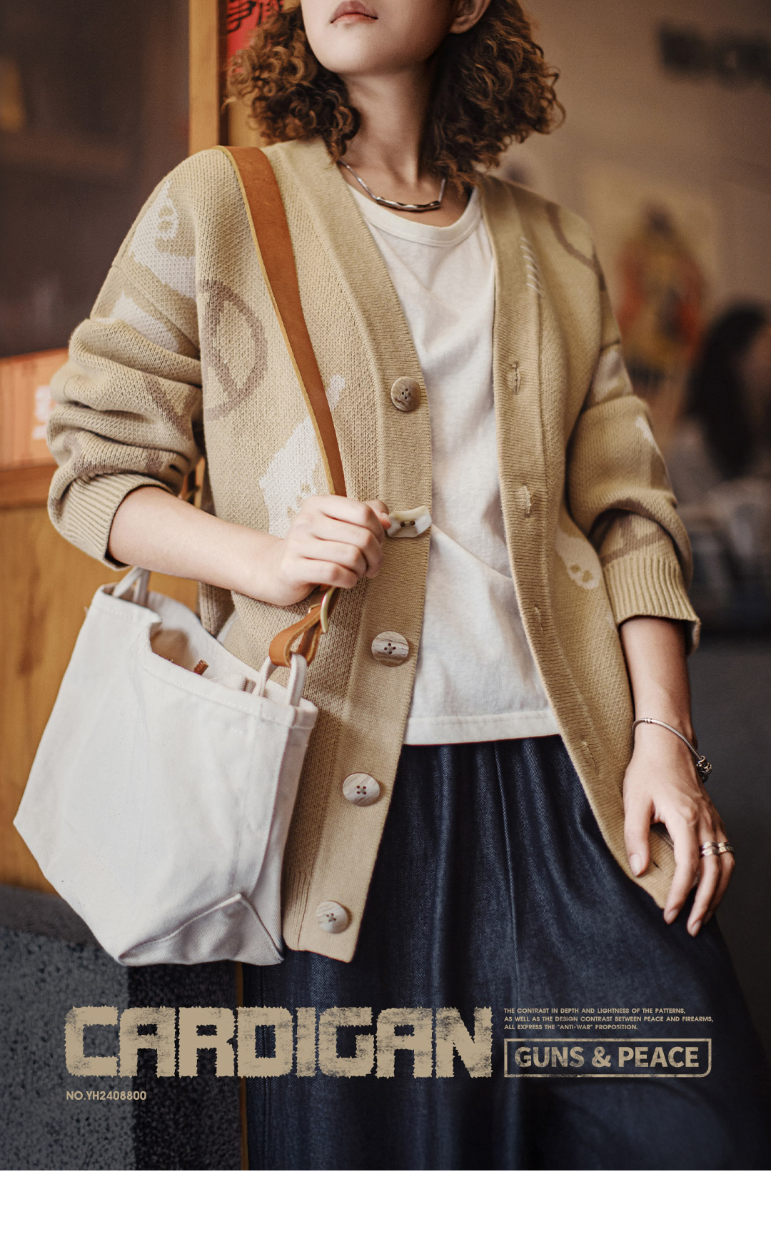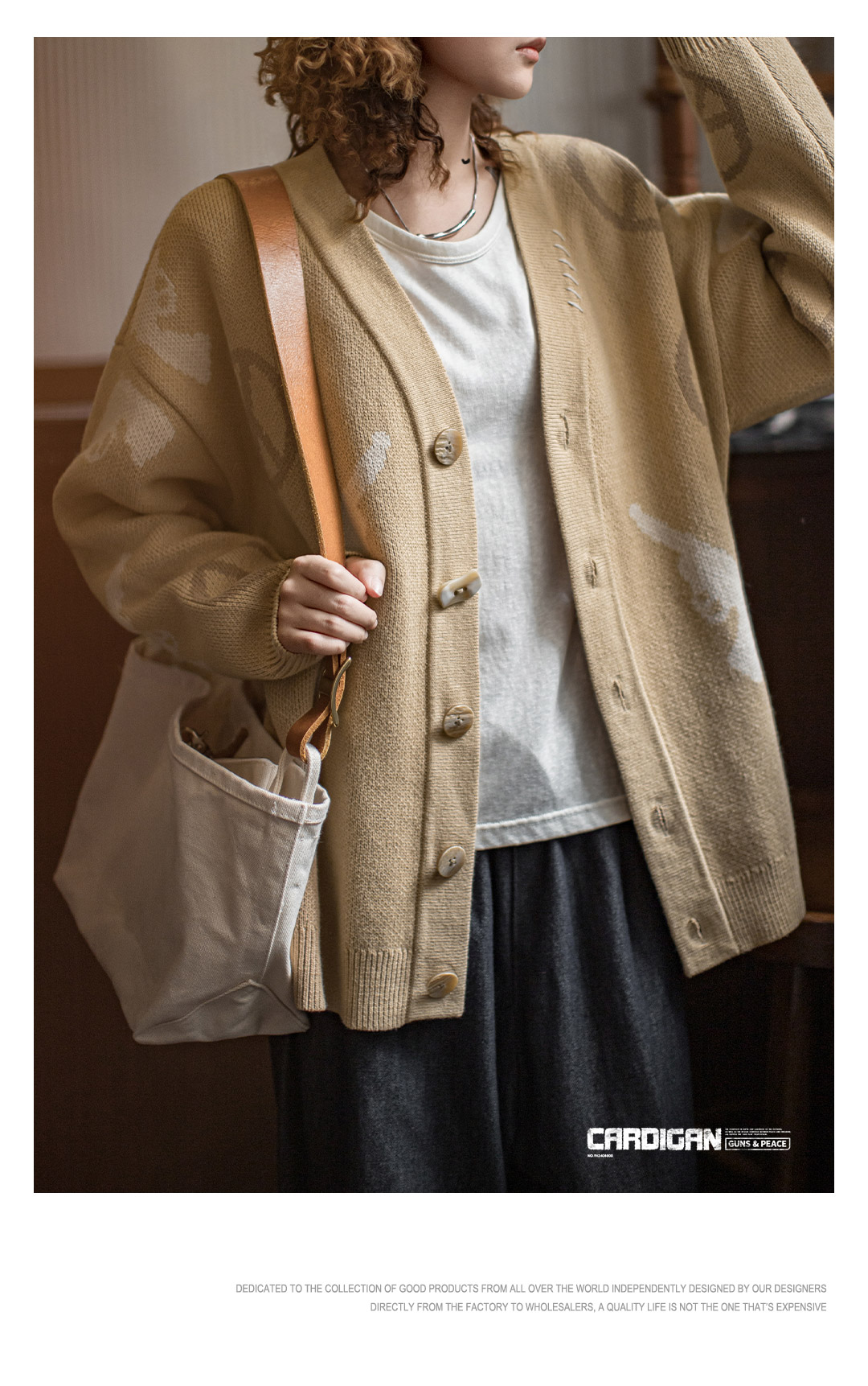 马登复古卡其色大V领宽松外穿毛衣提花针织开衫外套上衣女士秋冬