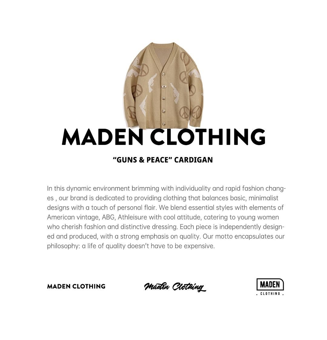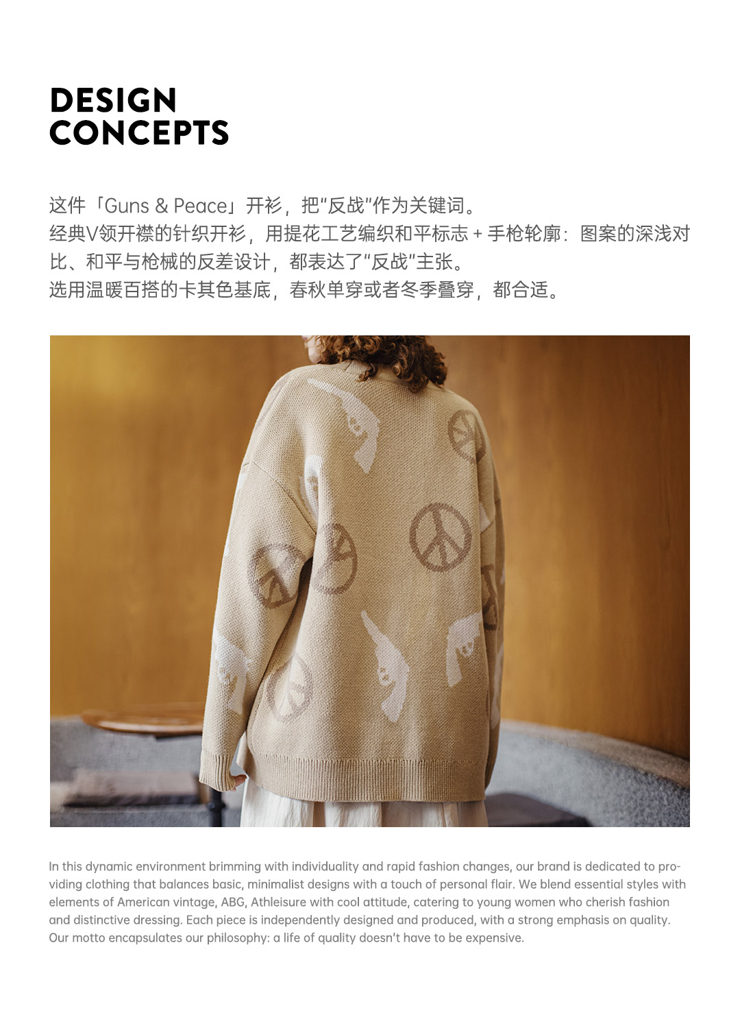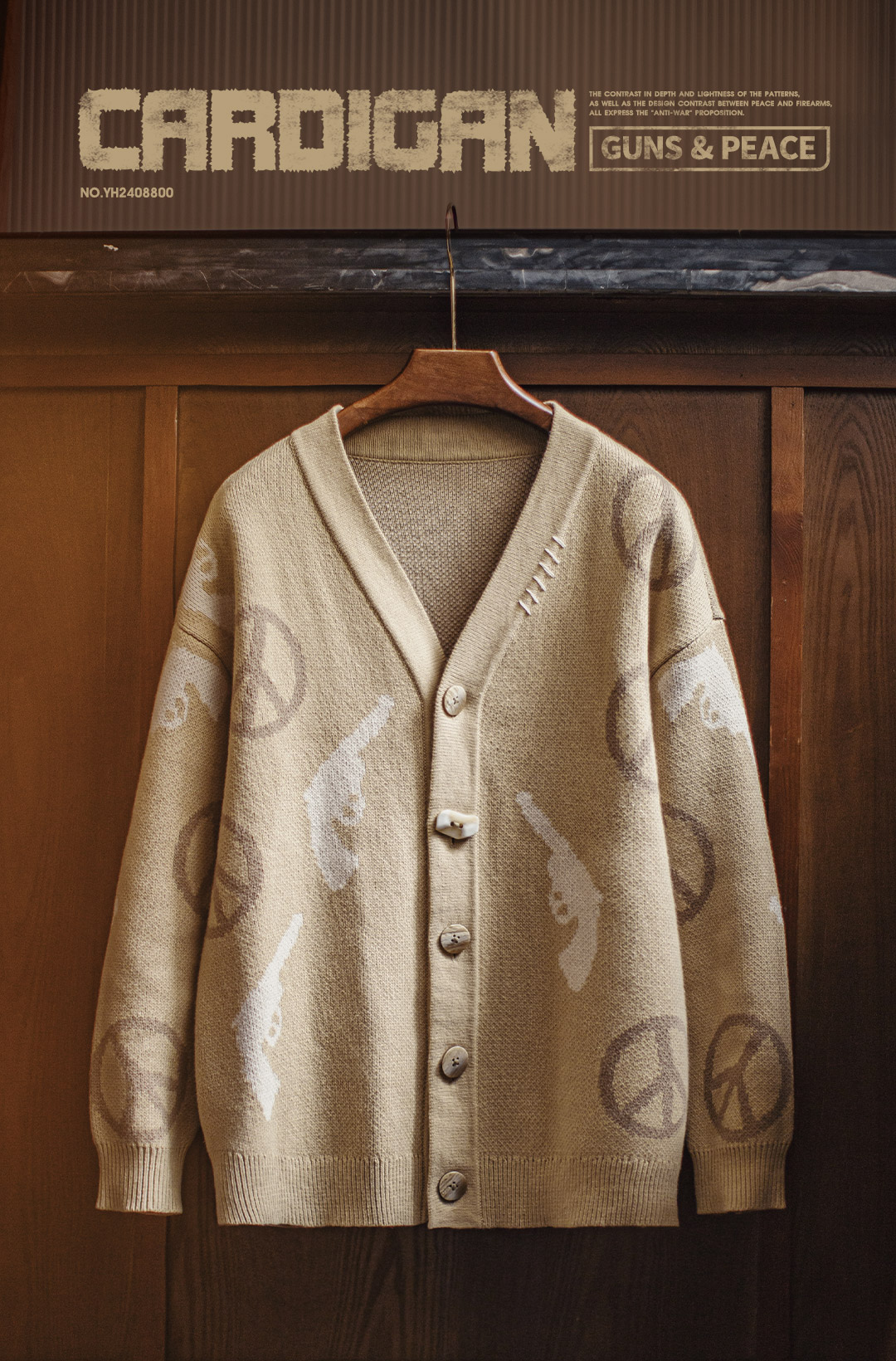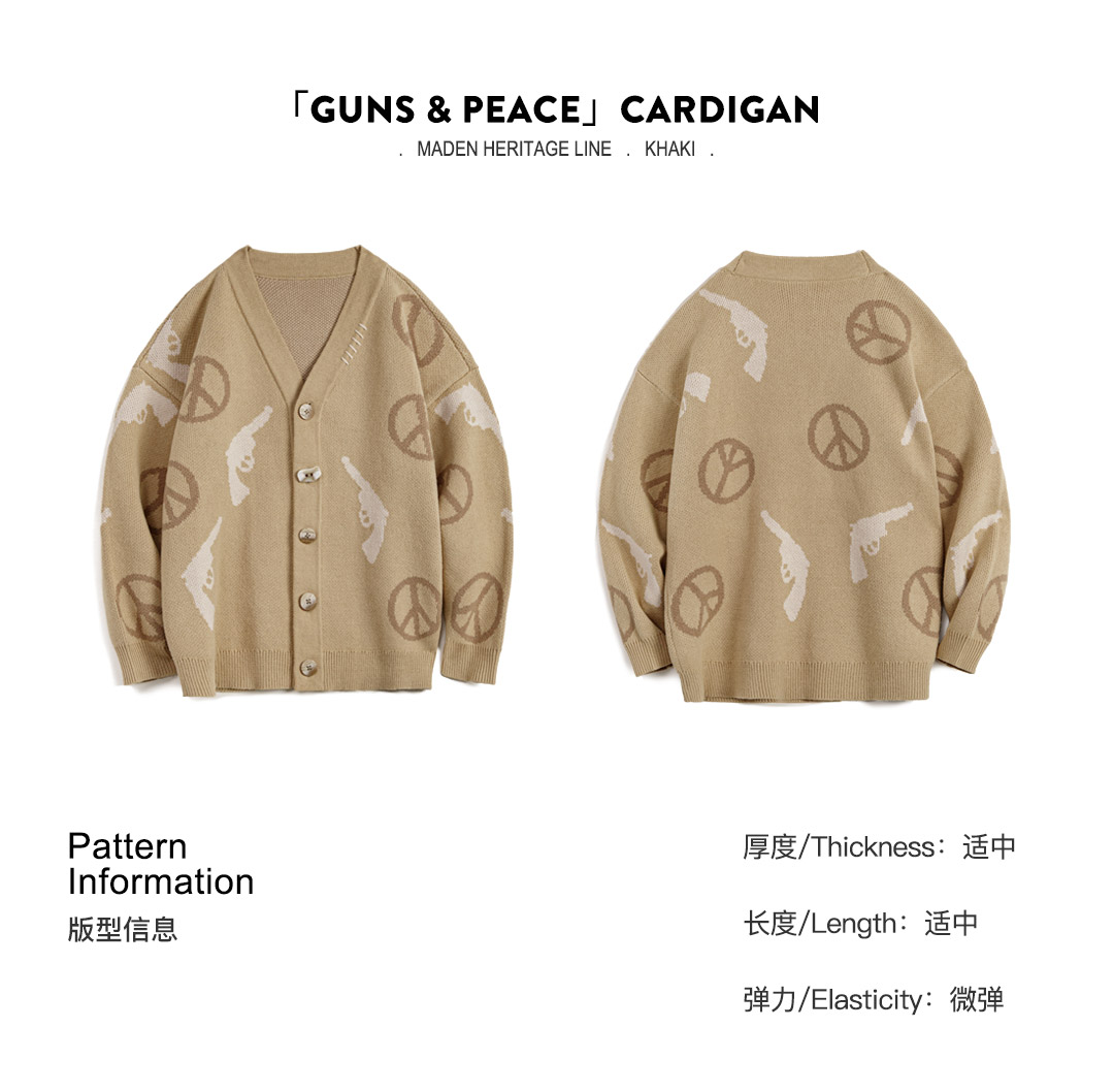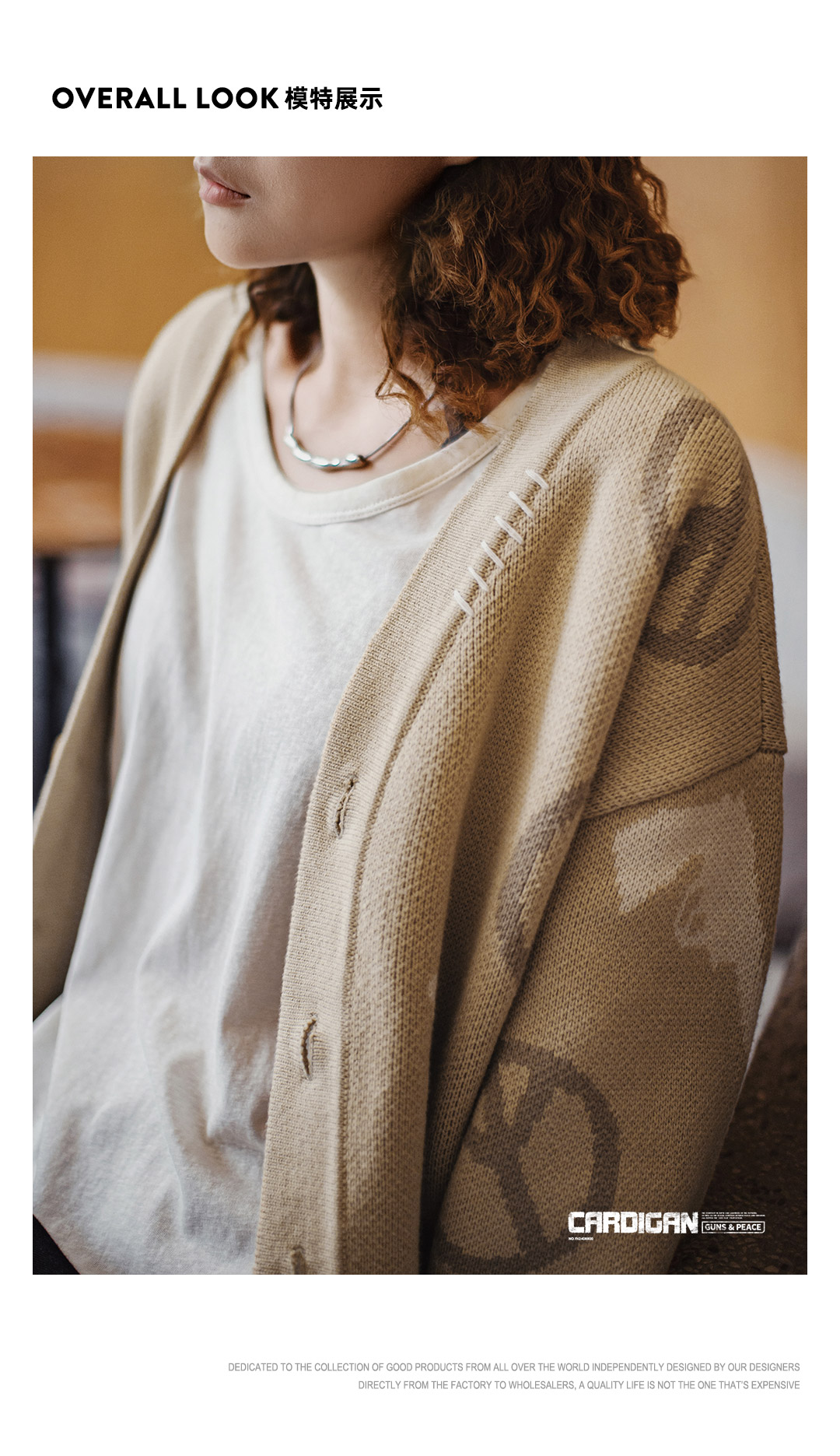 马登复古卡其色大V领宽松外穿毛衣提花针织开衫外套上衣女士秋冬