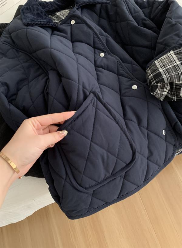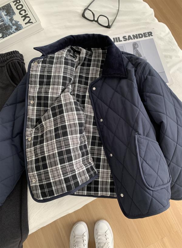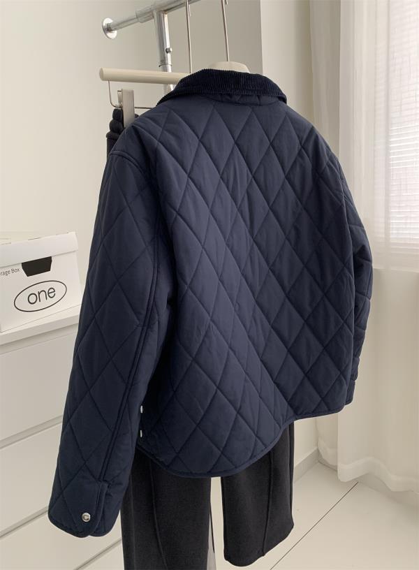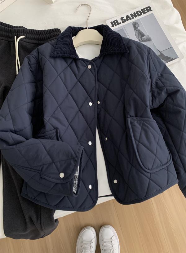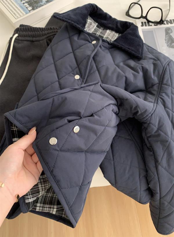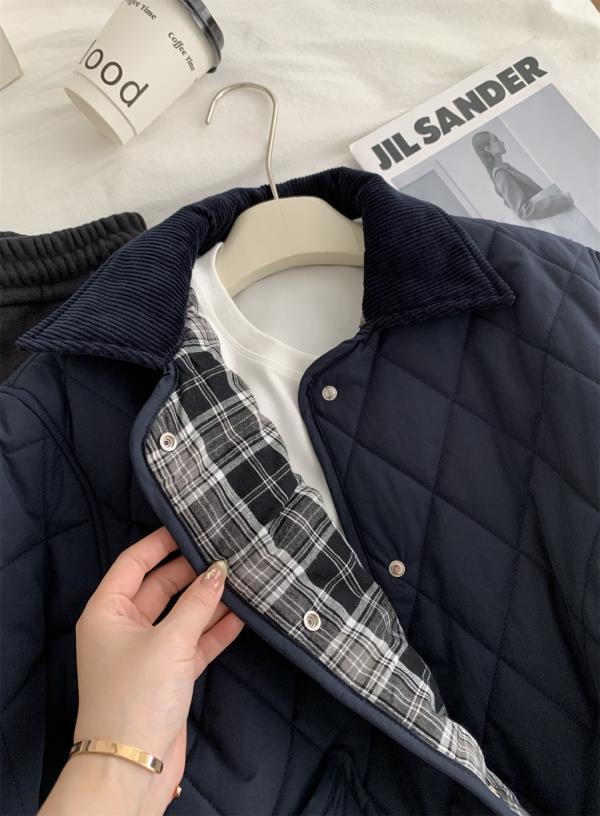 复古藏青色!2025翻领棉服外套女通勤百搭显白秋冬保暖菱格夹棉上衣!
