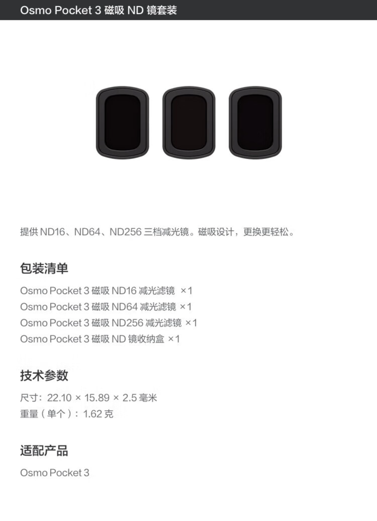 大疆 DJI Osmo Pocket 3 磁吸 ND 镜套装 Osmo Pocket 3 配件