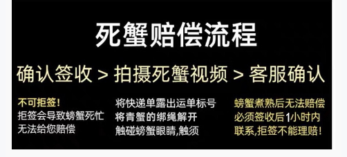 3、若快递员送达时因个人原因(例如:地址错误、关机、停机、或者家中暂时无人签收等)导致签收延误而使青蟹损坏的,不予赔付!