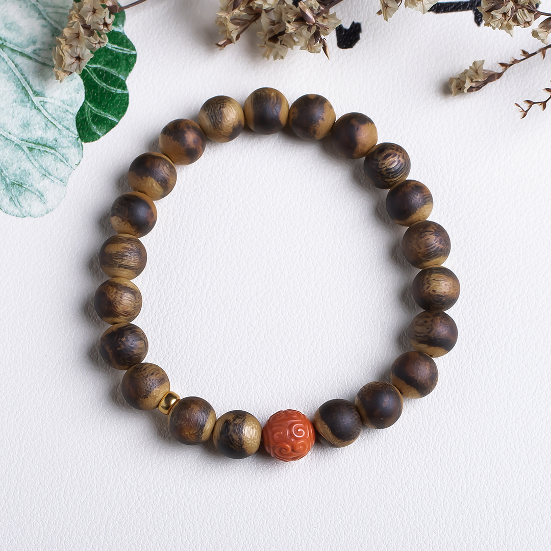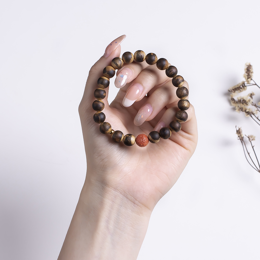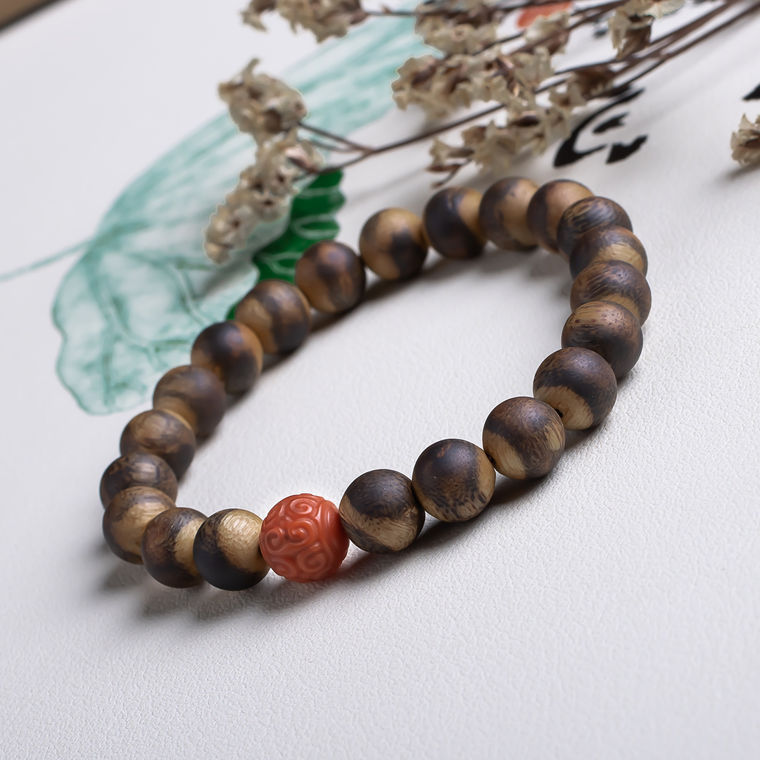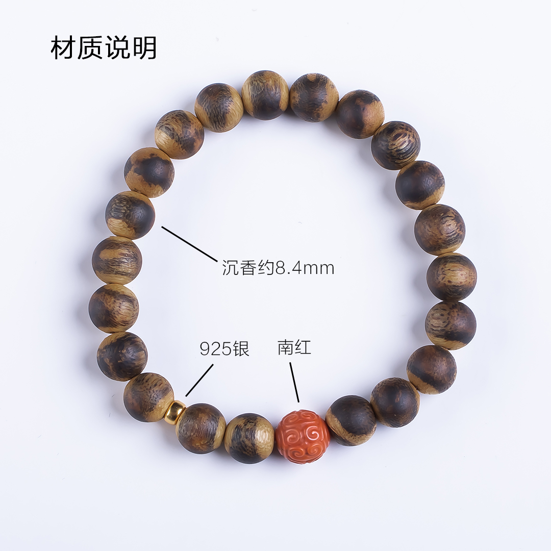 xy0539虎斑纹沉香+南红回纹珠手串,天然沉香约8.4mm,特色虎斑纹料子,原色原味,香味自然清甜,搭一颗满色肉南红回纹珠,素雅中带着特色魅力,吉祥纳福。