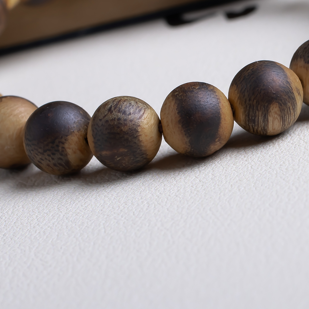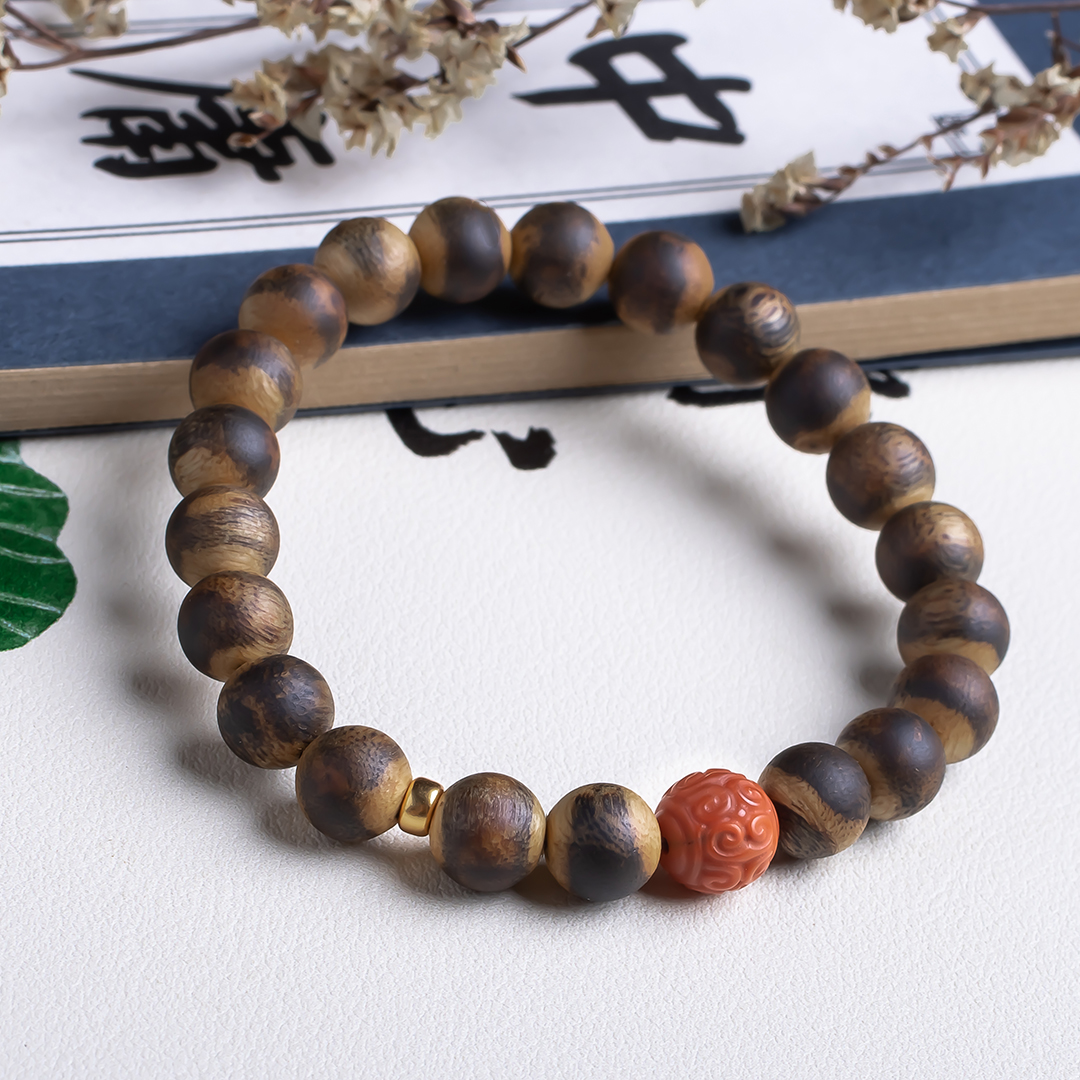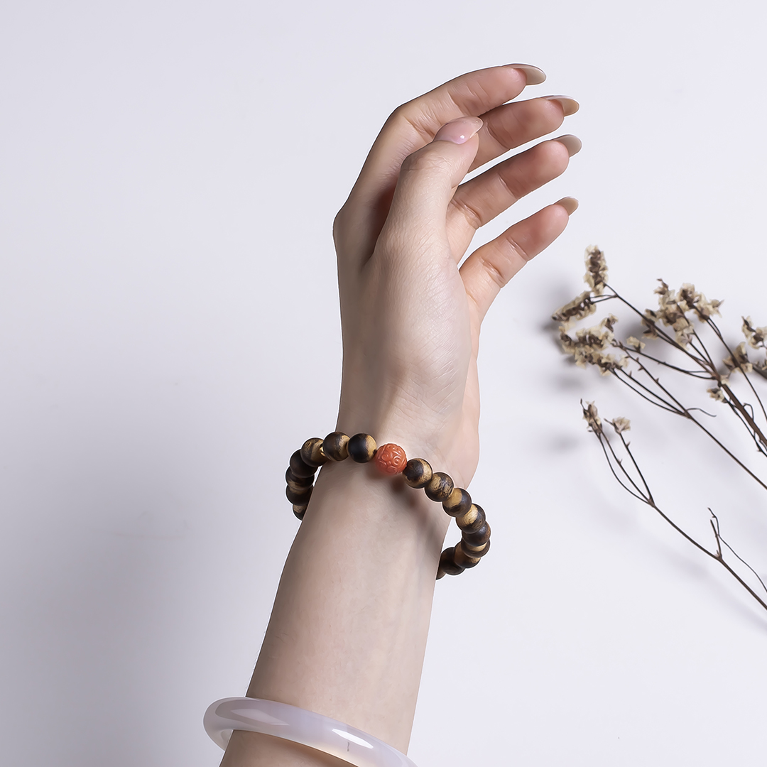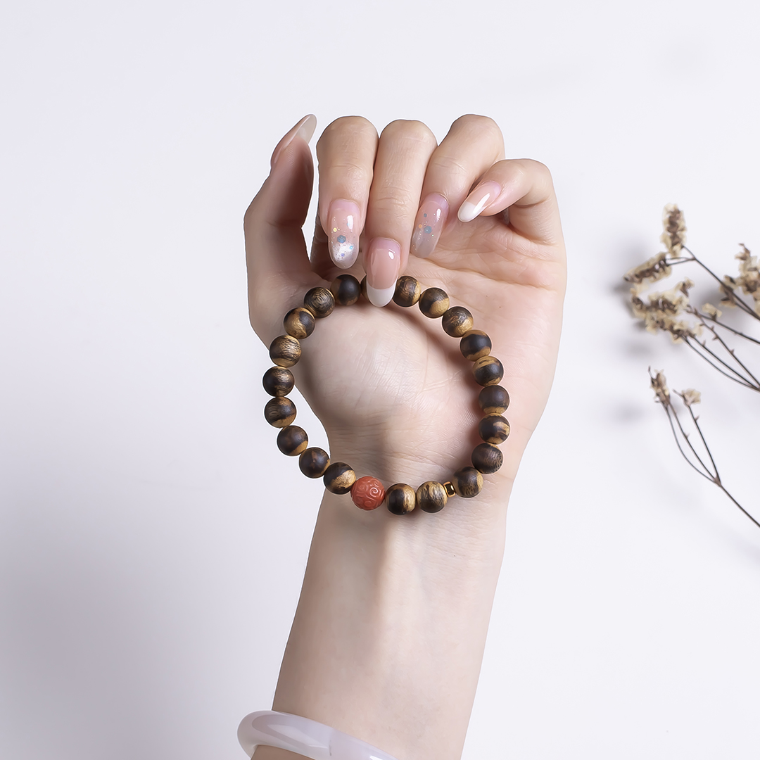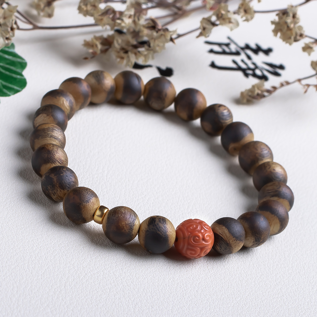 xy0539虎斑纹沉香+南红回纹珠手串,天然沉香约8.4mm,特色虎斑纹料子,原色原味,香味自然清甜,搭一颗满色肉南红回纹珠,素雅中带着特色魅力,吉祥纳福。